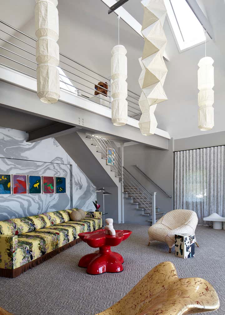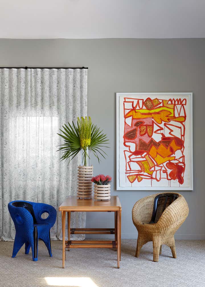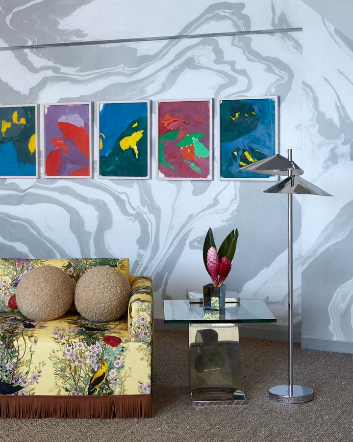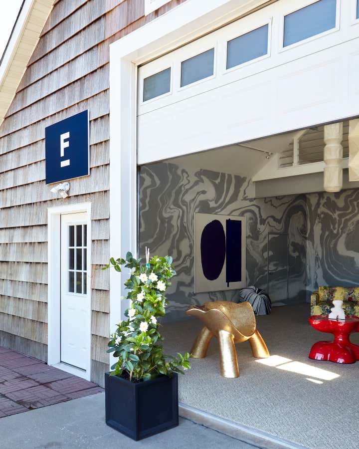 Exhibition feature annual summer shows as an experiment in artful living. The inaugural exhibition is a study in the duality of minimal versus maximal, while challenging the notion that a summer home must be white. Expanding on Elena Frampton’s modus operandi to explore new ways to engage with art, this tactile and sensual experience is far from a museum. Blurring the lines between art and design, Frampton has shaped the space through a radical wall treatment with layered art works, inventive sculptural furniture, and a lengthy and luxe floral and fringe Frampton-designed sofa.