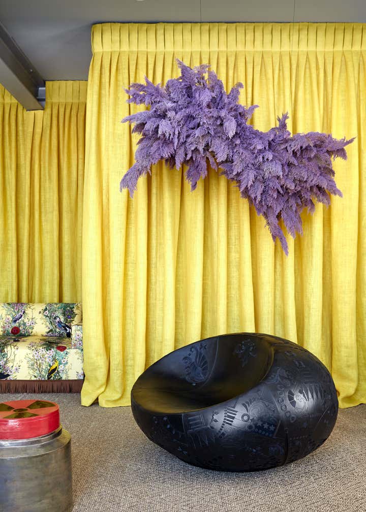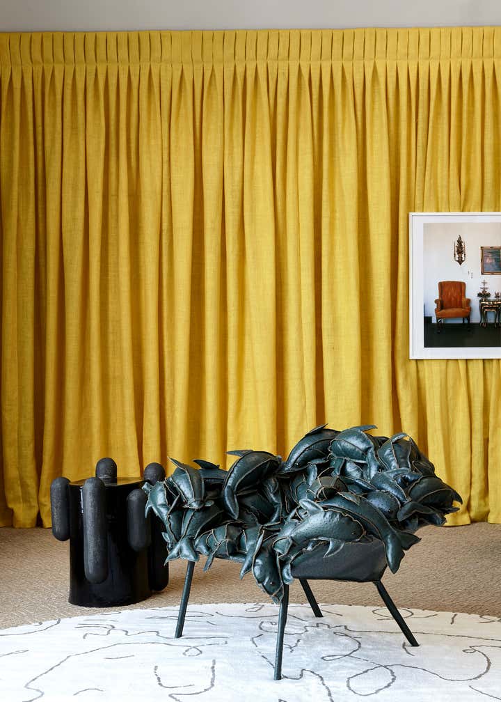 An omnipresence of curvilinear shapes complements the winding marigold curtain, and abounds in a selection of one-of-a-kind ceramics, and the dancerly, modernist circular area rug from Doris Leslie Blau – sourced in honor of the showroom’s late namesake, an industry titan unparalleled.