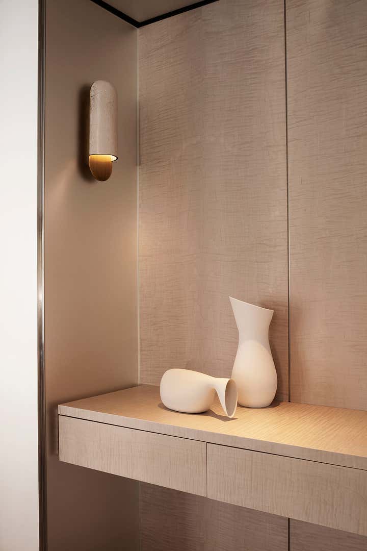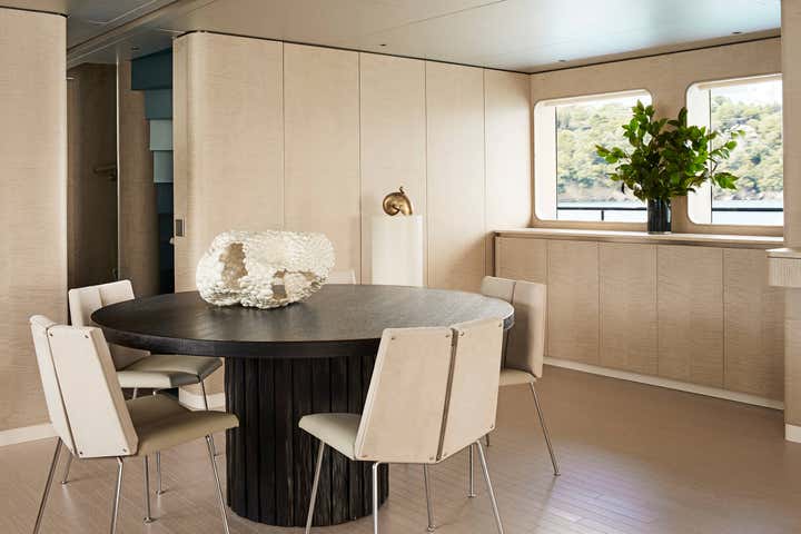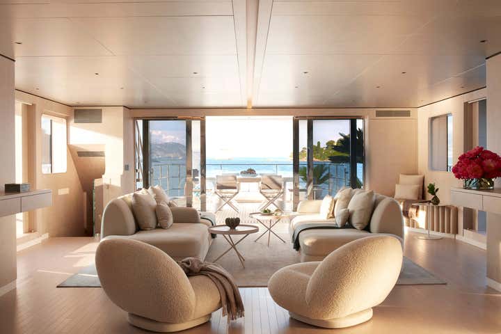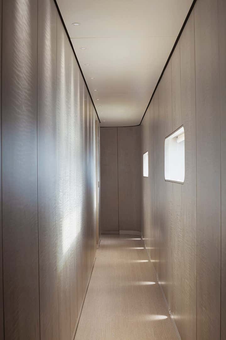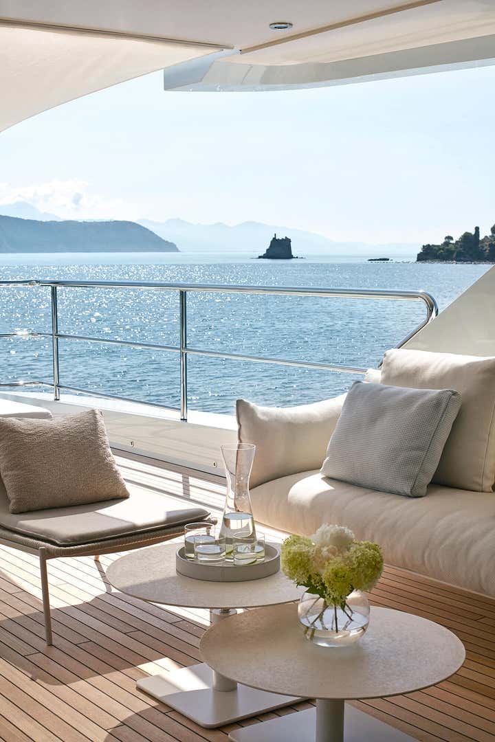 This large private yacht balances casual intimacy with polished elegance, and fluently modulates between the two. Its three decks are unified by a highly refined material palette: figured sycamore, brushed stainless steel, and satin mirror are accentuated throughout, to the effect of a concentrated, minimalist potency.