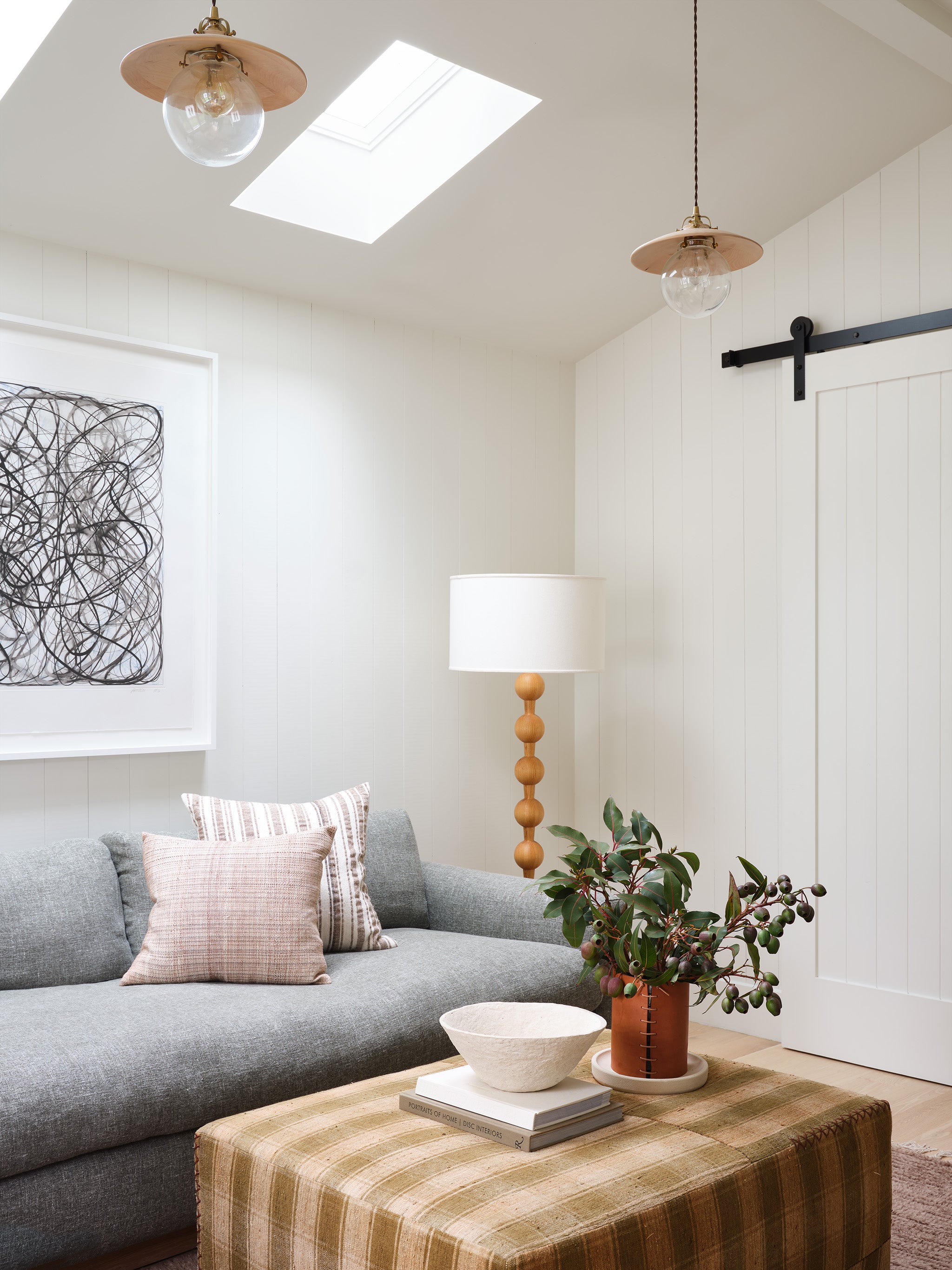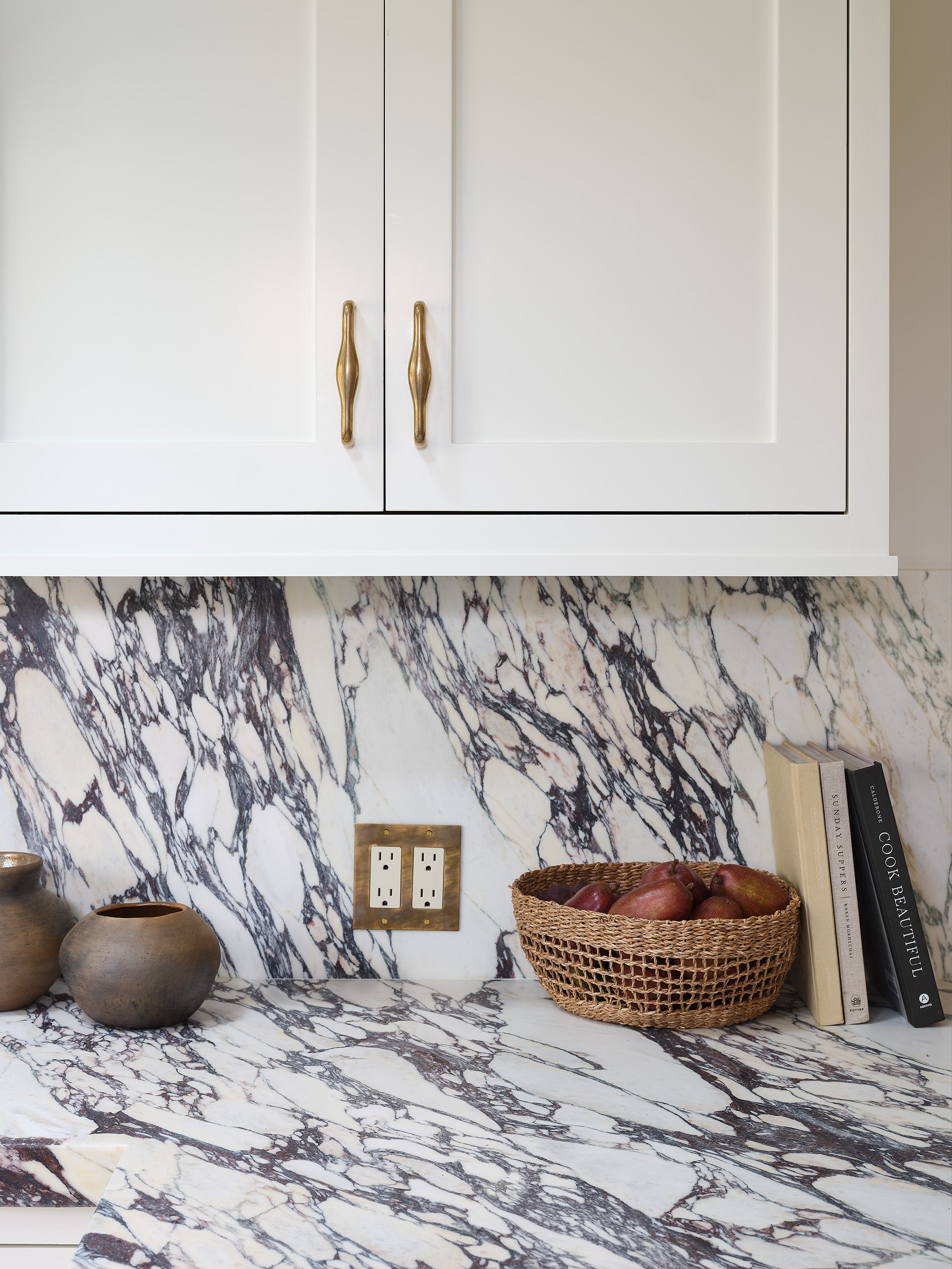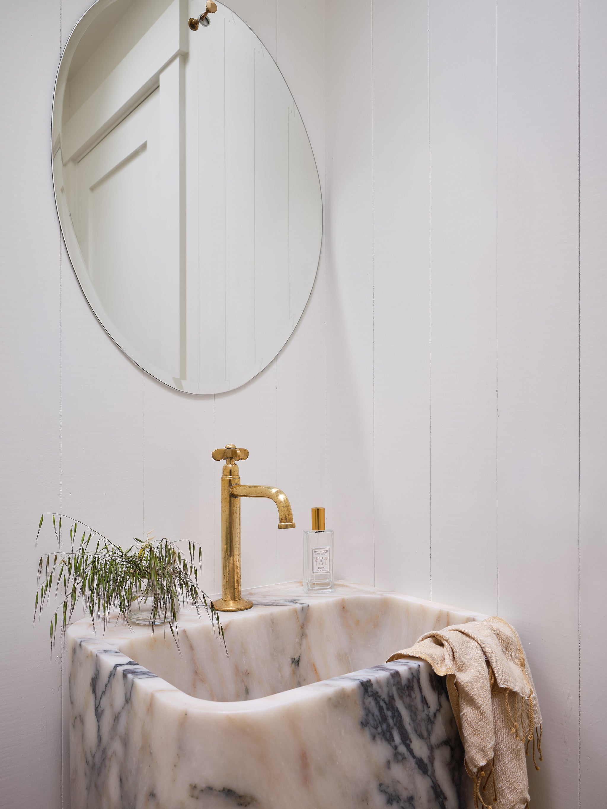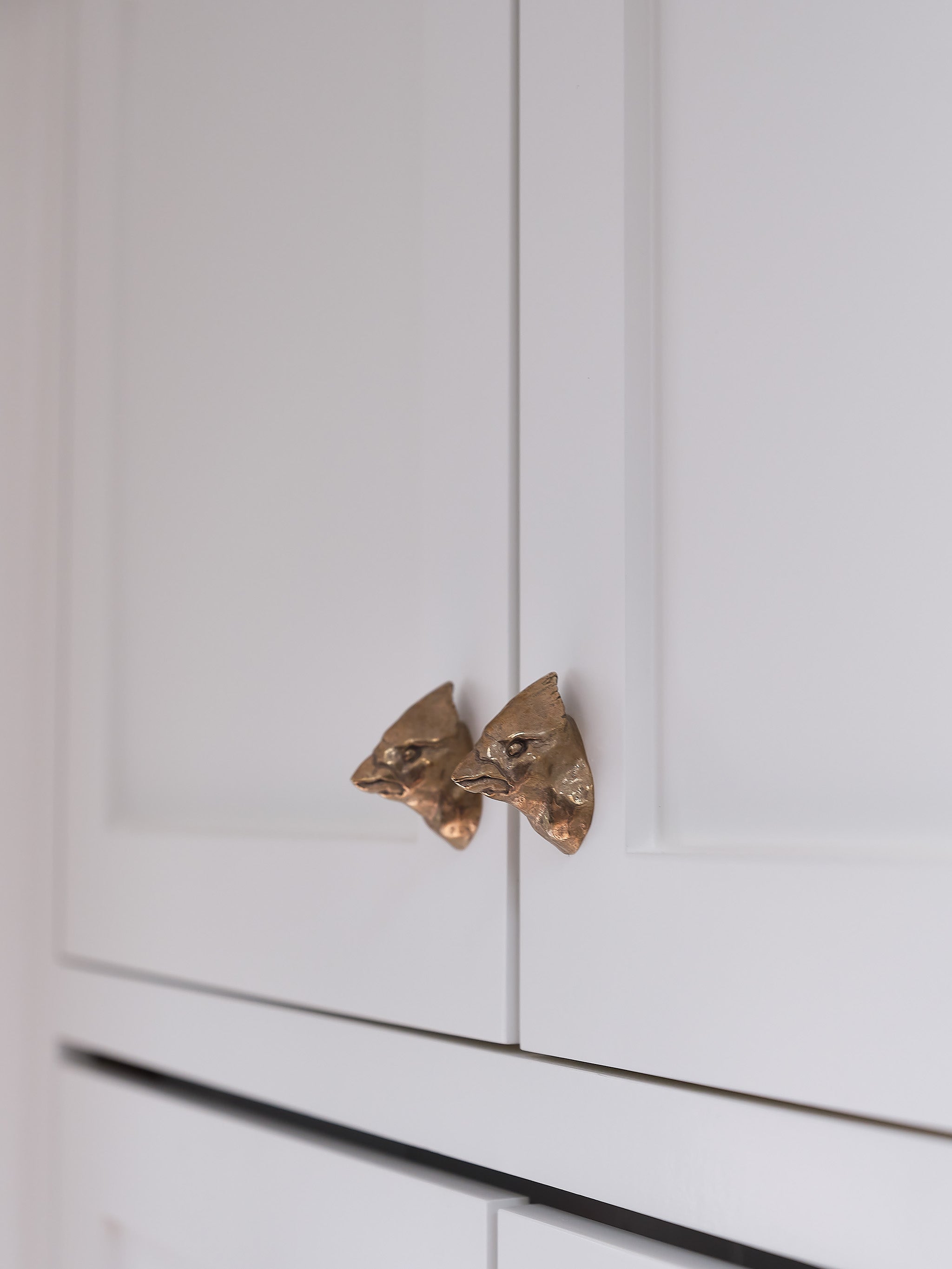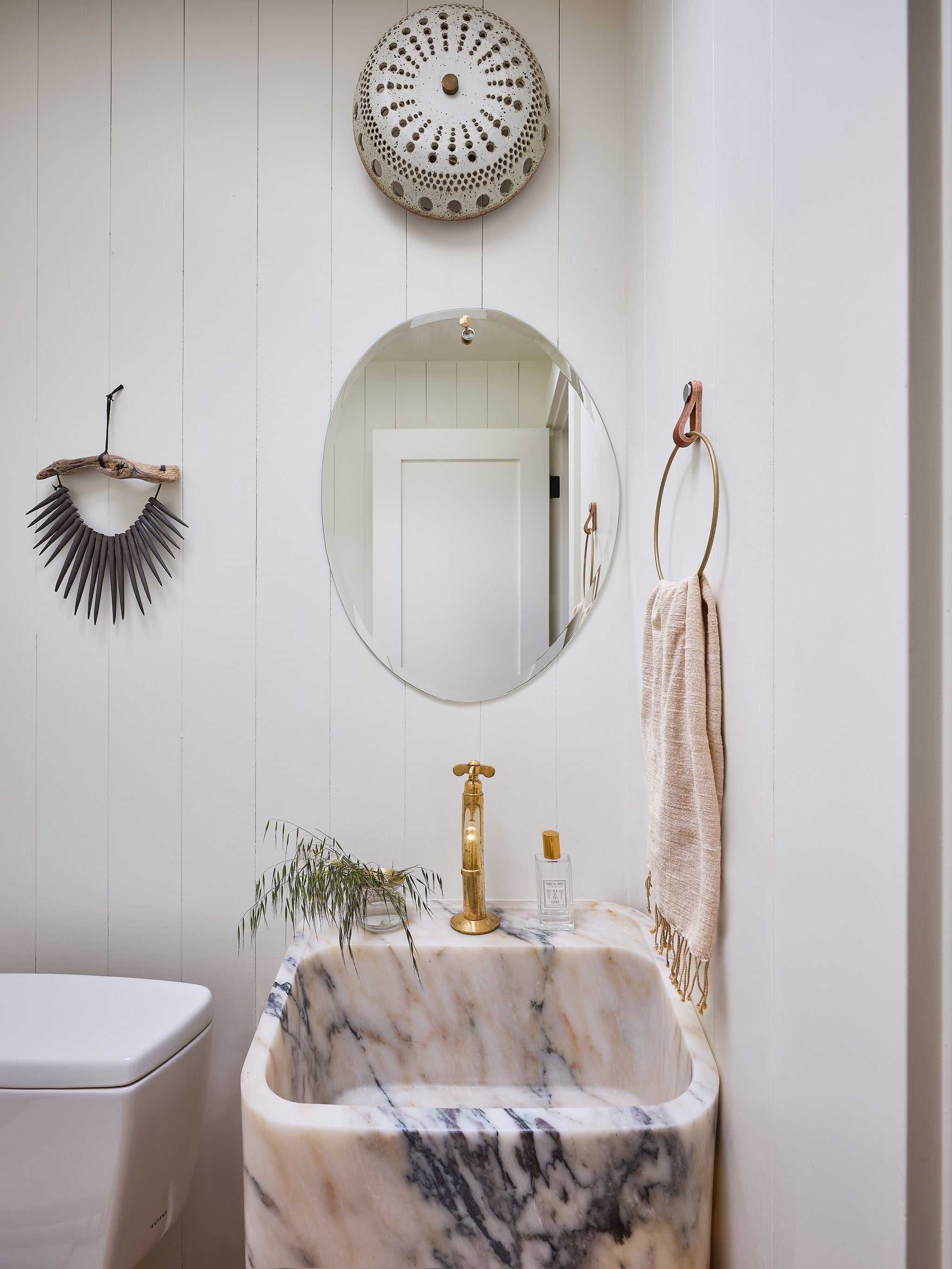 This home is very special to me, as it is my own. At the beginning of 2023 it was time for a partial remodel. We updated the formal lounge by removing the dated limestone tiles and plastering the fireplace. In the kitchen we delivered a new take on farmhouse eclectic with a bold-patterned marble and new, antique brass hardware. In the powder room we added a custom stone sink with Waterworks brass fittings and ceramic pieces from Heather Levine. In the living, a custom couch and soft earth colors to compliment a cozy, loungey feeling.