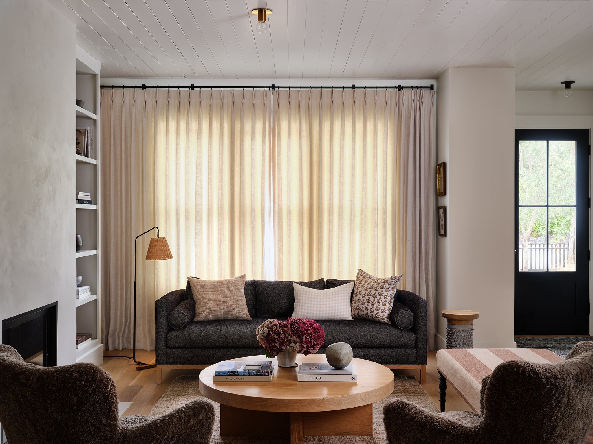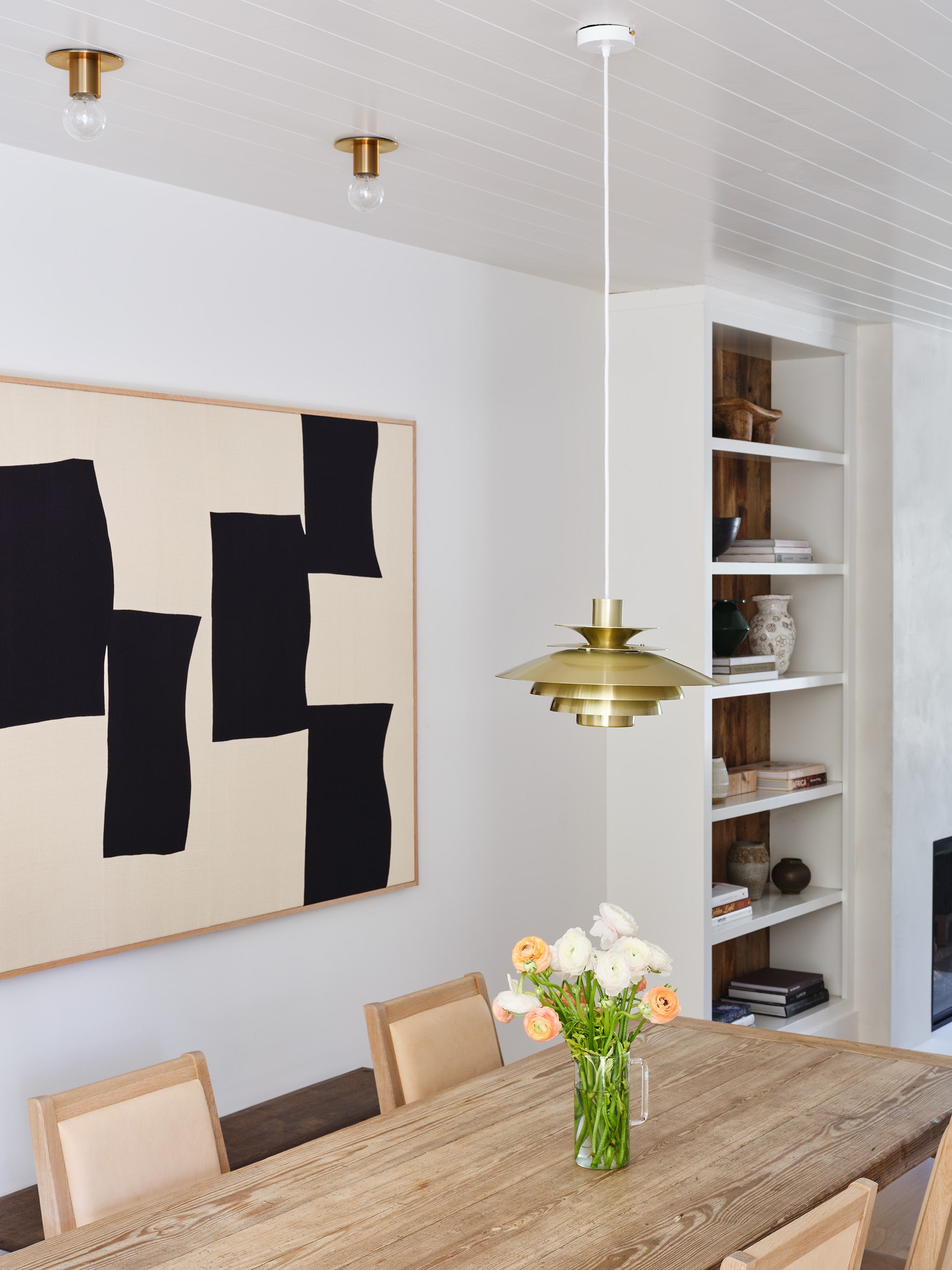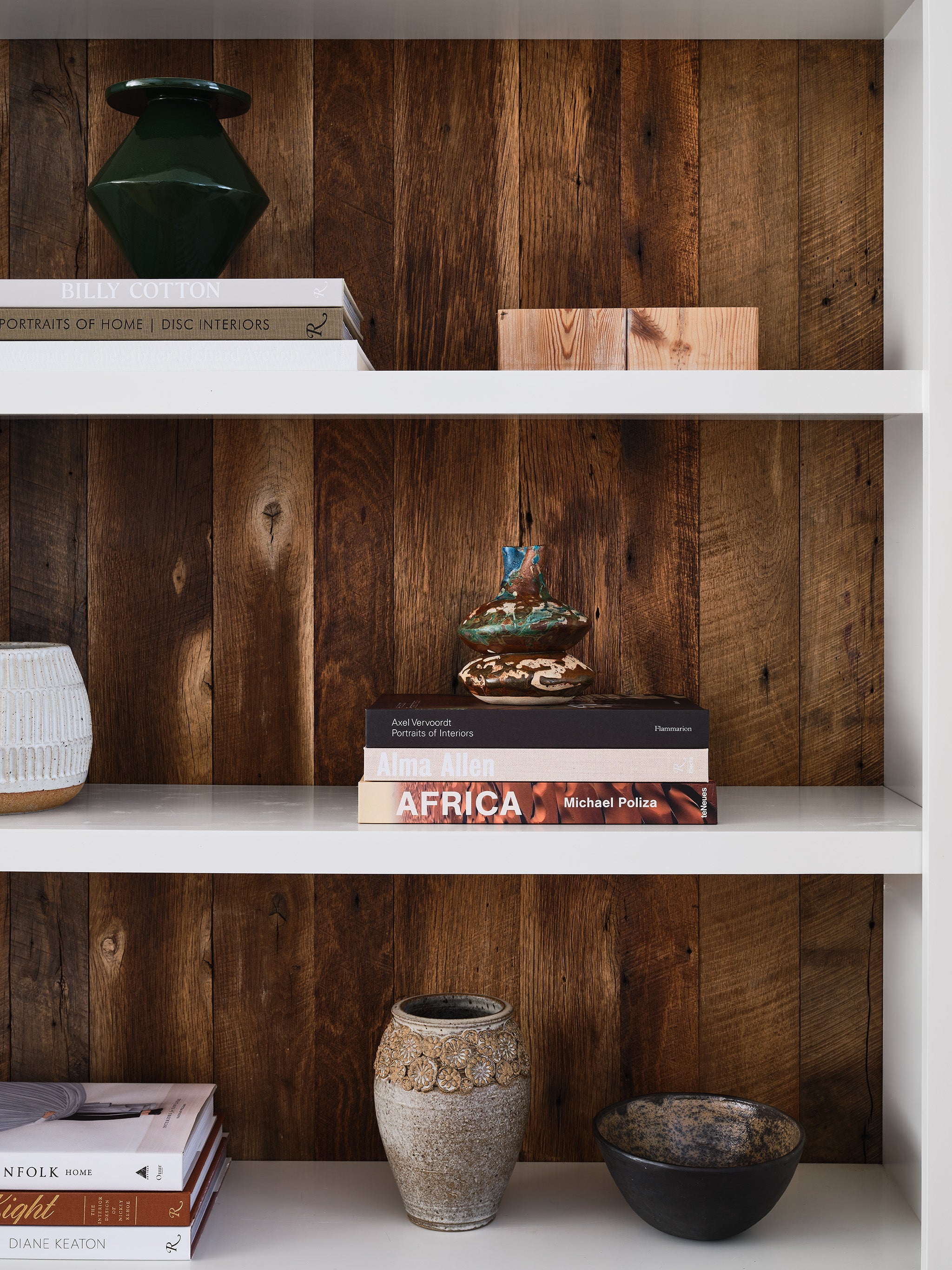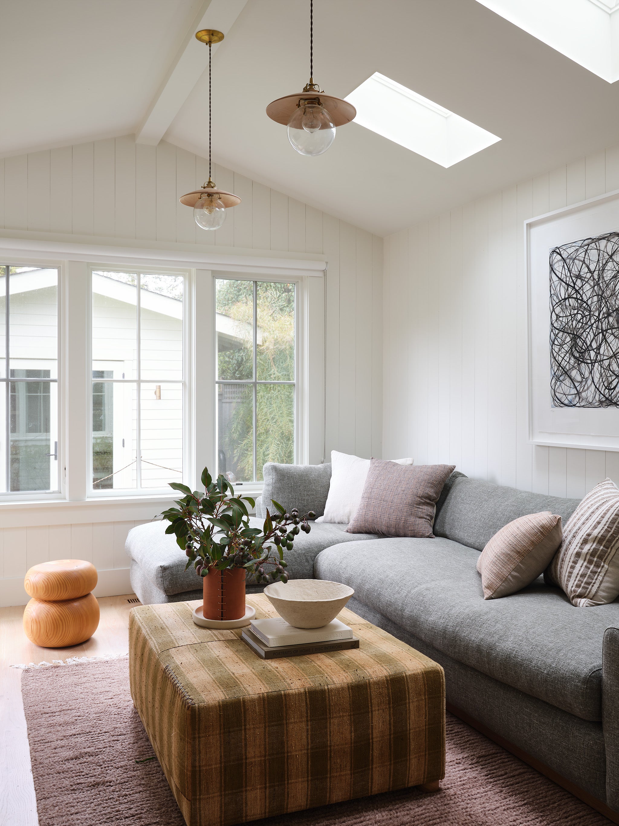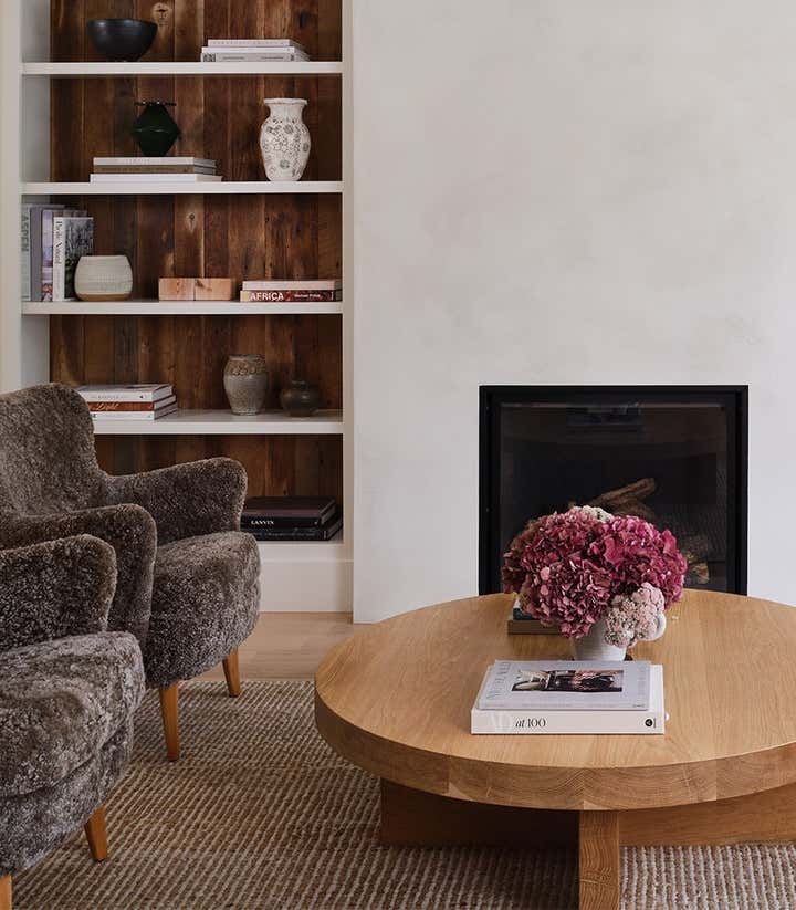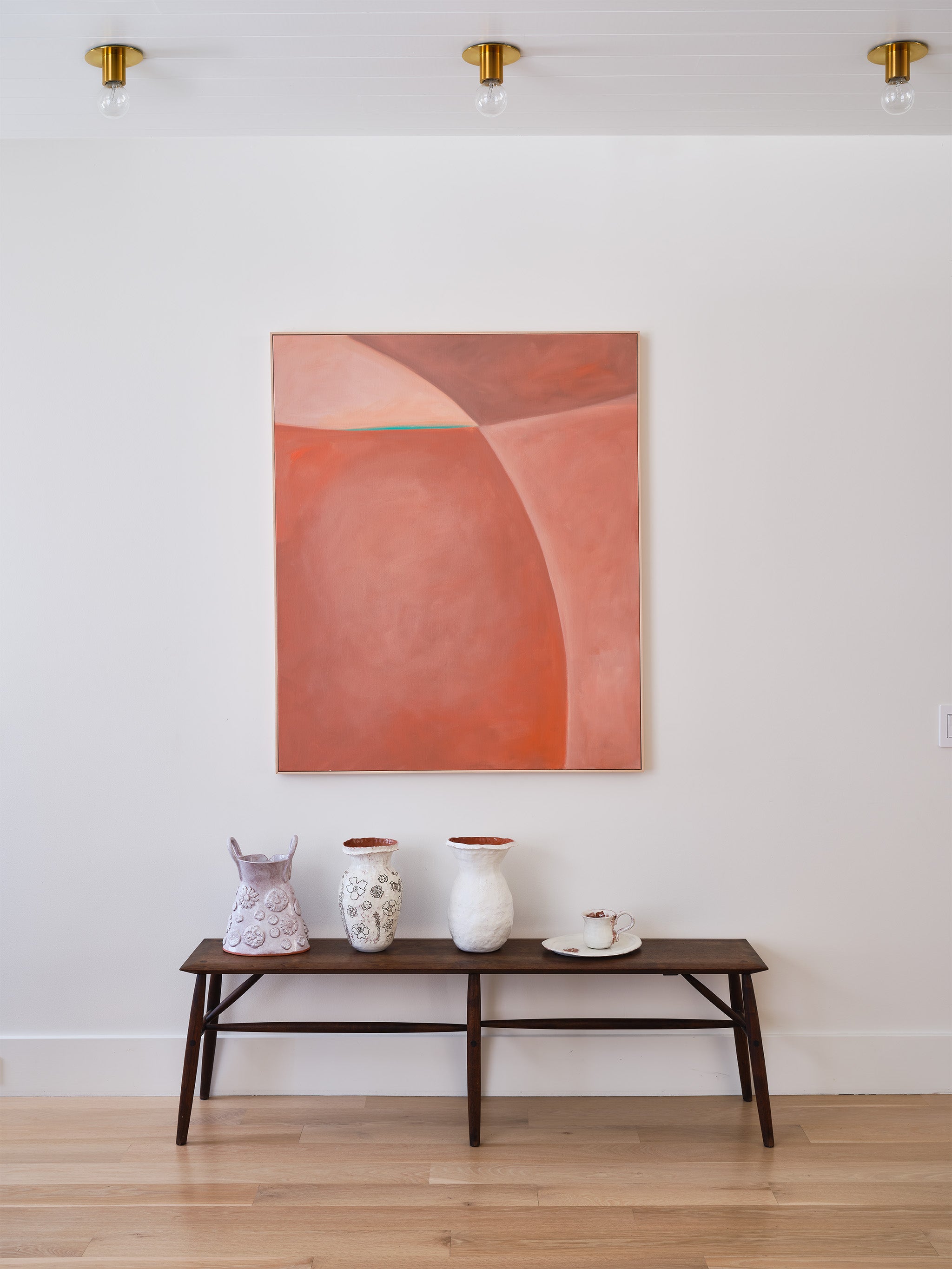 This home is very special to me, as it is my own. At the beginning of 2023 it was time for a partial remodel. We updated the formal lounge by removing the dated limestone tiles and plastering the fireplace. In the kitchen we delivered a new take on farmhouse eclectic with a bold-patterned marble and new, antique brass hardware. In the powder room we added a custom stone sink with Waterworks brass fittings and ceramic pieces from Heather Levine. In the living, a custom couch and soft earth colors to compliment a cozy, loungey feeling.