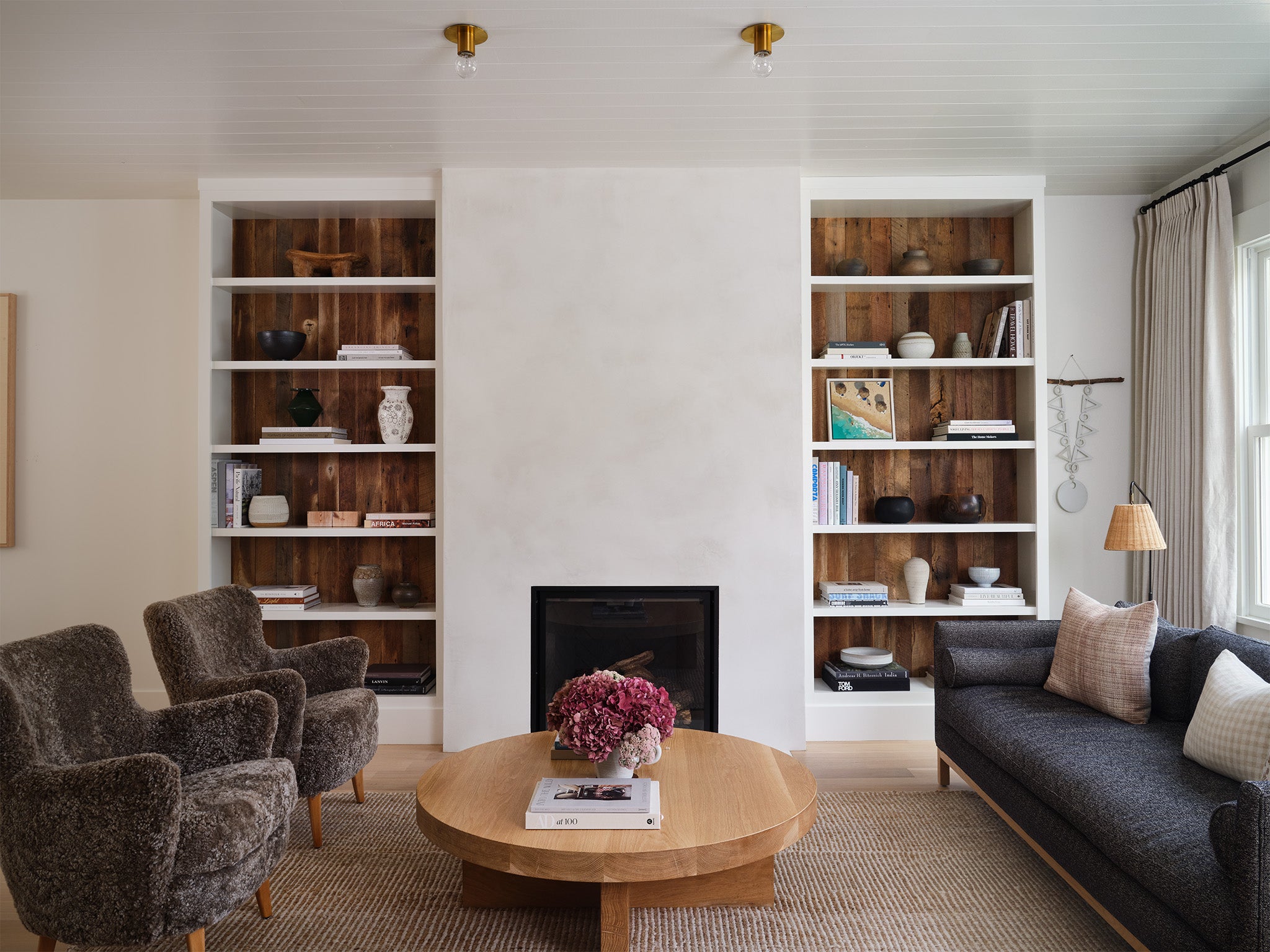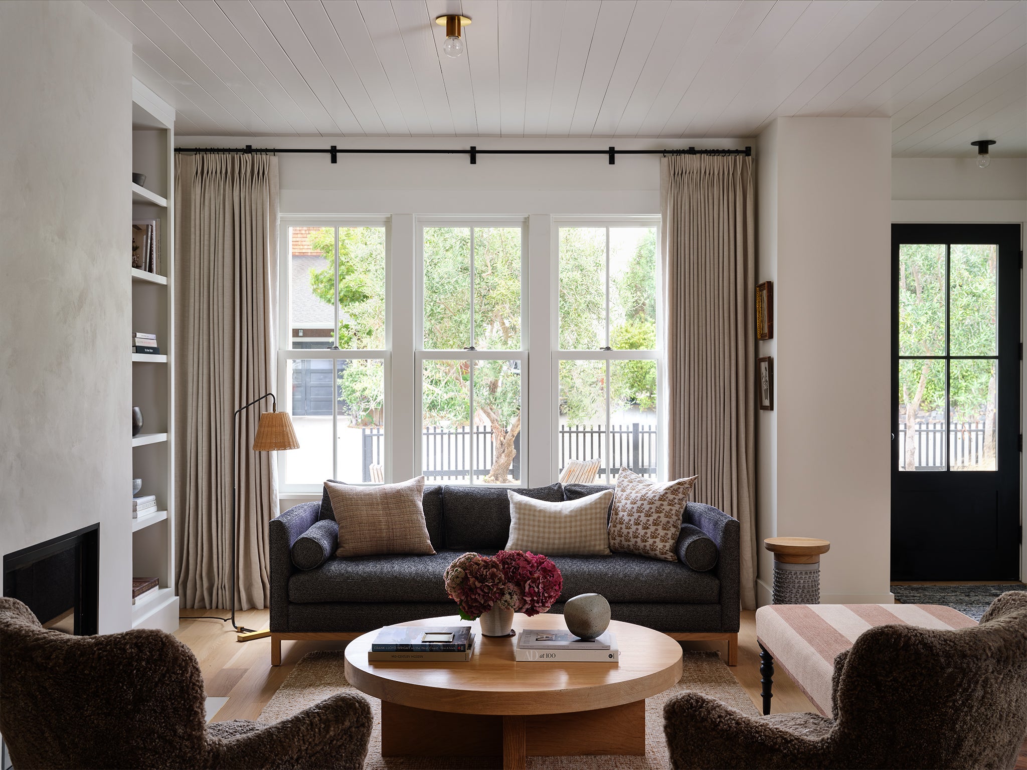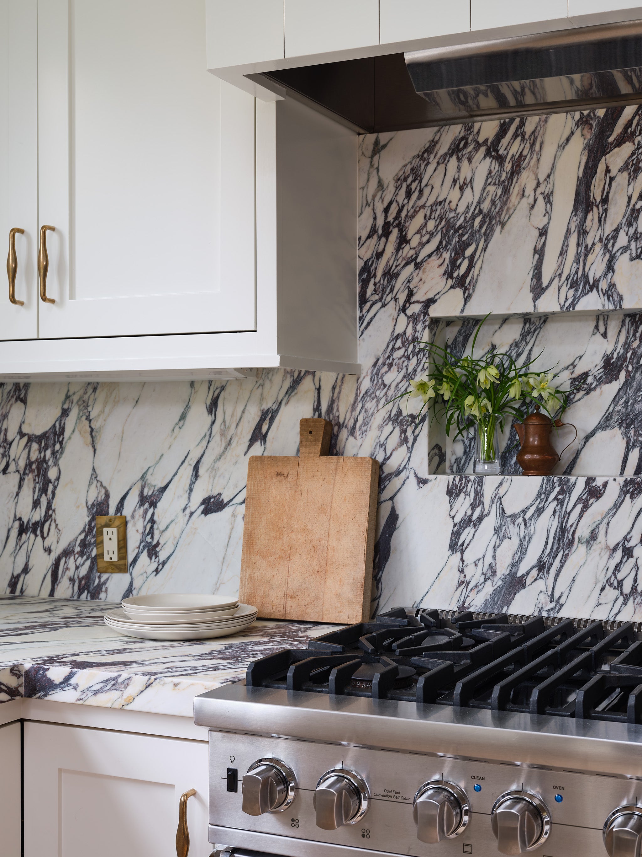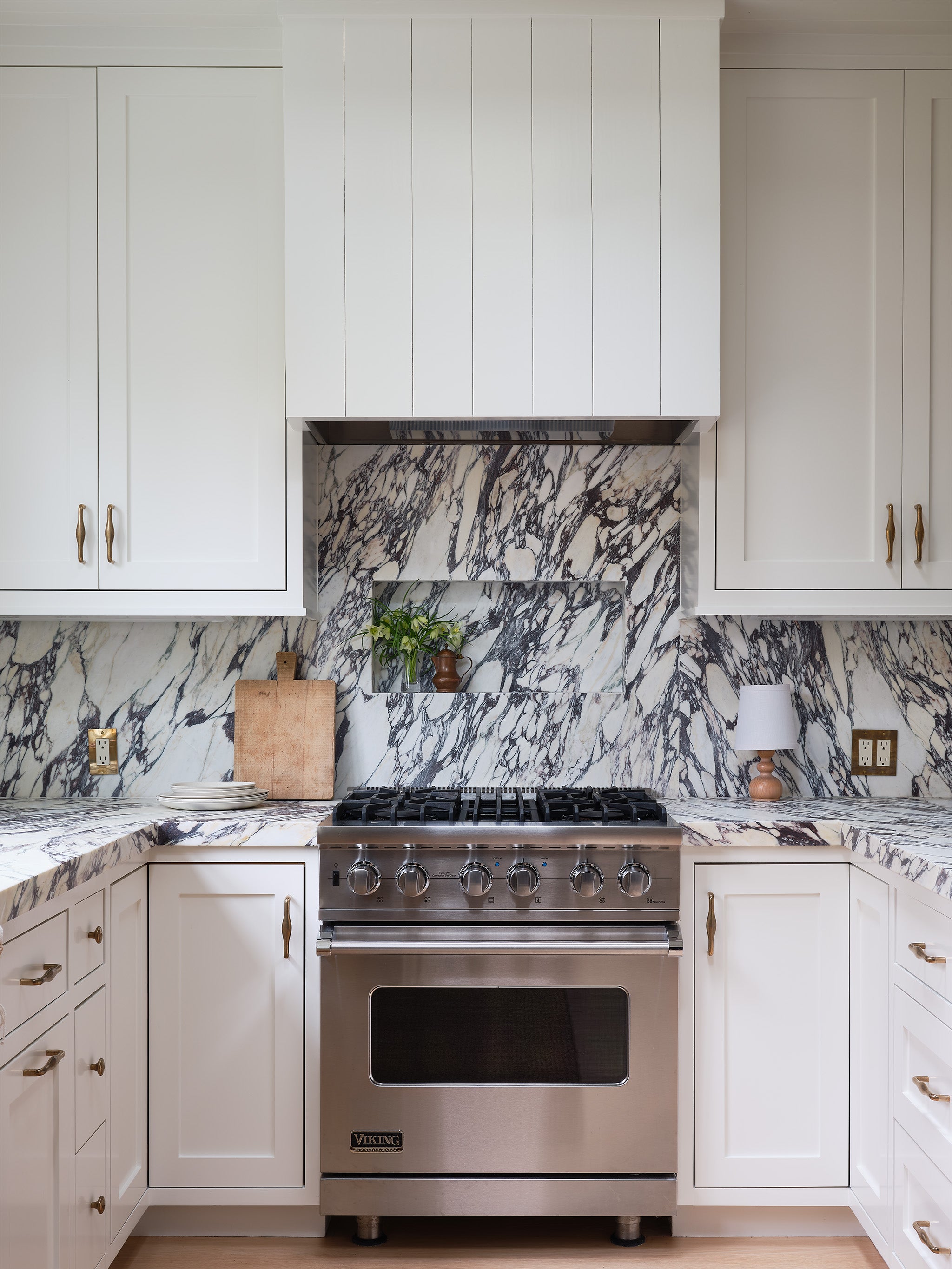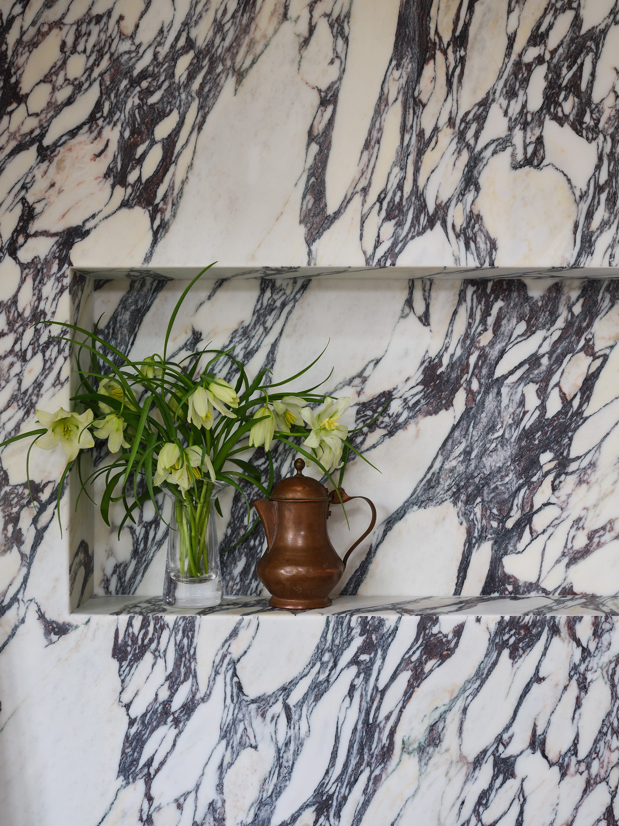 This home is very special to me, as it is my own. At the beginning of 2023 it was time for a partial remodel. We updated the formal lounge by removing the dated limestone tiles and plastering the fireplace. In the kitchen we delivered a new take on farmhouse eclectic with a bold-patterned marble and new, antique brass hardware. In the powder room we added a custom stone sink with Waterworks brass fittings and ceramic pieces from Heather Levine. In the living, a custom couch and soft earth colors to compliment a cozy, loungey feeling.