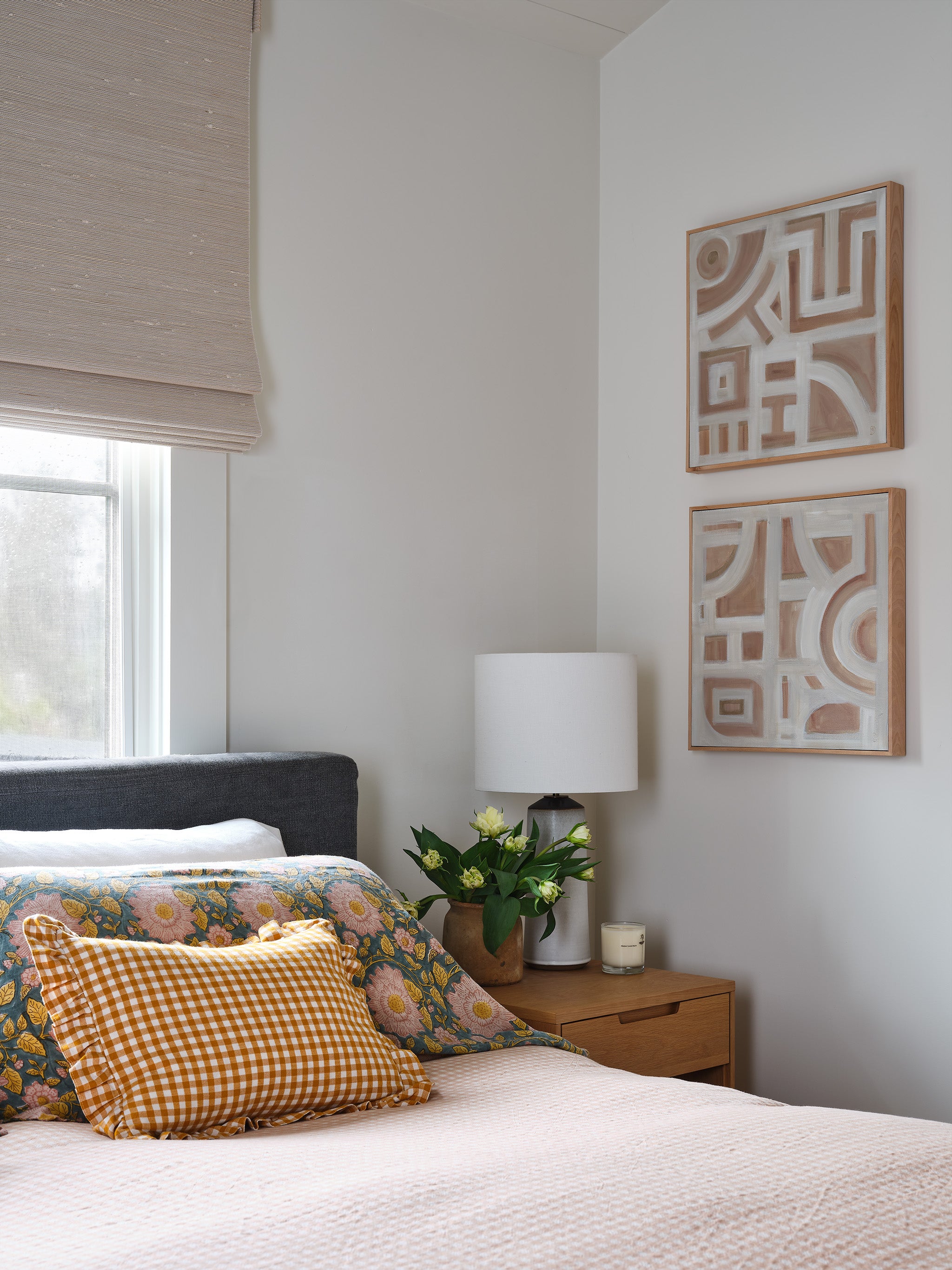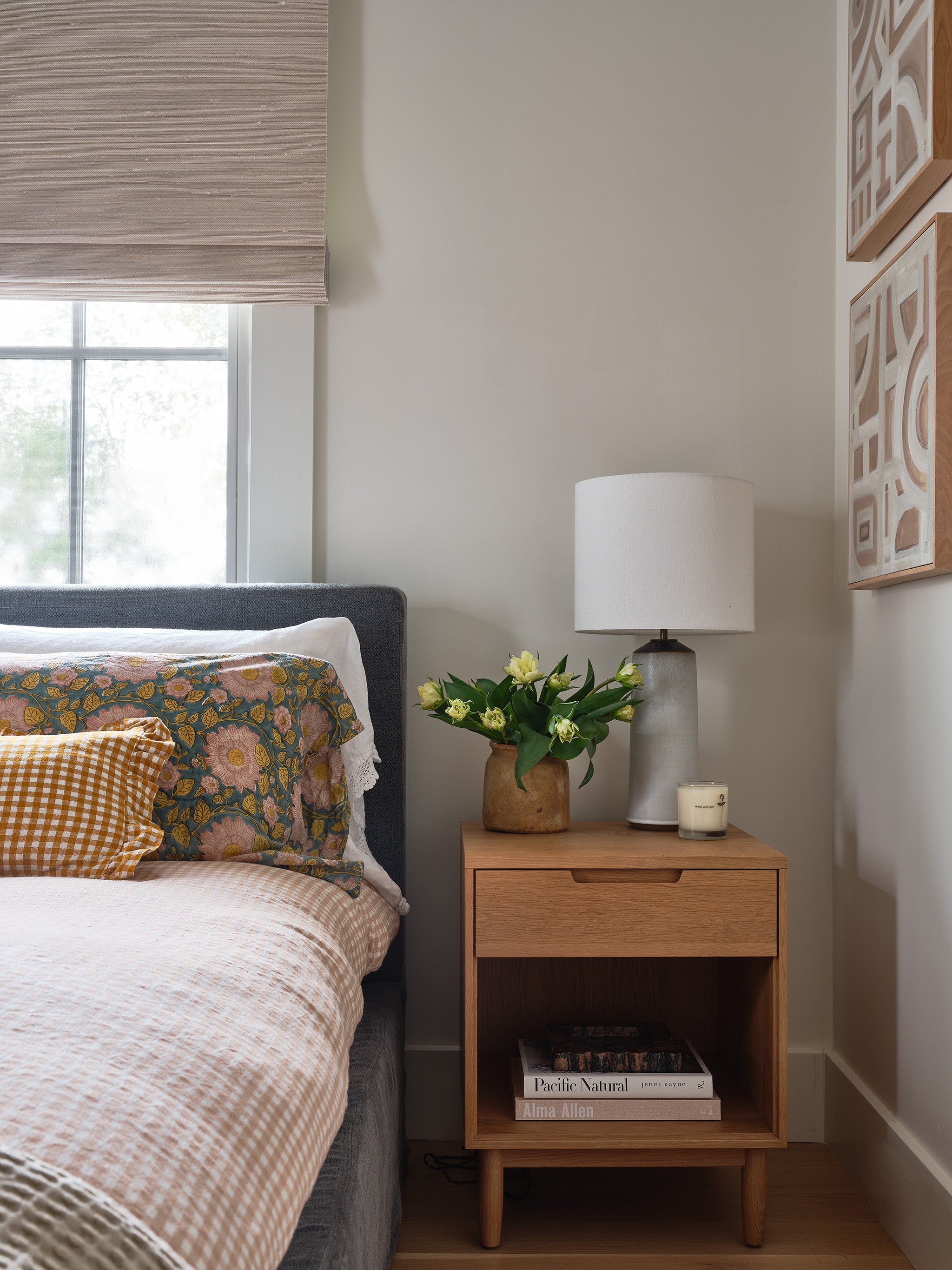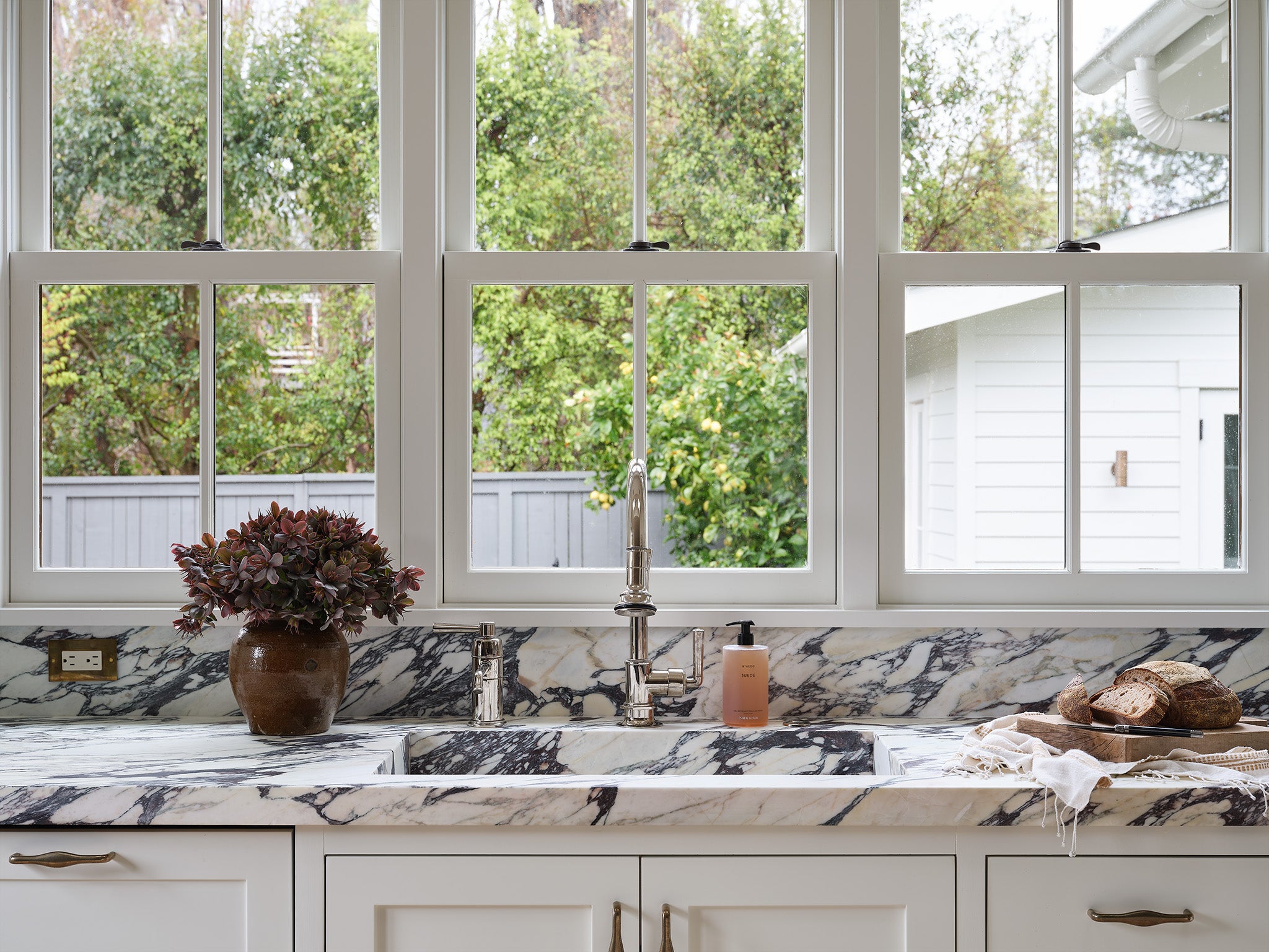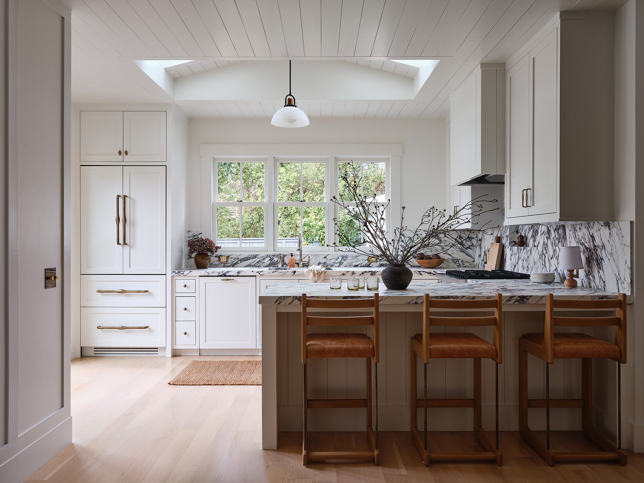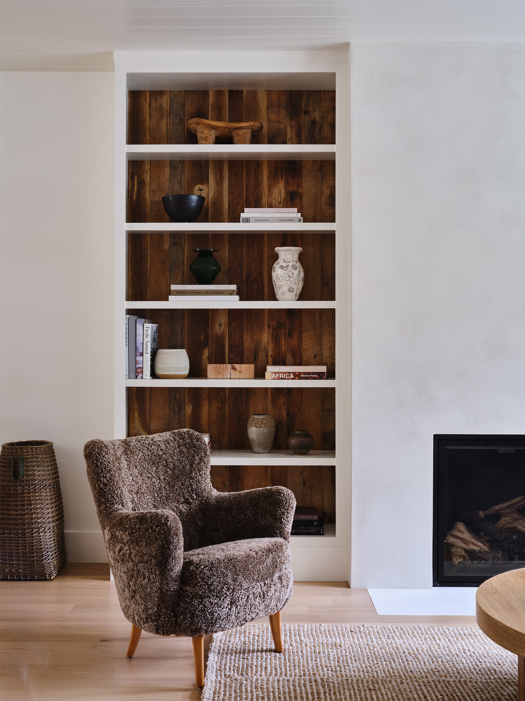 This home is very special to me, as it is my own. At the beginning of 2023 it was time for a partial remodel. We updated the formal lounge by removing the dated limestone tiles and plastering the fireplace. In the kitchen we delivered a new take on farmhouse eclectic with a bold-patterned marble and new, antique brass hardware. In the powder room we added a custom stone sink with Waterworks brass fittings and ceramic pieces from Heather Levine. In the living, a custom couch and soft earth colors to compliment a cozy, loungey feeling.