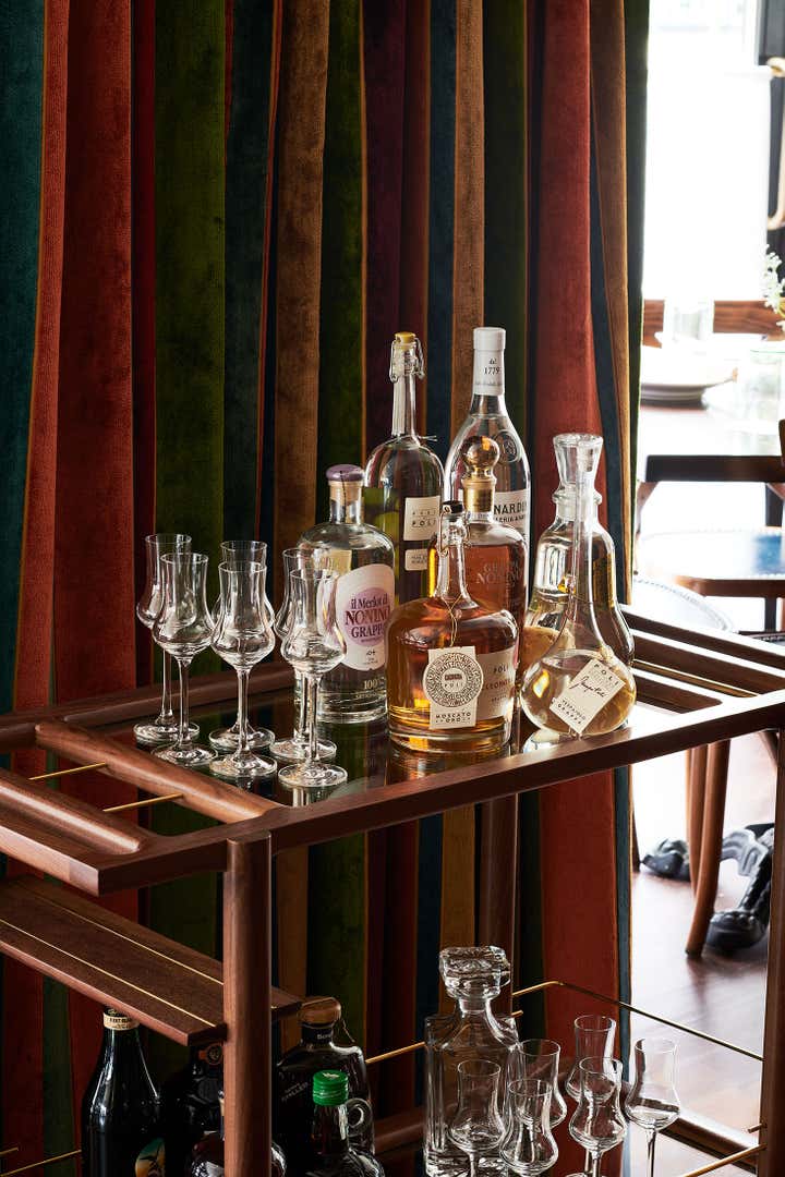 Located on the upper west side of manhattan this trattoria has a warm elegance throughout. The dining room is situated on the main level and offers bar service at a 42 long vintage bar. In the lower level a speak easy style lounge explodes with vibrant velvets and herringbone prints in the vintage sofas and chairs.