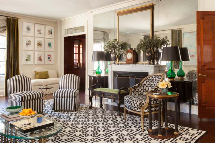 The decoration of a classic Fifth Avenue apartment. A striking palette of black and white accented with several shades of green unifies the lush decorative scheme in each of the well-appointed rooms. The gallery’s grisaille-toned “Scenes of Italy” wallpaper, the Living Room’s mirrored chimneybreast, and an array of lustrous, shimmery fabrics throughout the home – along with an edited selection of formal furniture styles – exude glamour, refinement and charm. A lattice-patterned rug from an historic Frances Elkins project inspired the dining room’s custom needlepoint carpet.