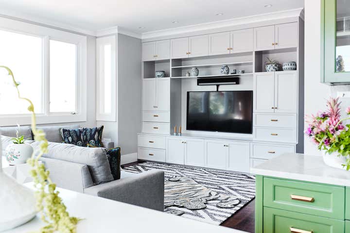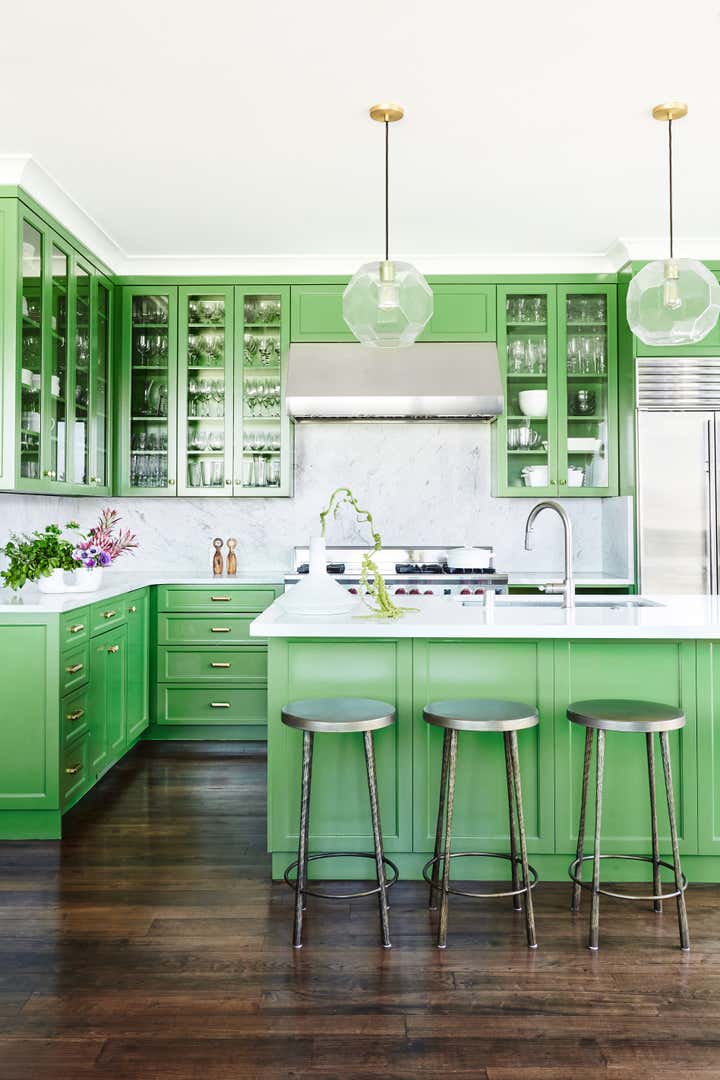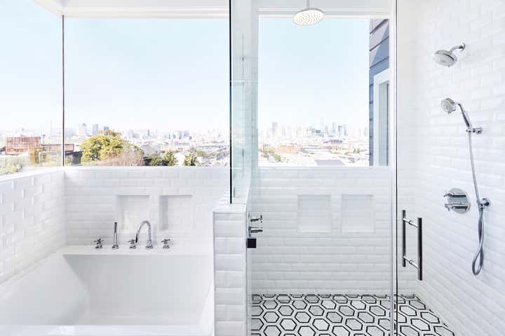 We removed the wall separating the kitchen from the family room, to create a flexible, casual everyday open concept space, and replaced the dated kitchen island with a more useful design (in the process we also painted the whole kitchen a vibrant Kelly green). Upstairs, we replaced and enlarged the windows, and created a serene master bathroom with breathtaking views of the city skyline from both the shower and bathtub.