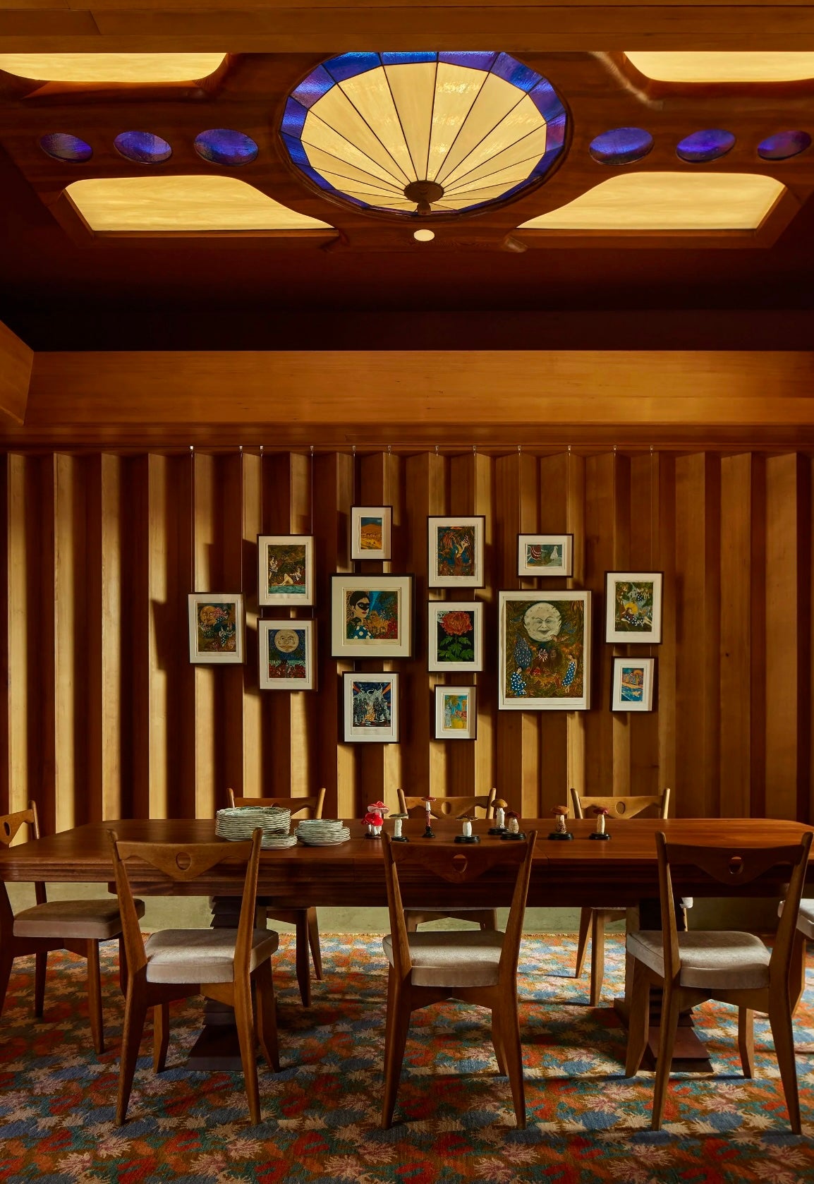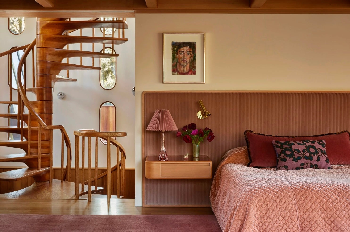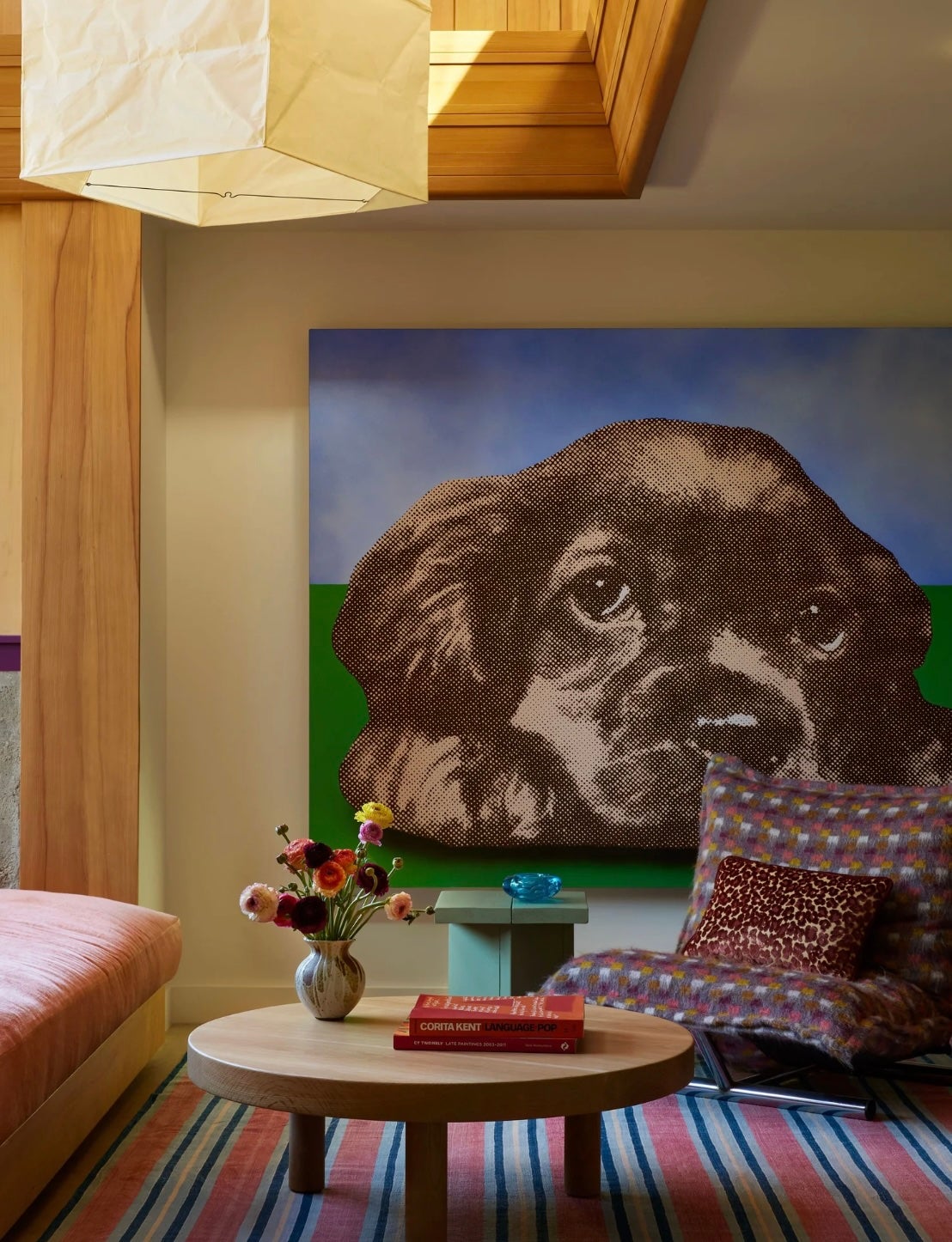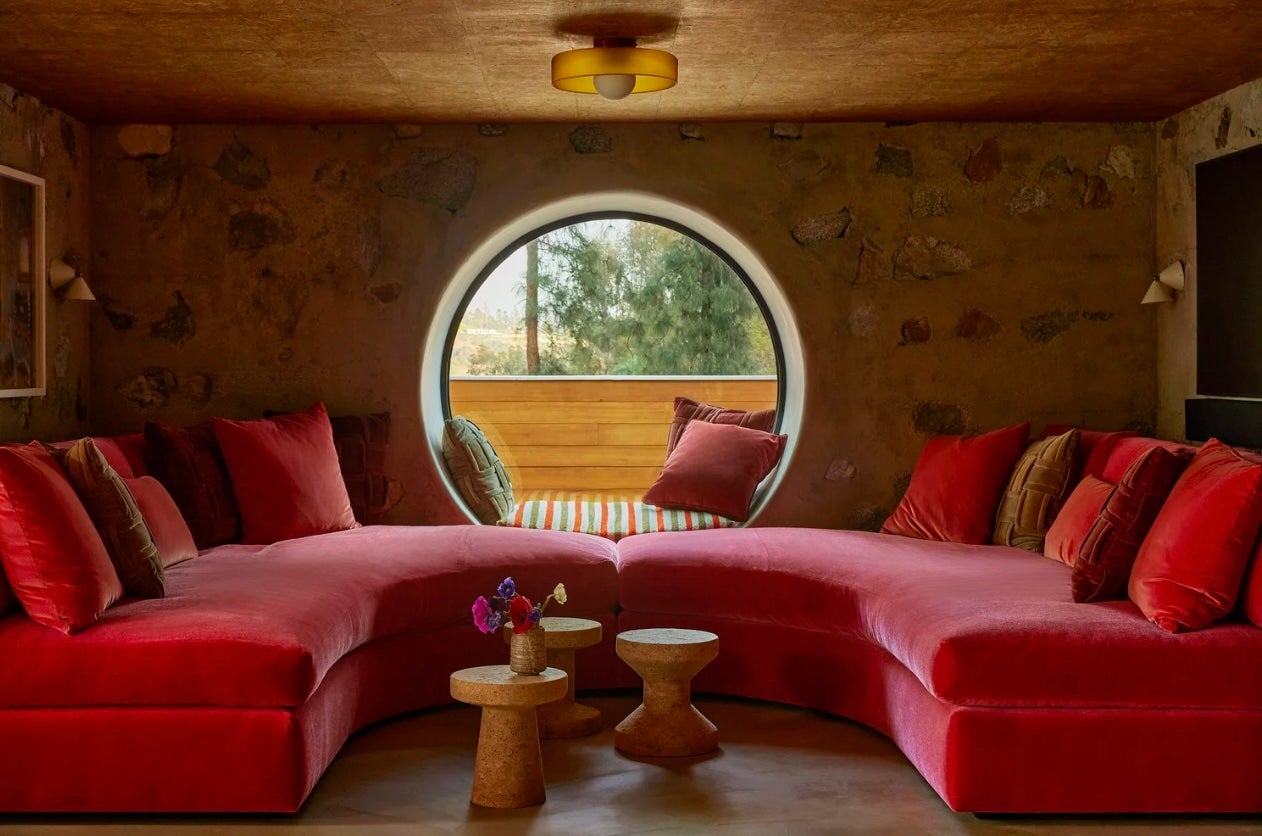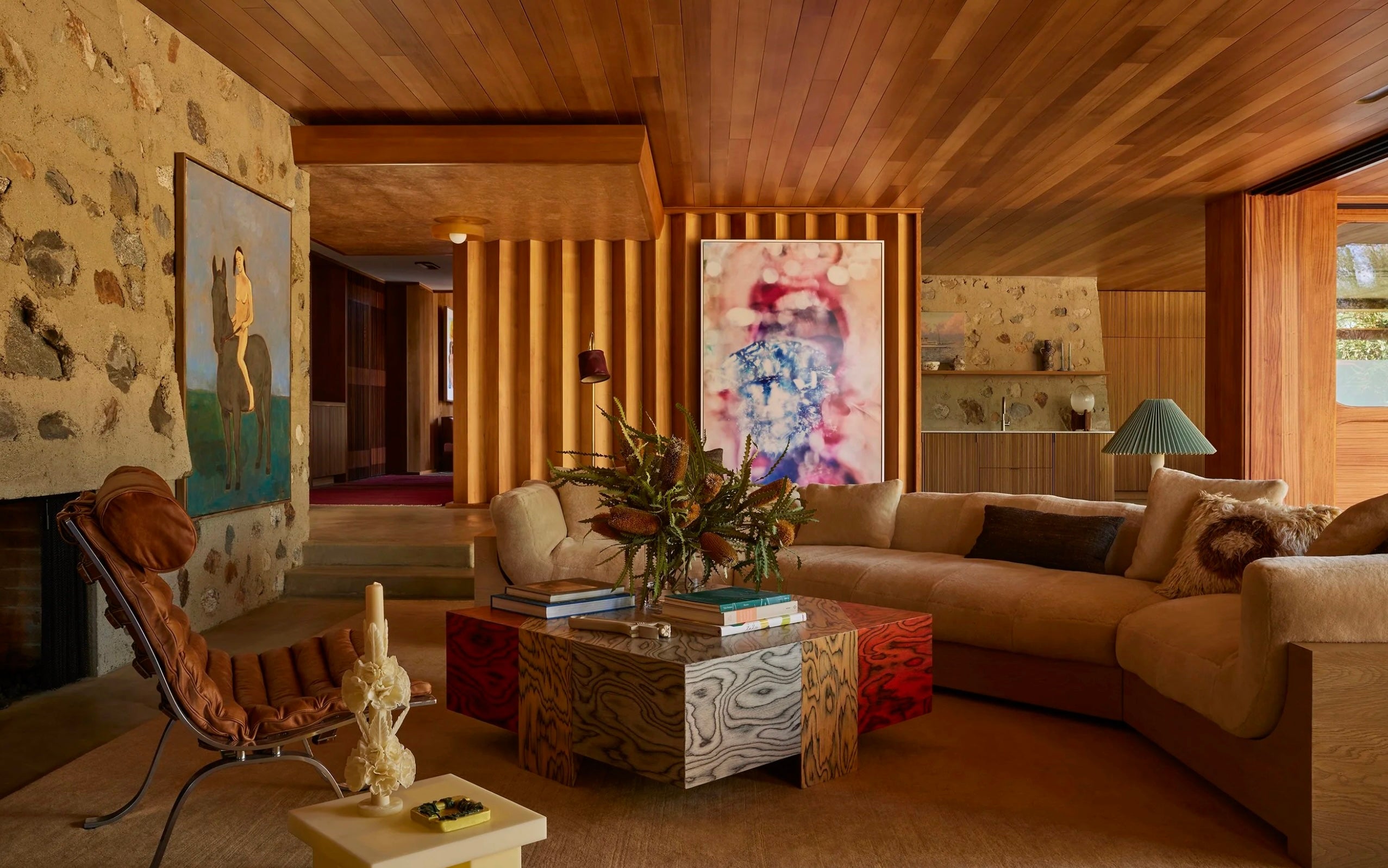 The house s most distinguishing features are its muscular desert masonry walls of rocks and boulders embedded in concrete, which travel from the exterior to the interior, as well as graphic accordion walls of hemlock. Based on the client s directive, we tried to push it in a more feminine direction to counter the masculine vibe. Our strategic eruptions of lavender, mauve, and coral that spice up the otherwise neutral palette attuned to the earthy tones of the woodwork and stone masonry. The upholstery is extra plush and cozy as a counterbalance to the abundant concrete and stone.