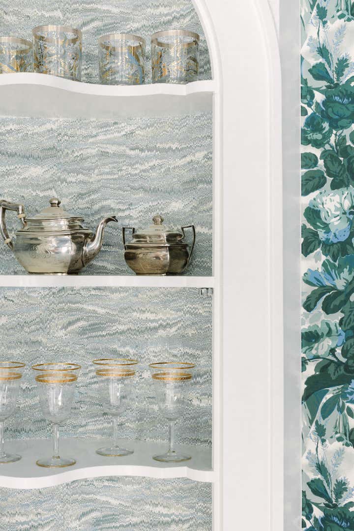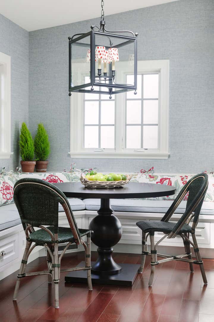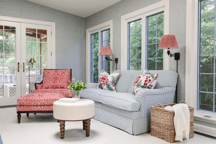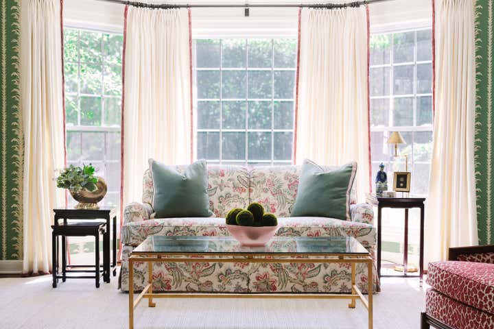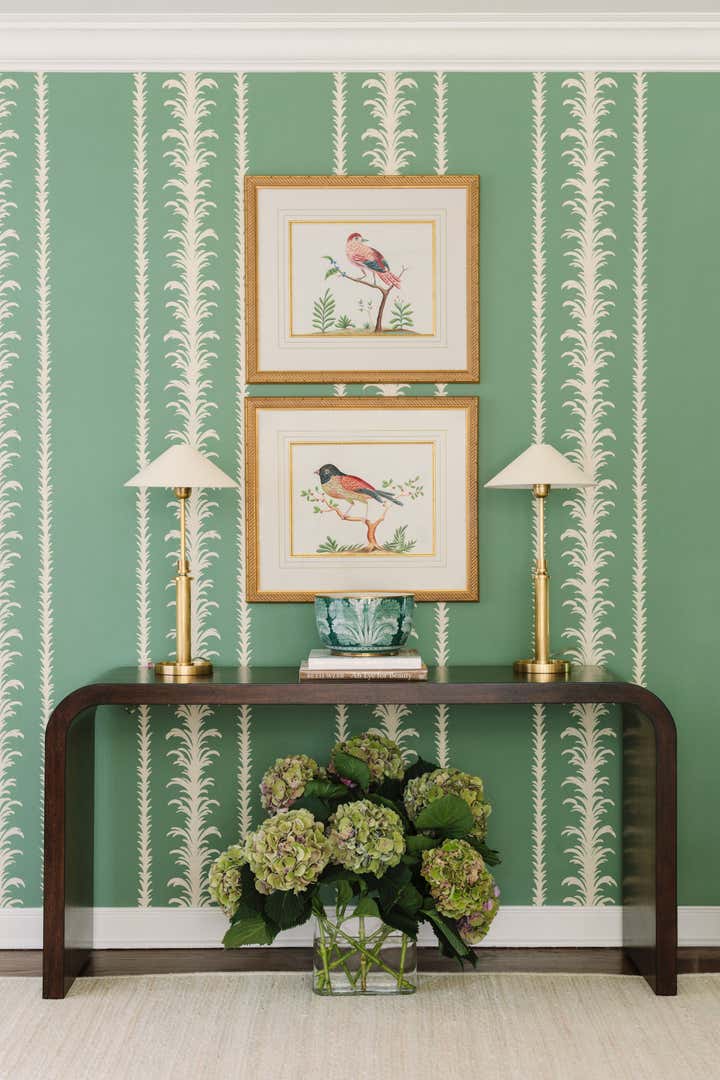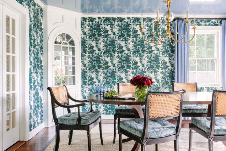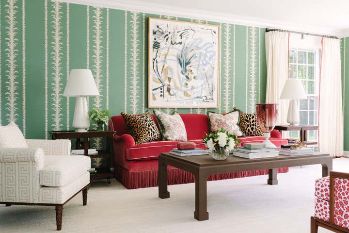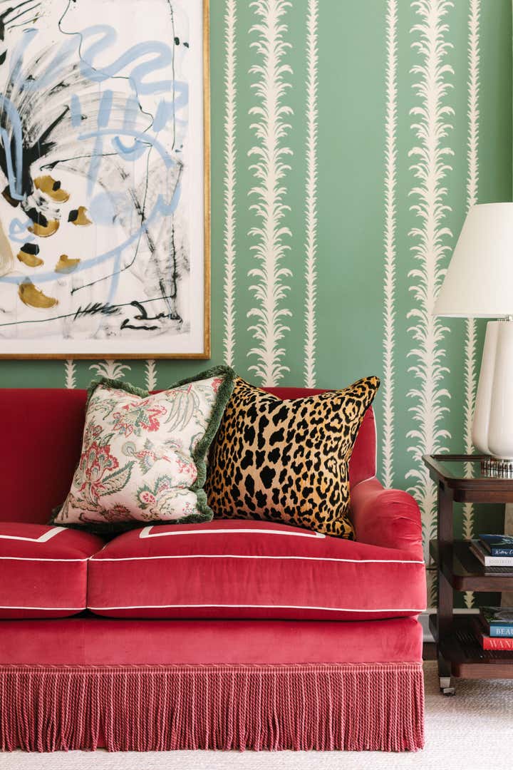 This beautiful family home features mixes of pattern and color with the two stars being the vintage yet modern dining room wallpaper and the custom red velvet sofa with bullion fringe.