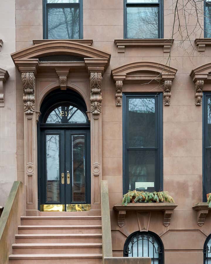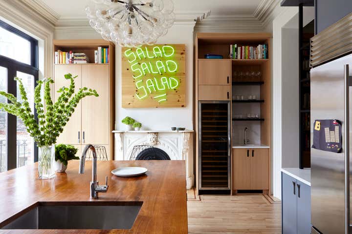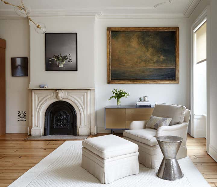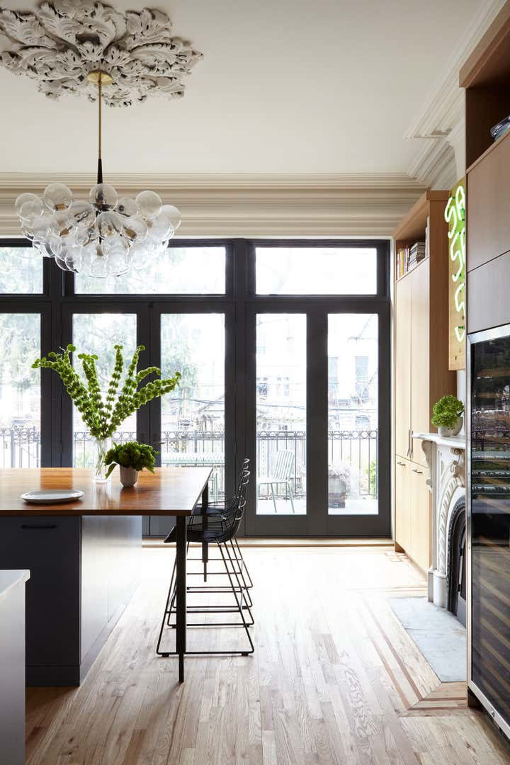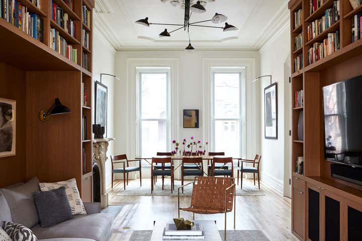 The renovation of a stately 3,500 sq ft, 1870 Italianate townhouse in Brooklyn’s Fort Greene negotiates and balances the building’s history and context with a desire for a forward-looking, family friendly, contemporary residence. The team was able to accomplish this through an exceptional attention to the client’s wish list, careful attention to design and finishes, and a broadly collaborative approach. Conceived as both a family home and a setting for intimate friendly gatherings, the house is organized around multi-directional and multi-level circulation. Opportunities for light, air, and circulation to enliven the interior were captured through a few key moves. The most impactful change was a generous glass opening on the rear exterior wall of the parlor floor that emphasize the building’s connectivity to natural light, backyard greenery and creation of visual and spatial sightlines from the moment you step into the entry door. The historic period decorations and crisp, incised ornamental surfaces that are characteristic of the Italianate style, were juxtaposed by contemporary light fixtures and art by the likes of Will Cotton and Sylvie Fleury. Throughout the house, modern finishes integrate with a pure color palette and augment the clients existing collection of mid-century furniture and custom contemporary furniture. Rich wood millwork insertions were added into the existing Italianate interior architectural details which were maintained. This happens in the kitchen, the living room, the master closet, master bath vanity and kids bath.
