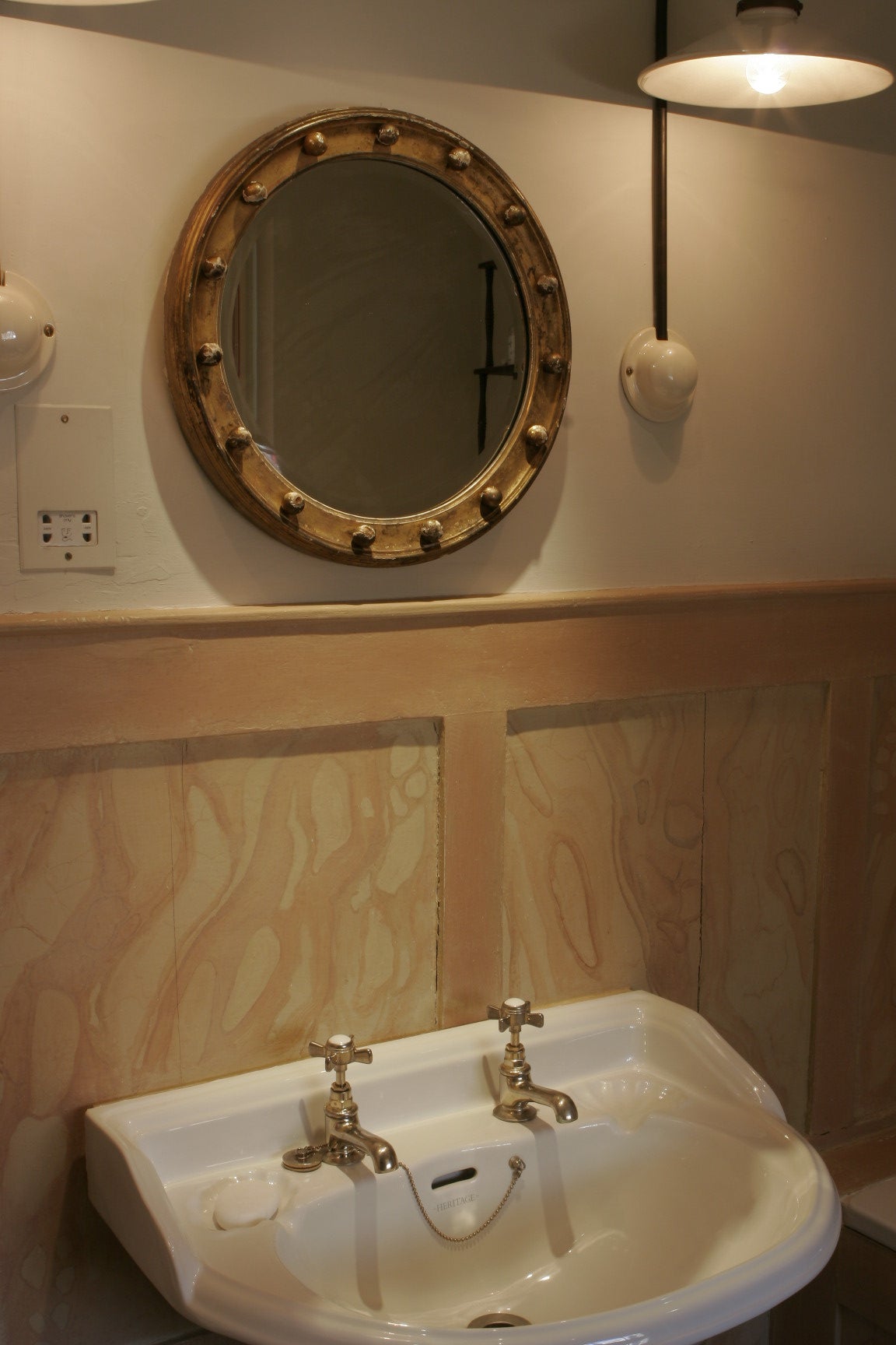 We designed, planned, arranged and oversaw the complete re-decoration of the building, including the washing back and re-finishing of the original wooden floors, detailed patinated paint finishes in all rooms, including small areas of Trompe L oeil , farmer s marbling and spot motif fresco decoration.