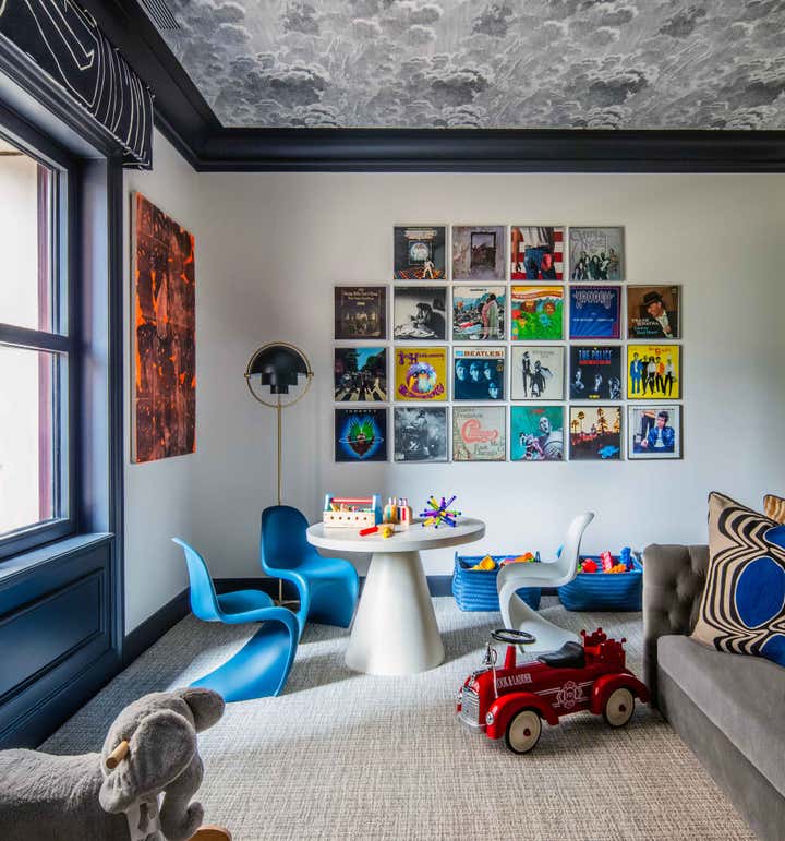 The Kid’s Room is a playful rock and roll fantasy. The client’s vintage record albums, Woodstock poster, Agam and Peter Max pop art live with Marilyn Minter’s amazing lips and the dreamy Fornasetti clouds.