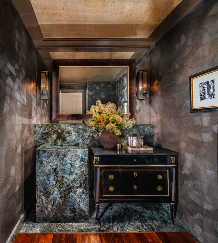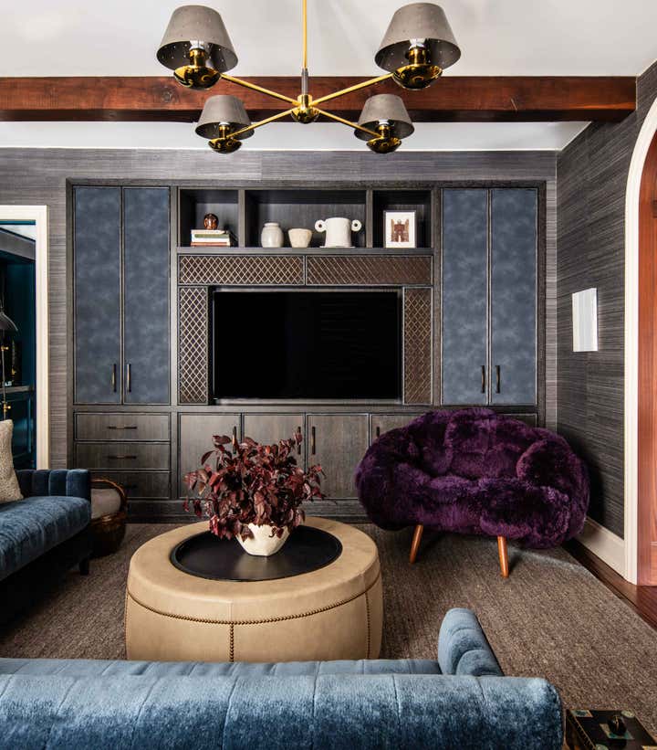 The Family Room is home’s central hub and features a whimsical aubergine Campagna Brothers Bolotas Chair from Carpenters Workshop and a rich blue mohair sofa sectional. The suede, black cirused oak and metal cabinets were custom designed for the space.
