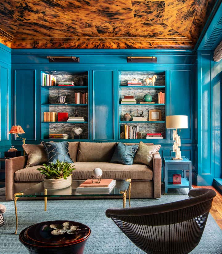 The existing wood paneled library was painted a punchy peacock color; a hand painted tortoise shell inspired ceiling punctuates the drama.