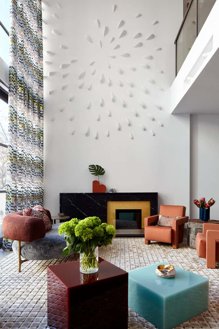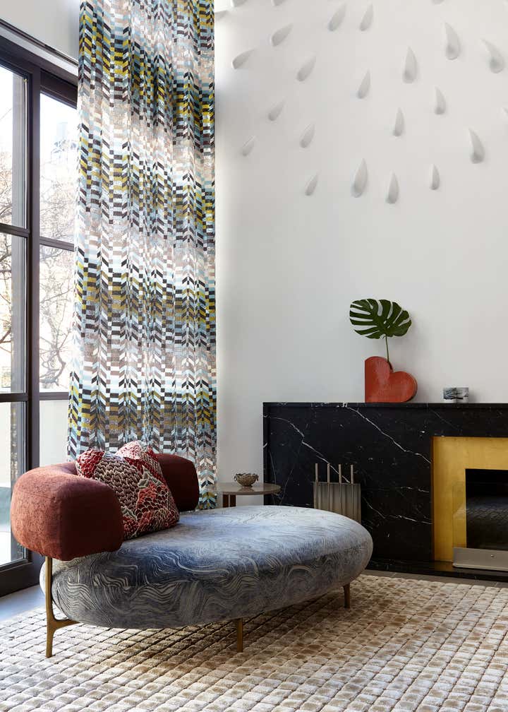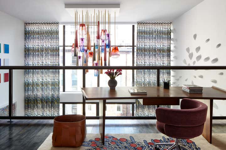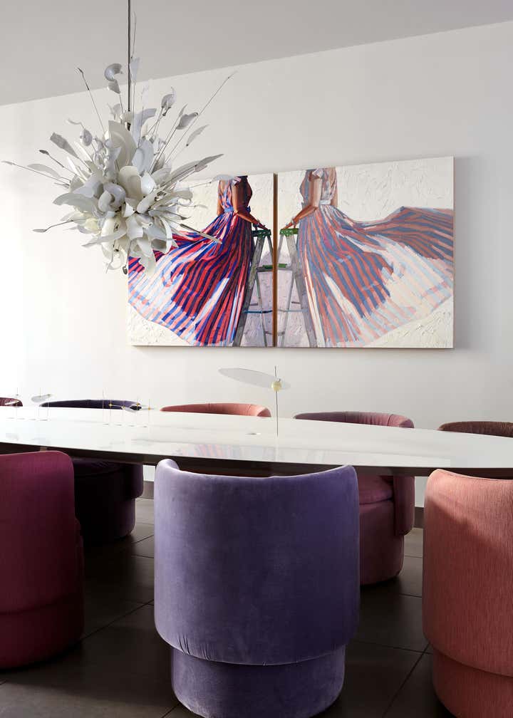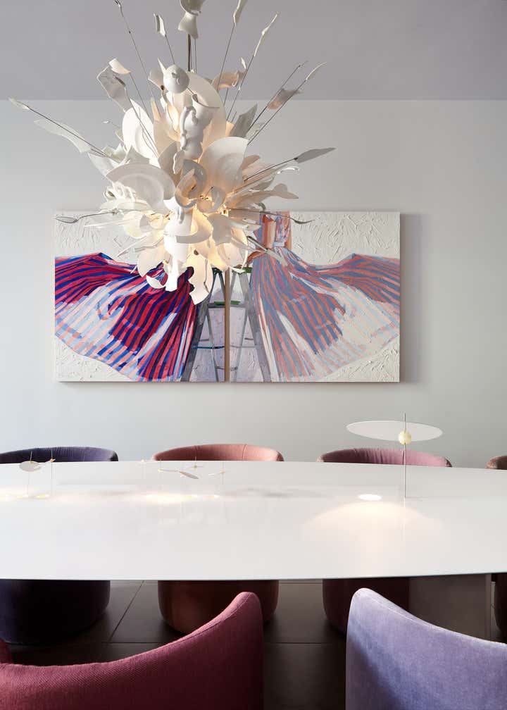Custom-commissioned works of art and design offer moments of surprise and reflect the homeowner’s personality: from dramatic, floor-to-ceiling sequin-embroidered drapes; to an Ini Archibong-designed chandelier composed of gleaming, multi-colored glass pendants; and a diptych by Kelly Reemtsen.