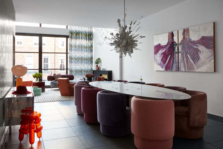 With a complex and fashion-forward palette, we layered ornamentation, glamour, and femininity into the design. Dismantling any sense of rigid formality, we balanced the traditional with playful elements, installing a metallic wallcovering alongside original wood staircases, and multi-hued cocktail lounge chairs for an unexpectedly laid-back dining room.