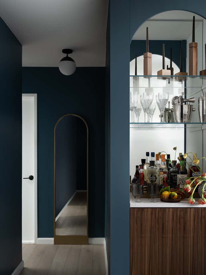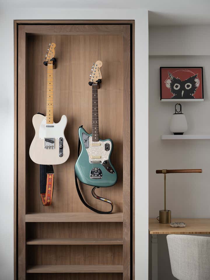 This 820-square-foot prewar apartment is the epitome of small space New York City living and while the smaller footprint presented quite a few design challenges, PROJECT AZ embraced all of the structural limitations and infused the young couple’s enthusiasm for music and fitness into a joyful and eclectic design with splashes of color. For a couple in their mid-30s, the result is a fully functional and personalized space with creative and smart storage solutions.