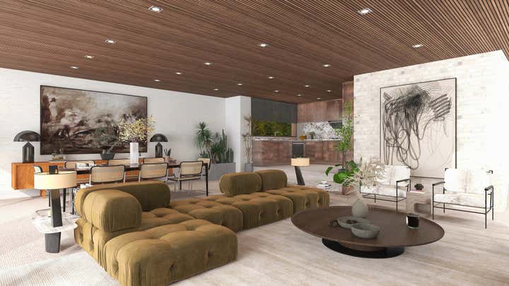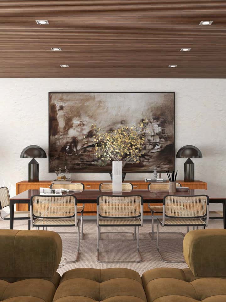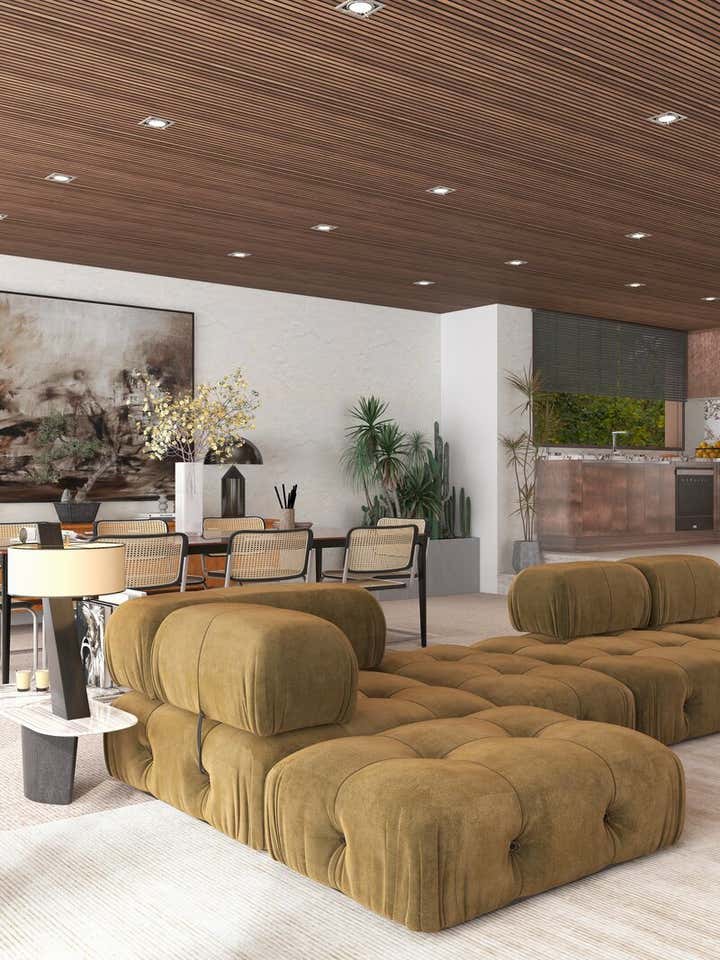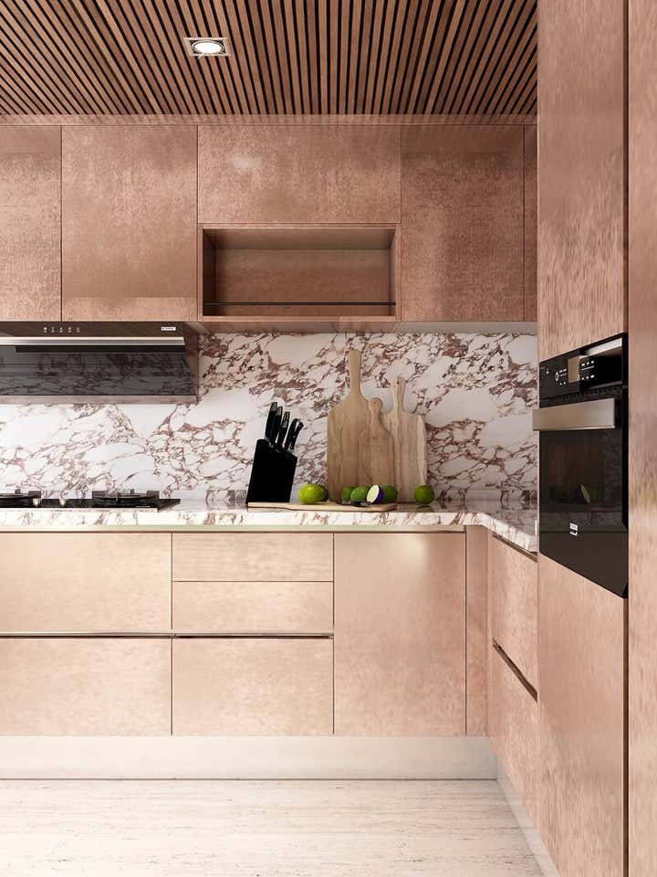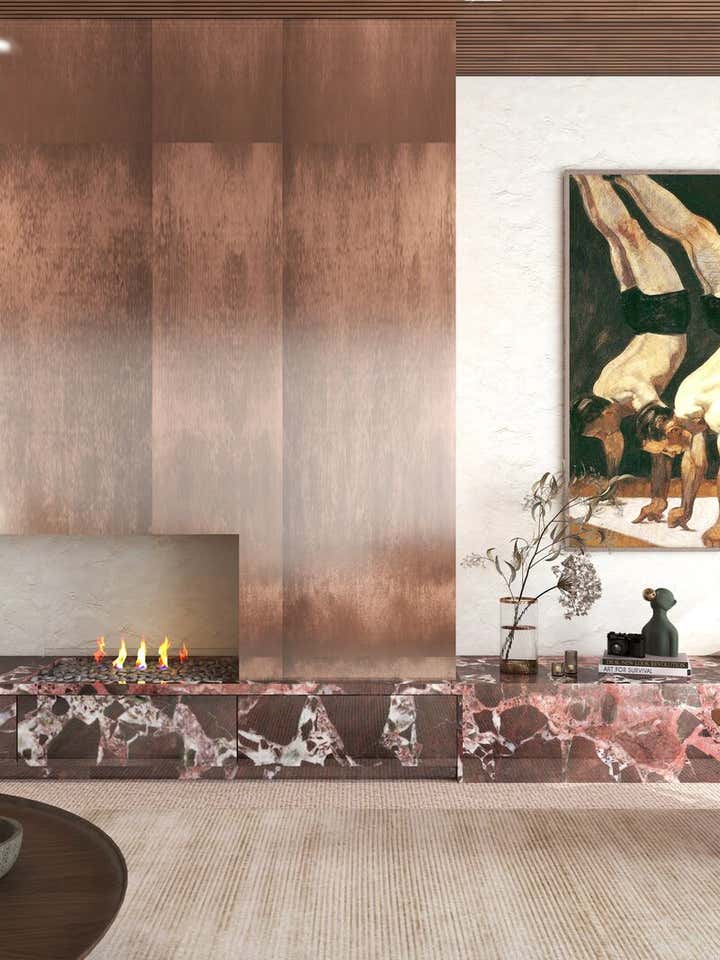 THIS HAMPSTEAD DETACHED HOUSE WAS BUILT SPECIFICALLY WITH A YOUNG PROFESSIONAL IN MIND. WE CAPTURED A CLASSIC 70S FEEL IN OUR DESIGN, WHICH MAKES THE HOME A GREAT PLACE FOR ENTERTAINING. THE MAIN LIVING AREA IS LARGE OPEN SPACE WITH AN IMPRESSIVE FIREPLACE THAT SITS ON A LOW BOARD OF ROSSO LEVANTO MARBLE AND HAS BEEN CLAD IN OXIDIZED COPPER. WE VE USED THE SAME COPPER TO CLAD THE KITCHEN CABINET DOORS, BRINGING OUT THE TEXTURE OF THE CALACATTA VIOLA MARBLE WORKTOP AND BACKSPLASH. FINALLY, ICONIC PIECES OF FURNITURE BY MAJOR DESIGNERS HELP ELEVATE THIS UNIQUE SPACE, GIVING IT AN ADDED TOUCH OF GLAMOUR.
