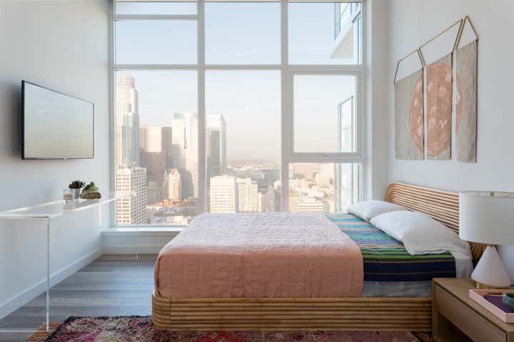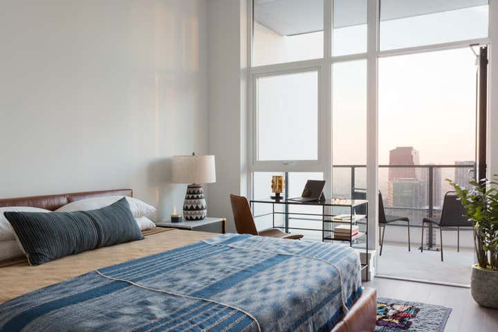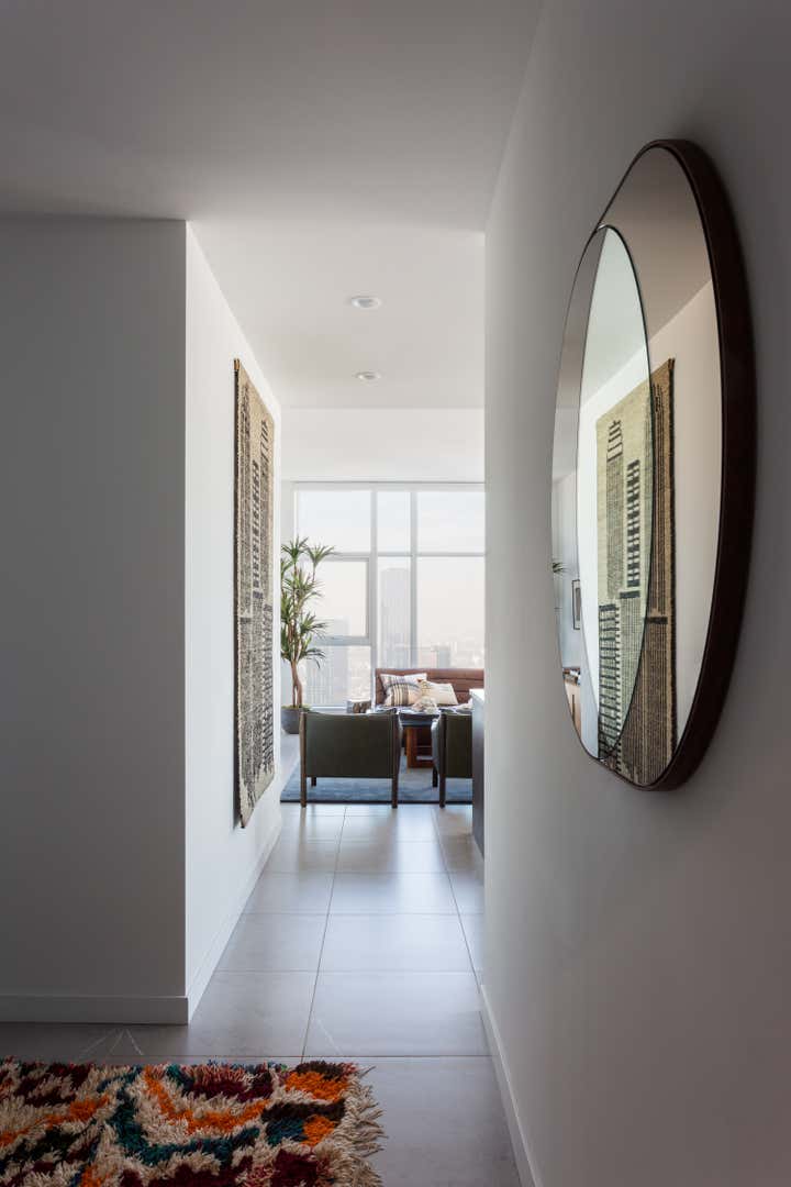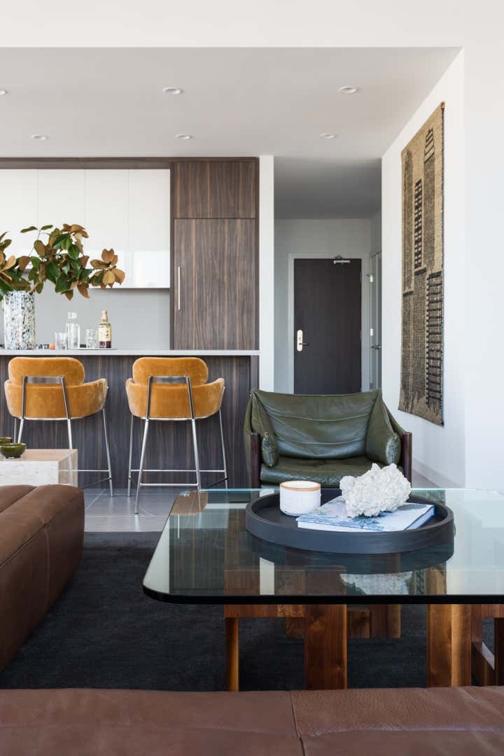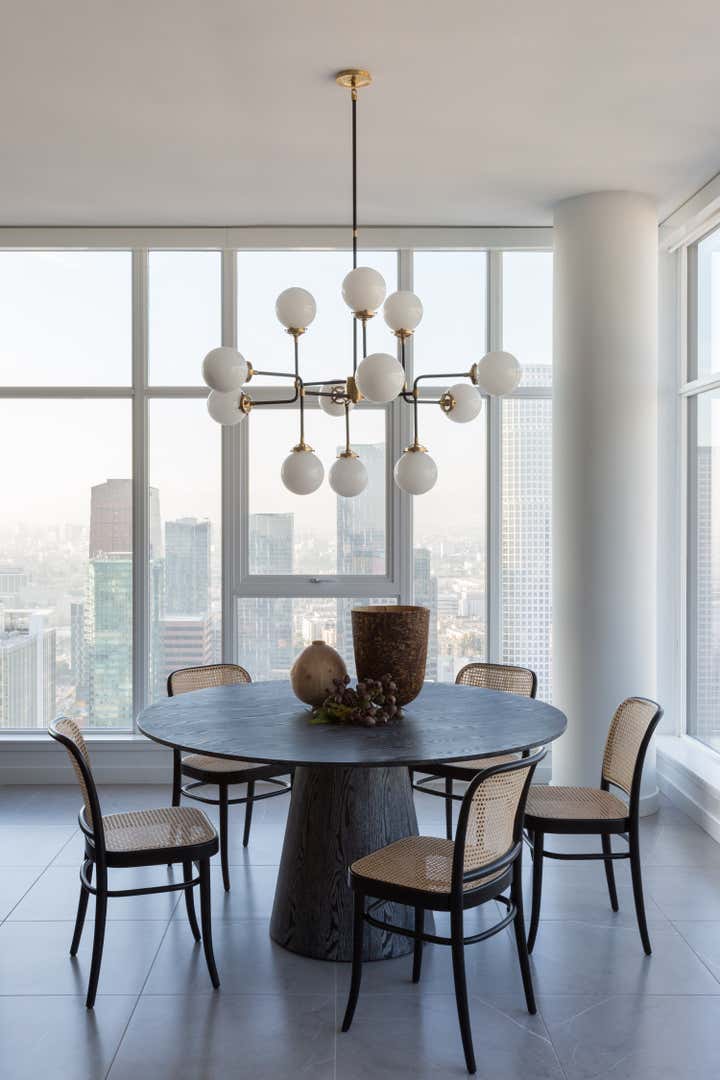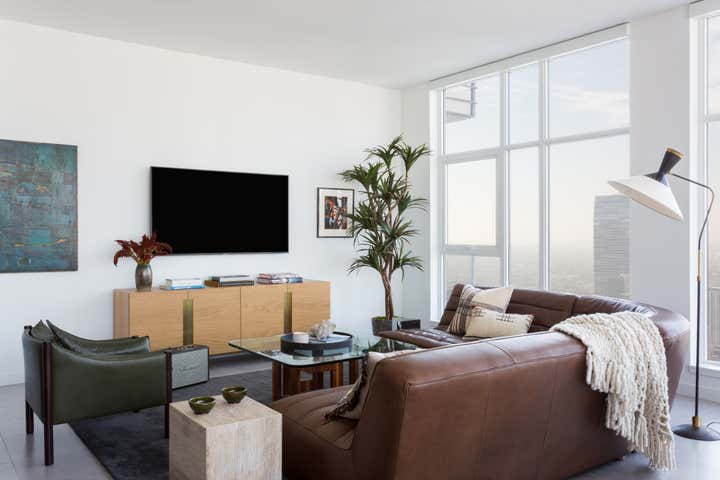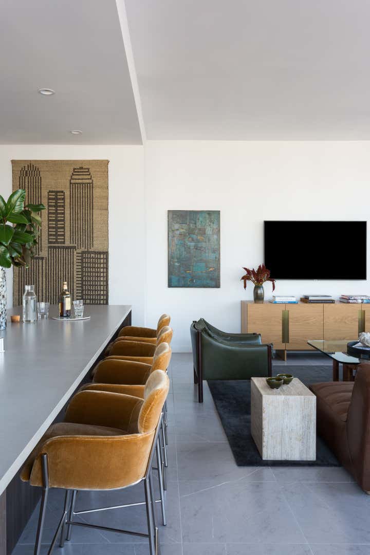 We were approached with a bit of a fun challenge: how to incorporate our Client’s traditional tastes into a modern high rise apartment in downtown Los Angeles. Functioning as a party pad for entertaining guests, with room for the whole family to stay over after nights out, this three-bedroom pied a terre needed to be fun but comfortable. Hive LA Home kept one eye on the view while bringing in the plenty of seating and alternating between soft and rugged earthy textures in modern shapes. The results are warm, cozy and metropolitan- perfect for sipping a pre-game whiskey and taking in the skyline.