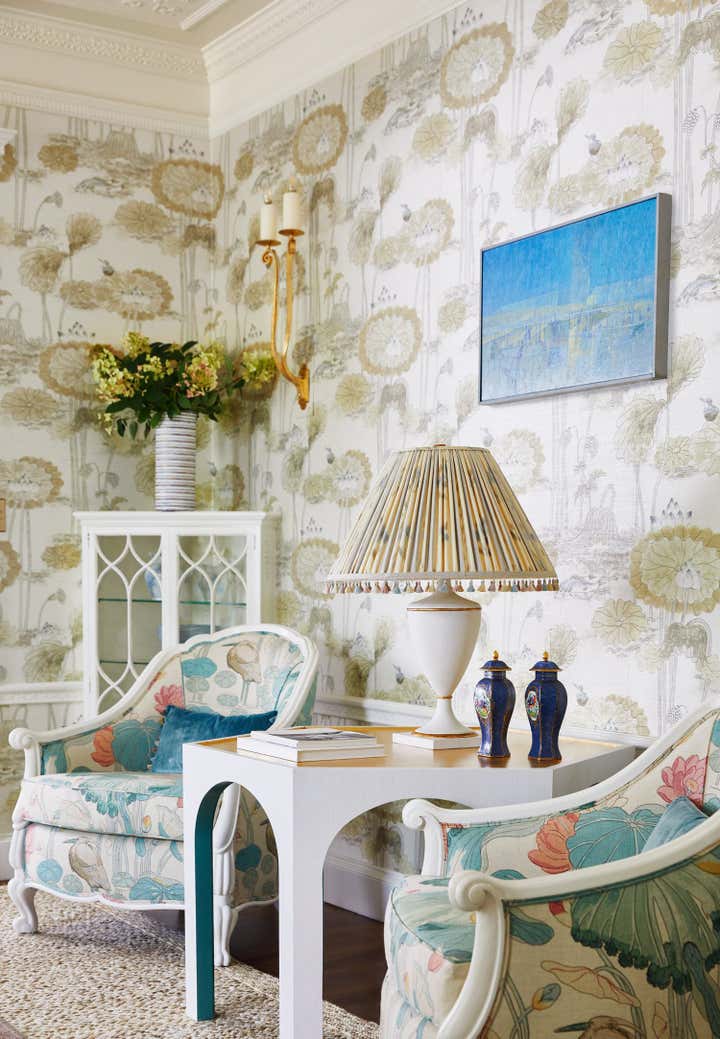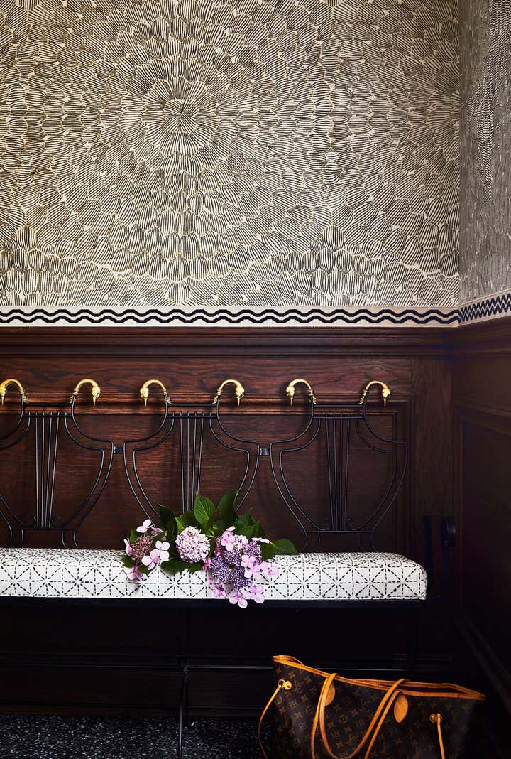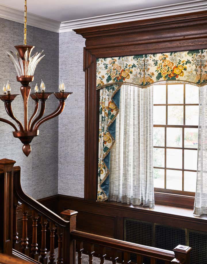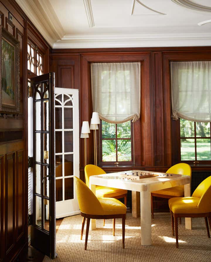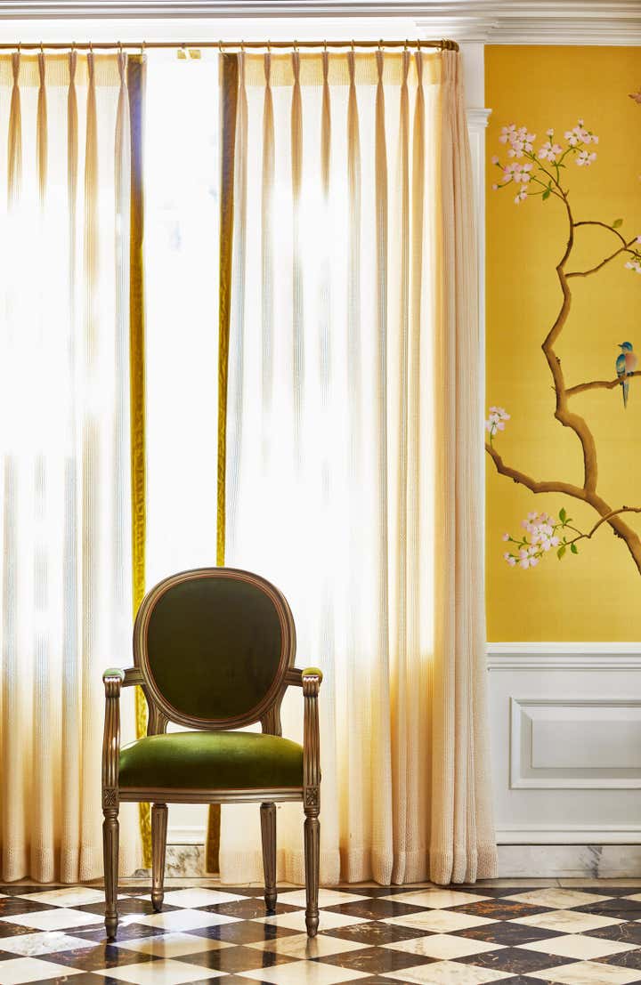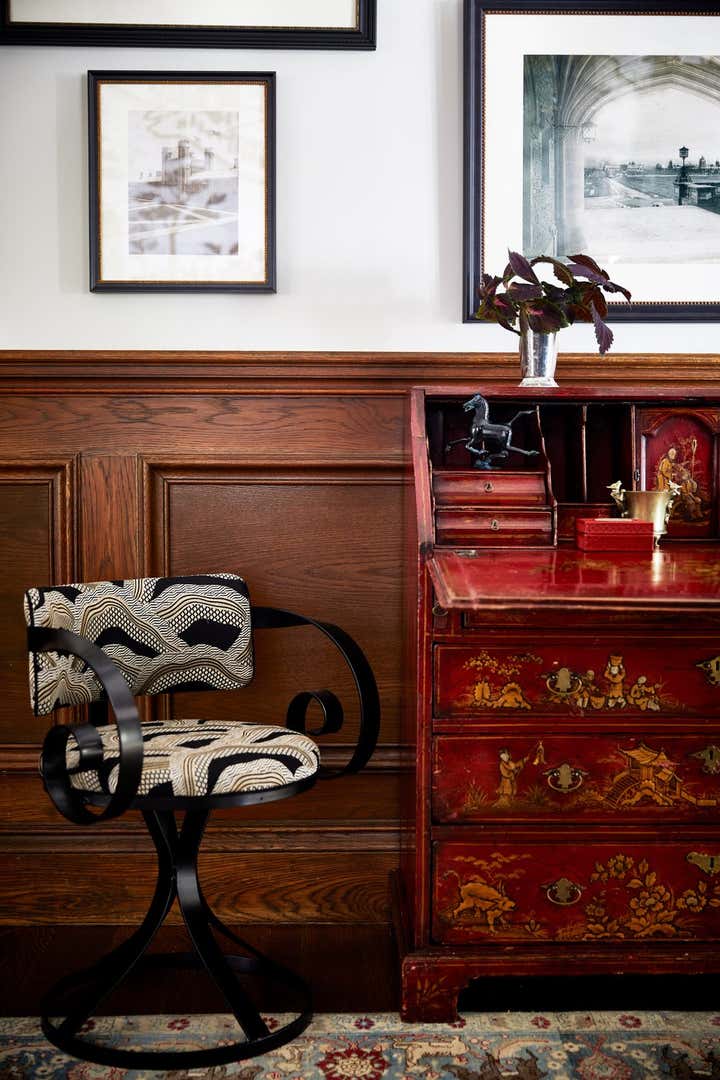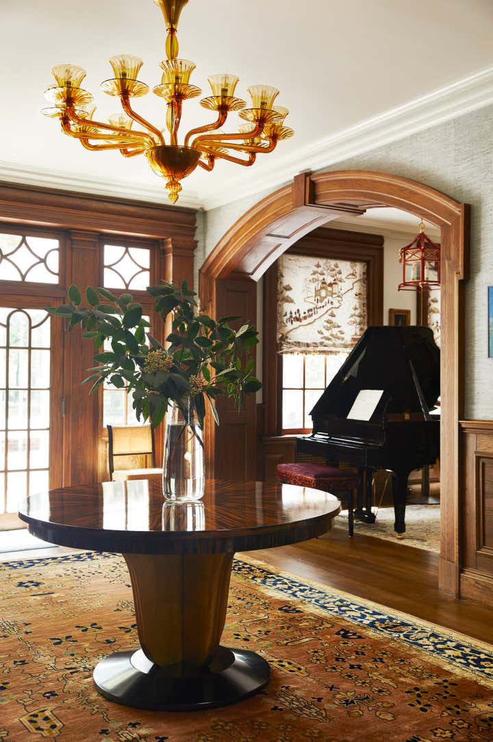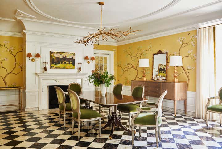 Originally built in 1912 in St. Louis, Missouri, this remarkable architectural home underwent a significant renovation in collaboration with Bower Leet Design. Ramsay Nye oversaw the complete renovation and decoration of the 15,000 square foot residence, alongside the restoration of important architectural elements such as millwork, plaster moldings, and elaborate ceiling details. The meticulous attention to detail is clear upon entering the foyer, which showcases a striking silk wallcovering, an antique Murano chandelier, and a lacquered zebrawood center table. The dining room features a bespoke, hand-painted chinoiserie wallpaper in the client s preferred buttery yellow, incorporating the Missouri state tree, flower, bird, and butterfly. As avid entertainers with a penchant for vibrant dinner parties, Ramsay Nye created a design narrative that ensured the various common rooms had distinct personalities, so guests could feel transported.