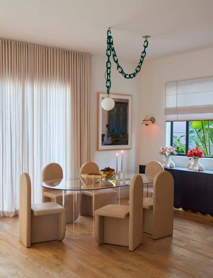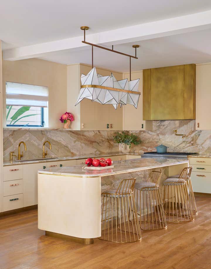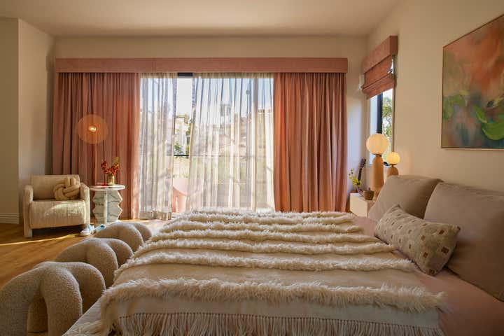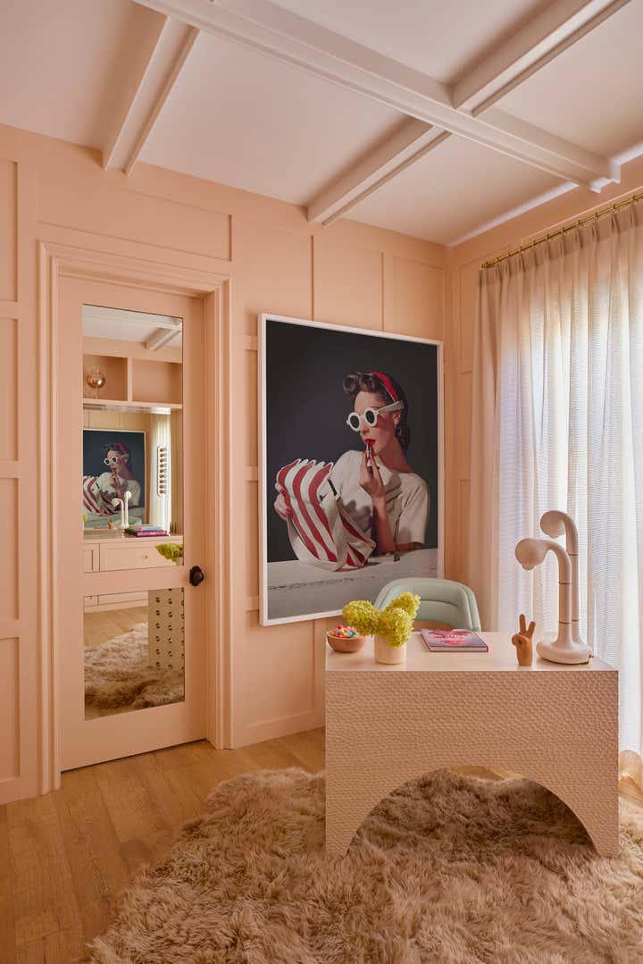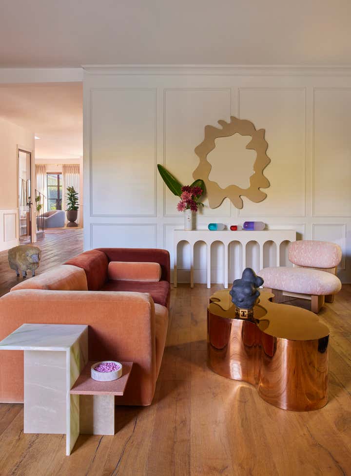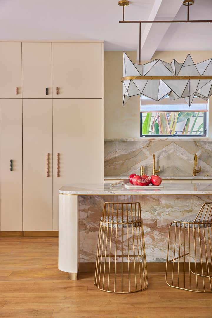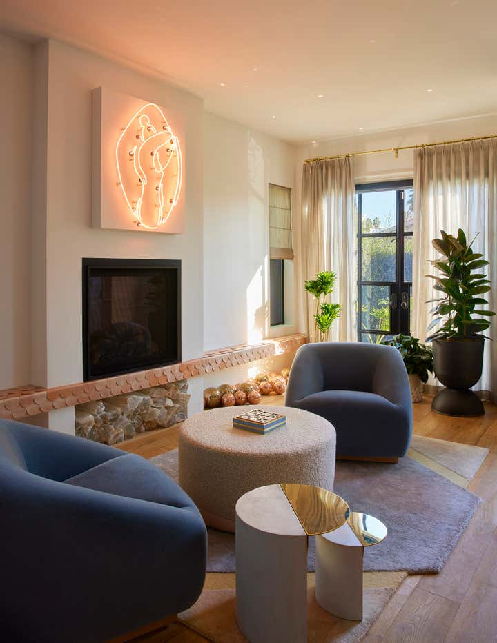 beauty industry. We combined her style influences - Alexander McQueen and Jean Harlow - with modern silhouettes and nods to her electric humor and polished upbringing for a feminine, bold and unexpected design that seamlessly transitions from gentle morning sunrises to lively impromptu soirees. The living room buzzes with cozy boutique hotel energy; the kitchen dazzles with decadently rich blush tones and brass; and the intimately bespoke rooftop lounge boasts all the playfully poetic touches of every host’s dream. This made-to-order love affair celebrates the fusion of creativity and craftsmanship for an adventurously timeless home.