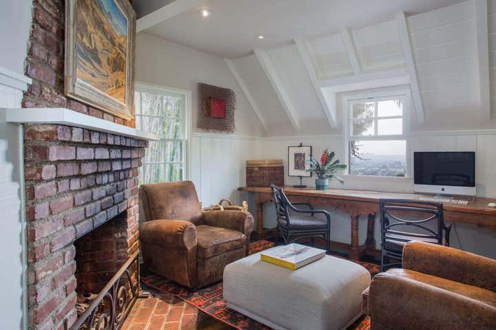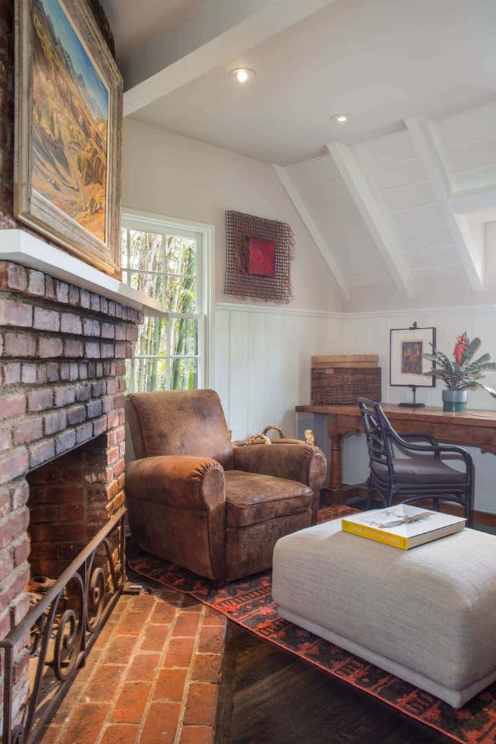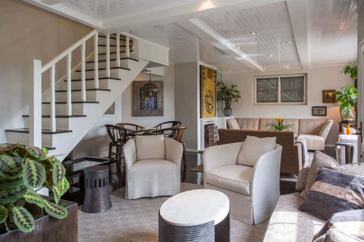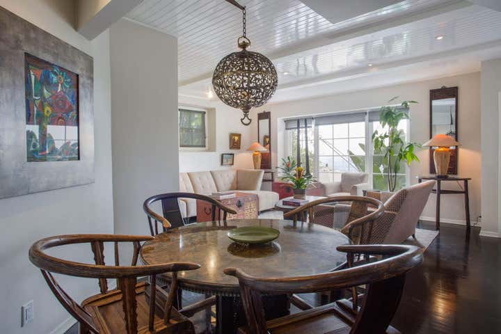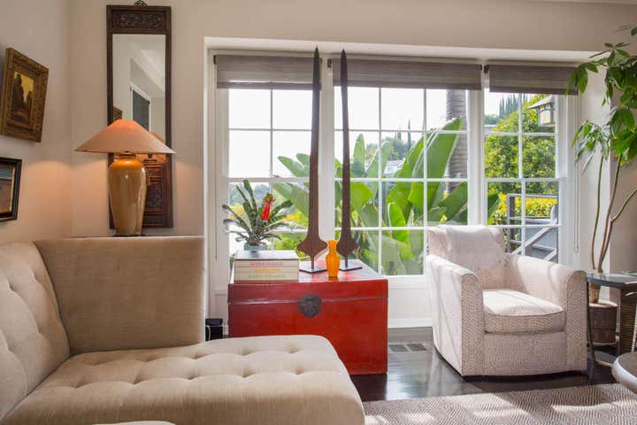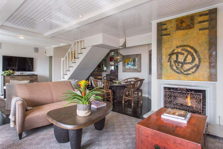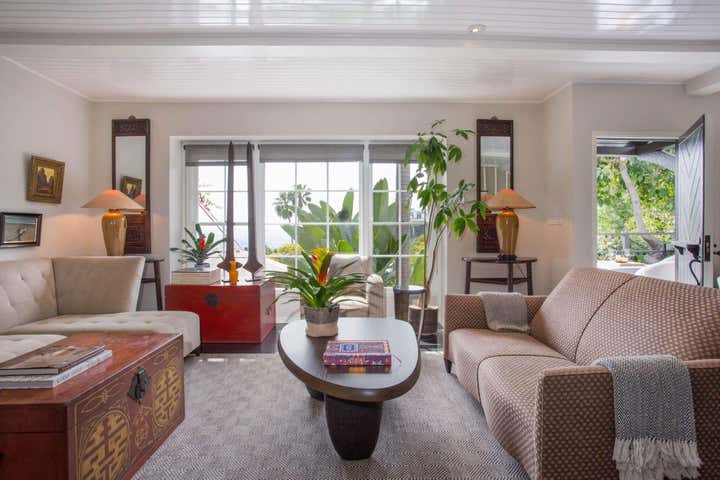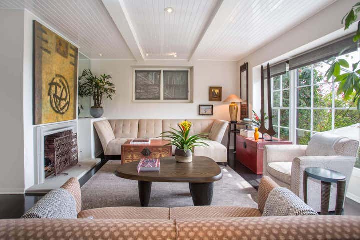This Hollywood Hills, Sunset Strip, Vintage 1940 s Robert Byrd House. Decorated with coffee bean flooring high gloss tongue and groove ceiling. Donghia and Gregorius Pineo Furniture.