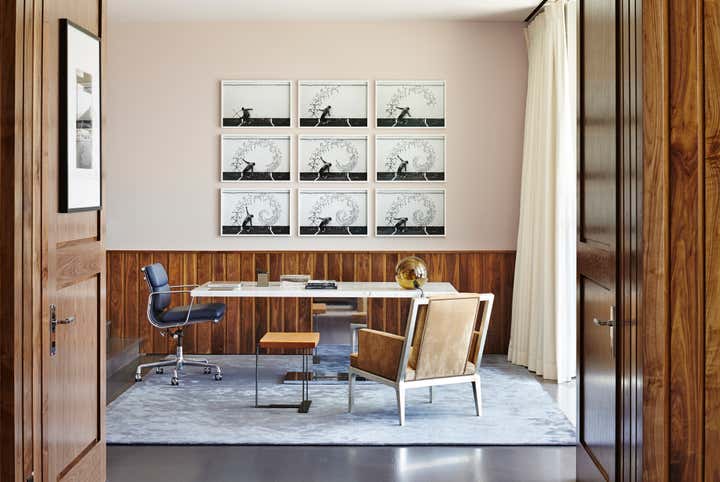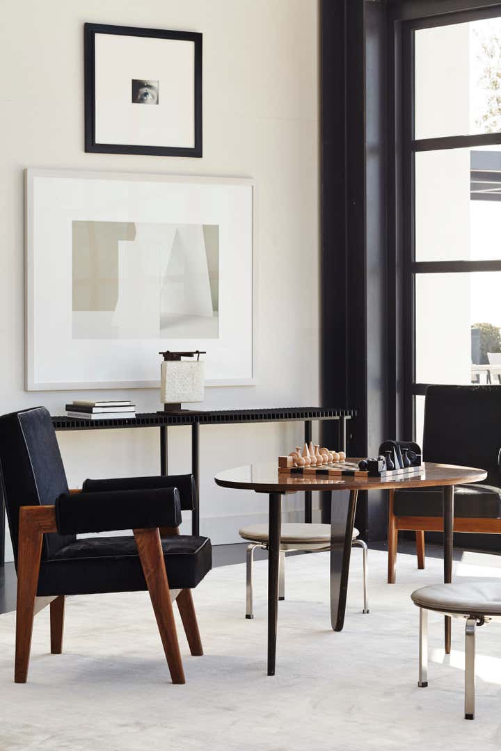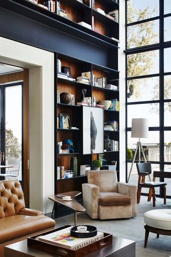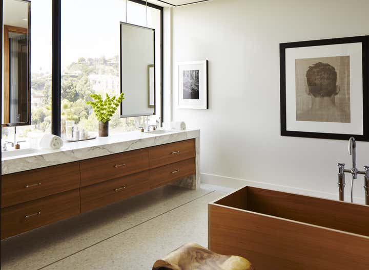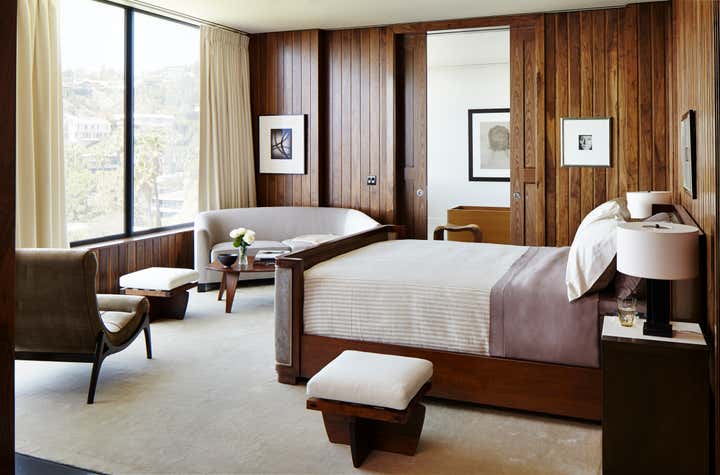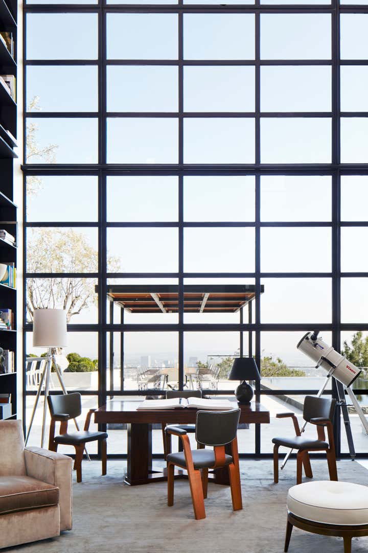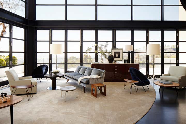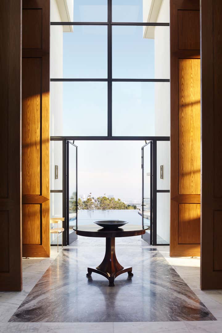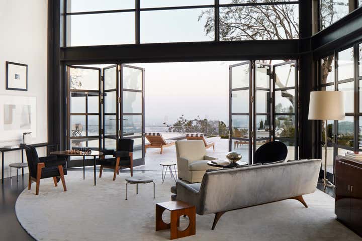 This cinematic, sun-soaked house set in the Hollywood Hills is built for living with light — every room opens onto towering views from the city to the sea. Early California modern and mid-century details recall the simplicity and restraint of vintage case study houses. Yet each gesture is expressed on a monumental scale, with the symmetry, presence, and graceful order of classical architecture, in elemental walnut, limestone, blackened steel. Fine collected furniture and art in luxurious, highly tailored combinations ground the light-filled space.