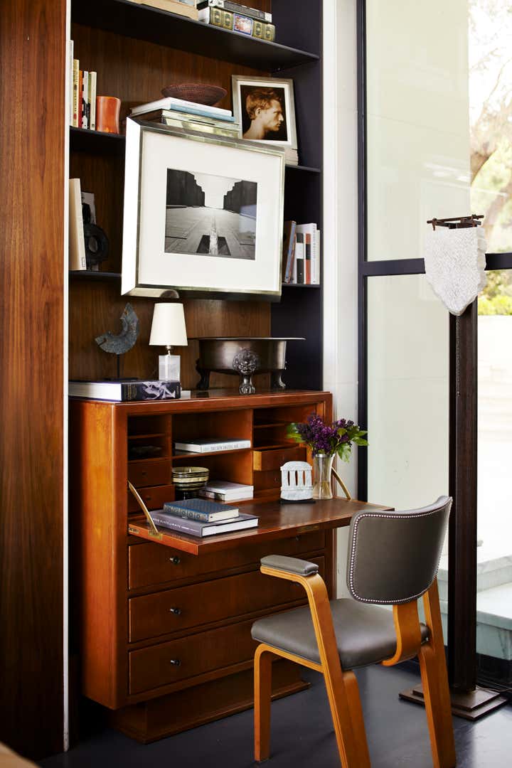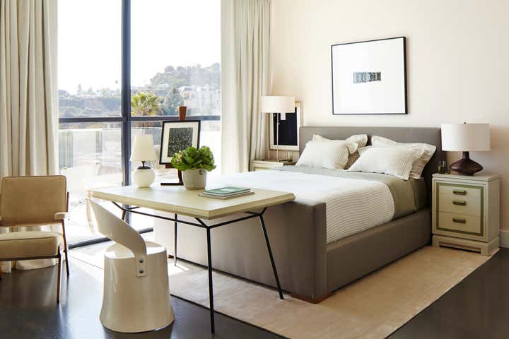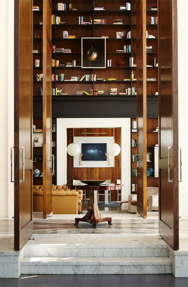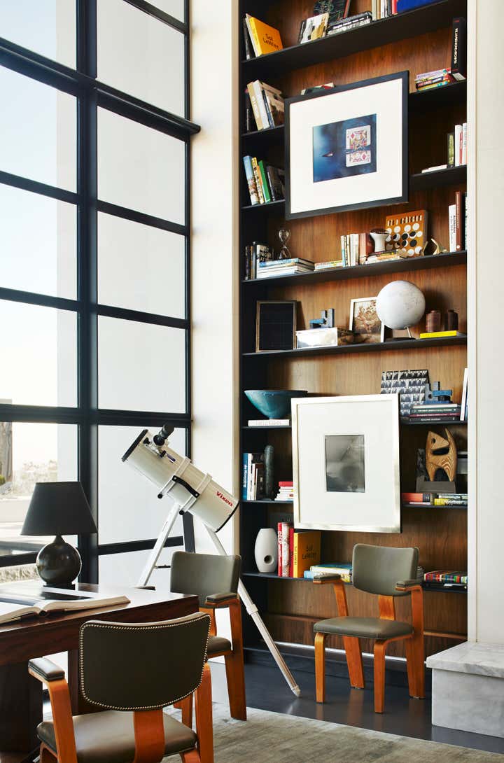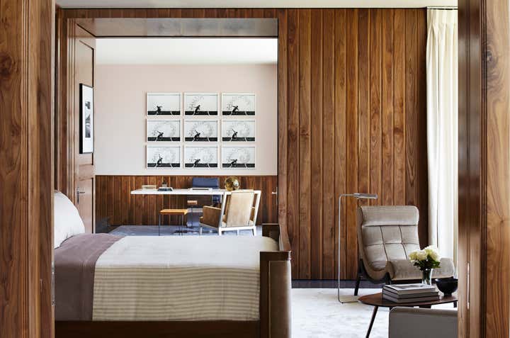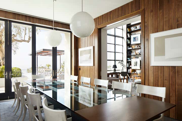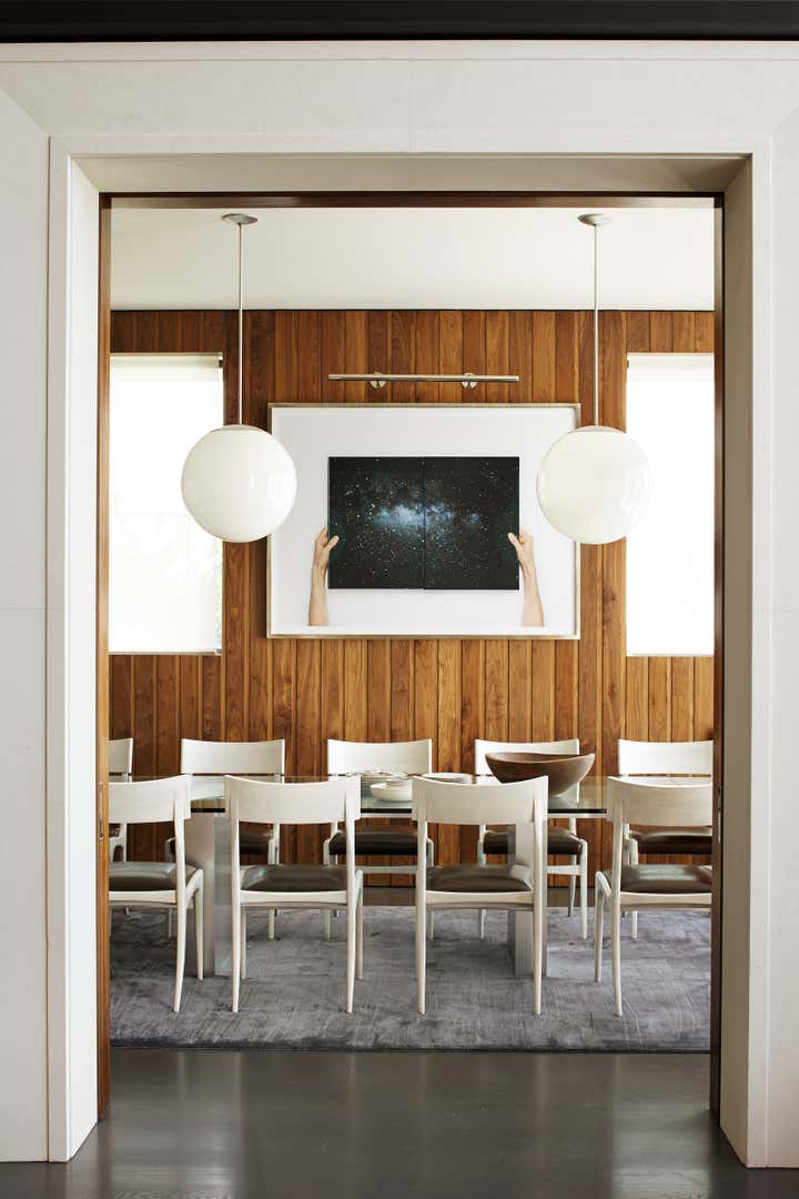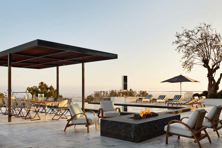 This cinematic, sun-soaked house set in the Hollywood Hills is built for living with light — every room opens onto towering views from the city to the sea. Early California modern and mid-century details recall the simplicity and restraint of vintage case study houses. Yet each gesture is expressed on a monumental scale, with the symmetry, presence, and graceful order of classical architecture, in elemental walnut, limestone, blackened steel. Fine collected furniture and art in luxurious, highly tailored combinations ground the light-filled space.