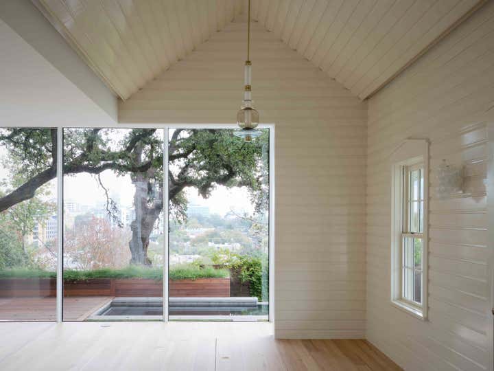 The design of a spec residence in Austin, integrating the adaptive reuse of an existing cottage with an eccentric, art-forward modern addition.