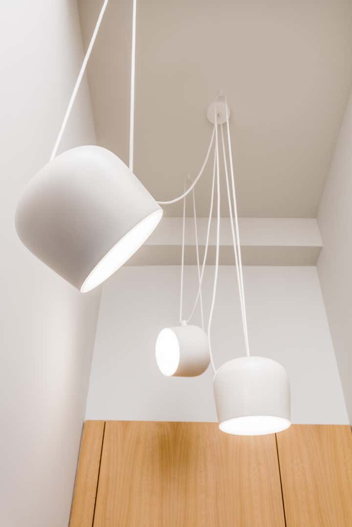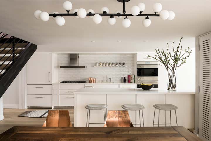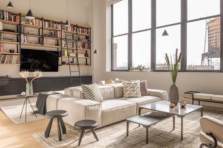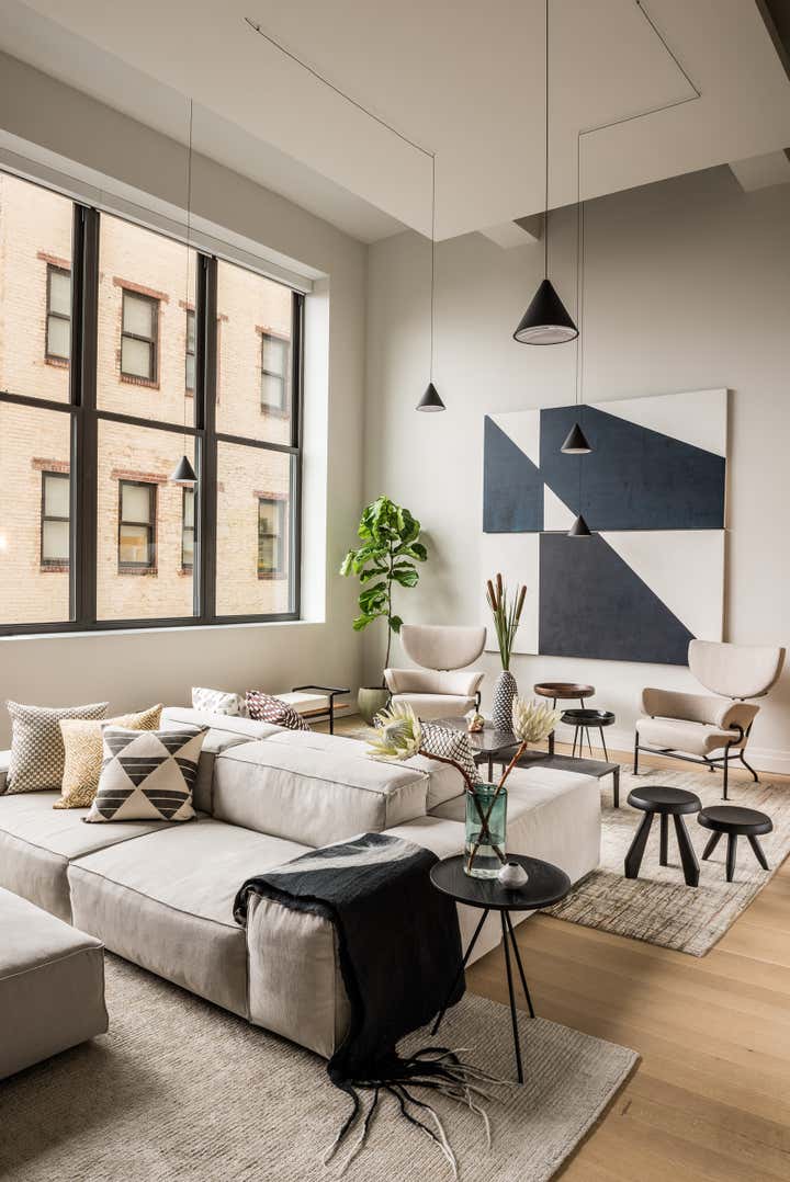 This loft living room has everything you could possibly want with its tall ceilings and massive amounts of light. We established a variety of uses in the space through clever compositions of furniture.The kitchen is a study in white. White tiles with a textured surface, white minimally detailed cabinetry, a white waterfall countertop and off-white stools.