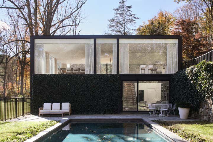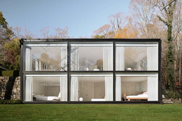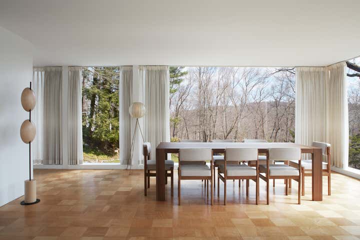This 1960s property is nestled in the Hudson Valley woodland. The Client was drawn to the rigor and organization of its plan and cell-like glass facades. The design of the interiors involved employing objects and materials with a sense of history, balancing their practical and poetic qualities. It also considered how the internal spaces would be experienced through the expansive floor-to-ceiling windows. The visual connections between out and in became paramount, and close attention was paid to the silhouettes viewed from the grounds—balancing positive and negative space through distinctive shapes—while ensuring harmony with the nature enjoyed from within.