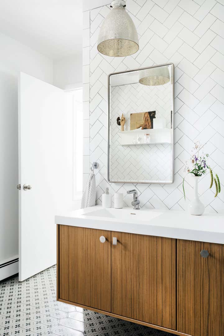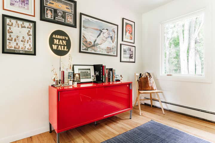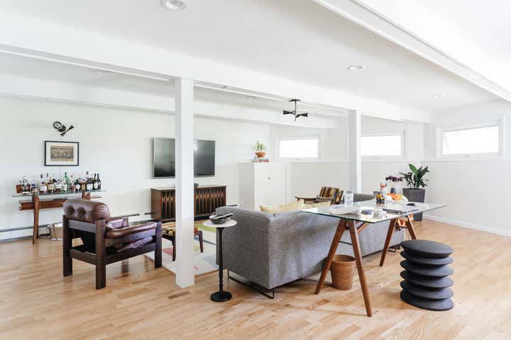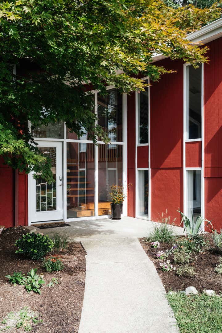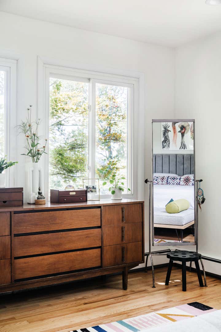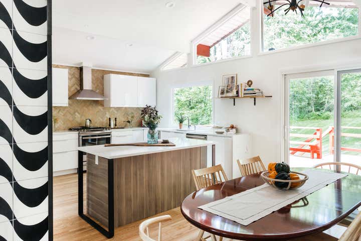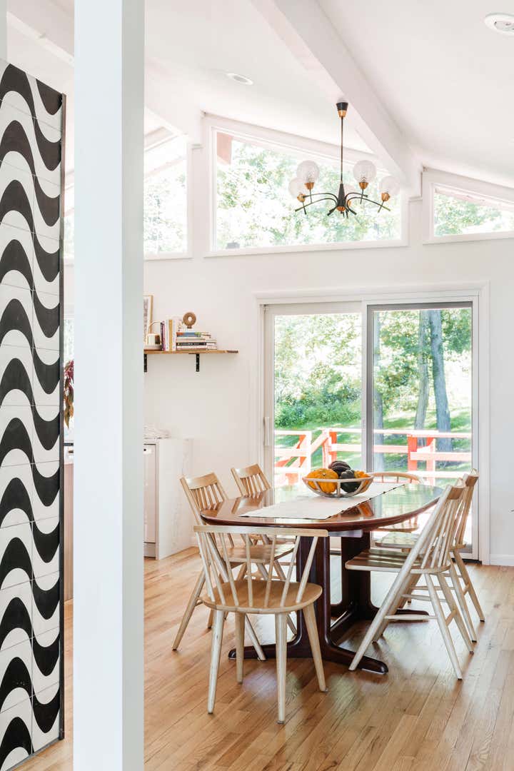 The great thing about this midcentury home in Hyde Park, New York, was its near-pristine 1950s condition when my husband and I purchased it in November 2016. It was also in dire need of a complete overhaul. Much of the home was out of date and not up to code, but the potential was clear. Nothing less than a full gut renovation was in order. The dramatic results can be seen in each room of the house. The exterior flower bed was updated with gabion walls, plants and mid-century style pony wall with house number. We also replaced the deck and added cable railings. The color of the house was always red and we embraced it fully. The entry/foyer was gutted to include slate tile floors used in the era but we modernized it with custom bookcases instead of railings between the entry and ground floor. Tandem Eames chairs and funky accessories finishes off the space nicely. The original living room had dark wood paneling throughout but we wanted a crisp white space to highlight our view. Because we have pets and intend on growing our family, we selected engineered velvet in a dark color. Vintage mid-century pieces and art work is spread throughout; a growing collection which will continue to grow through the years. To add more of our personality in the space we selected Rio inspired cement tiles for the fireplace living room. I am Brazilian and my husband loved the pattern from the Ipanema Beach sidewalks that inspired the graphic design of the tiles below. Beyond the fireplace you can see our dining room with a Rosewood mid-century table and contrasting light oak chairs. Between the kitchen and dining room there was a wall and we removed it immediately and updated the cabinets, finishes and appliances. To warm what could be a stark white lacquer kitchen, we added terracotta tiles and different wood tones. The master received a fresh coat of paint and more mid-century pieces inspired by the house’s architecture.