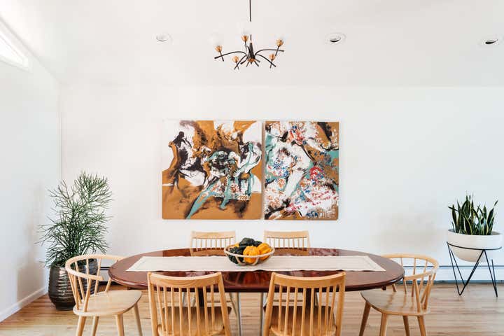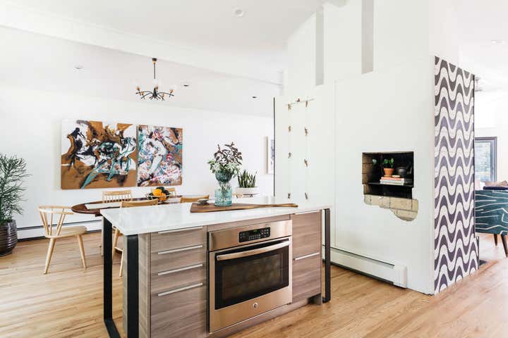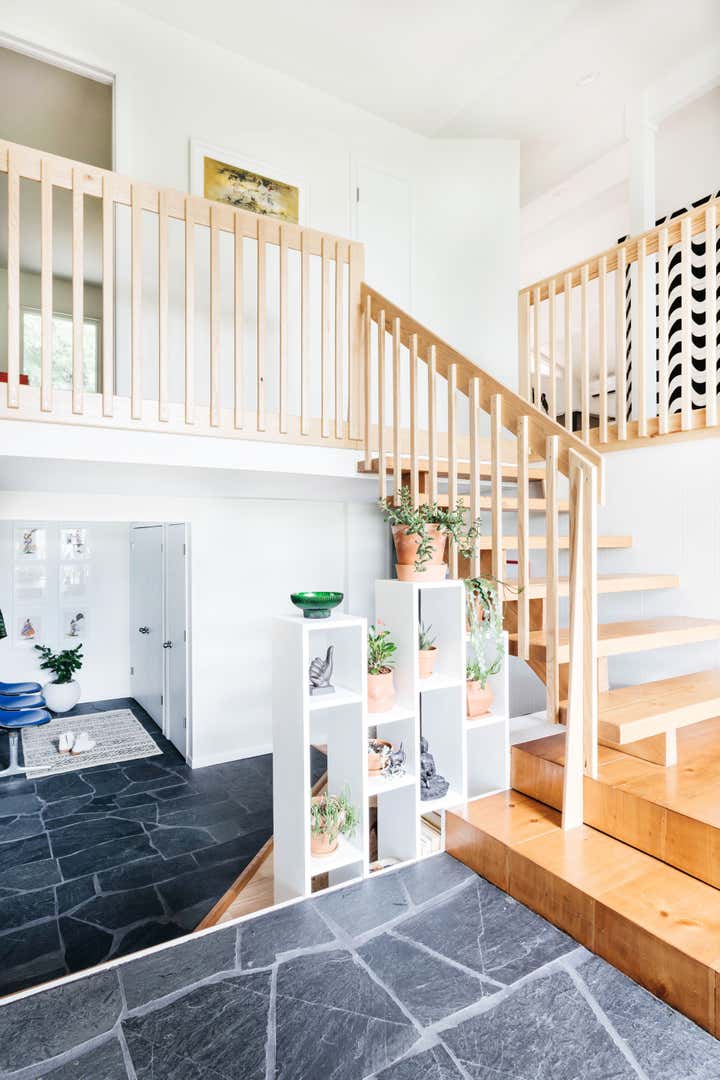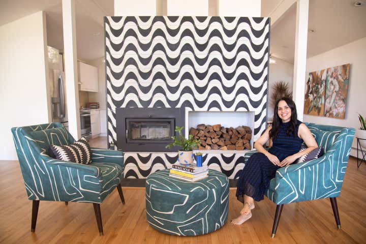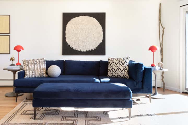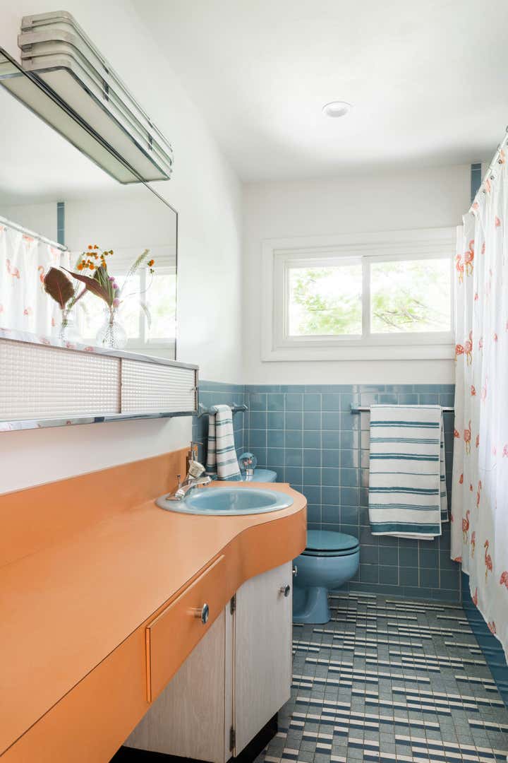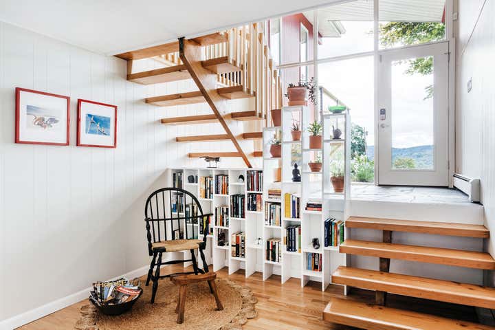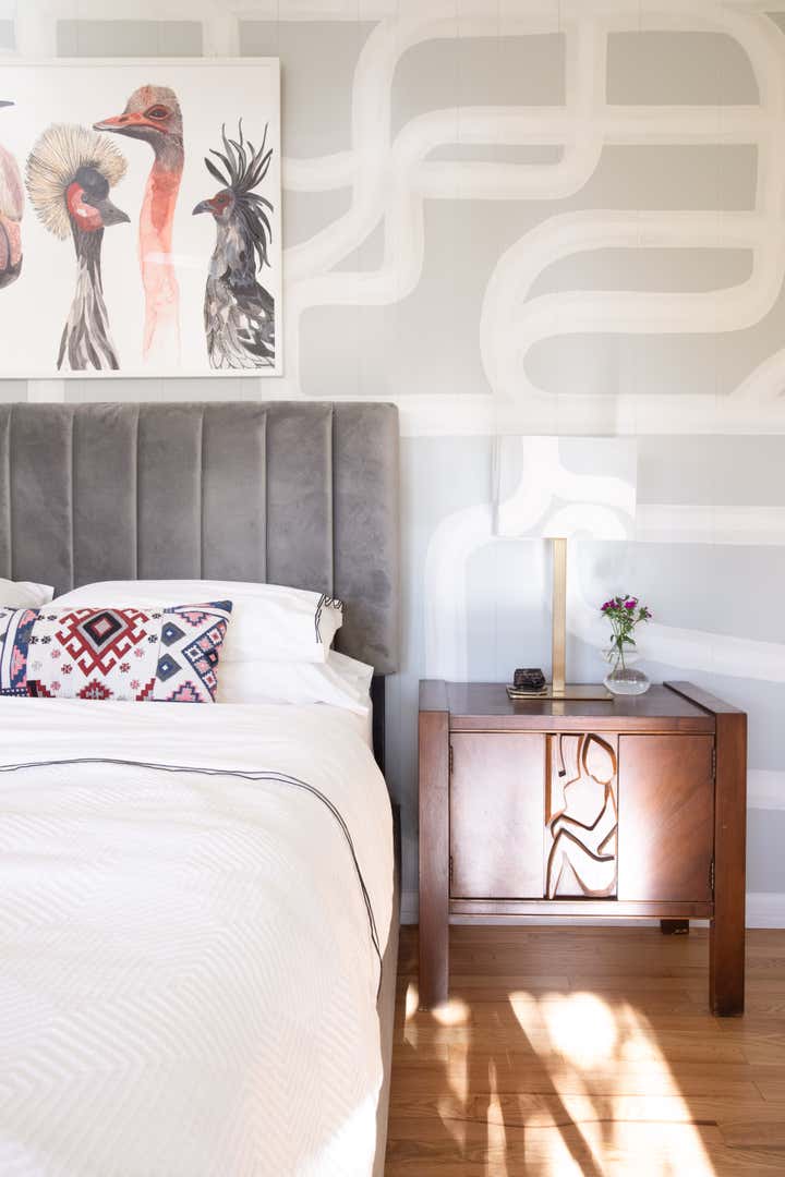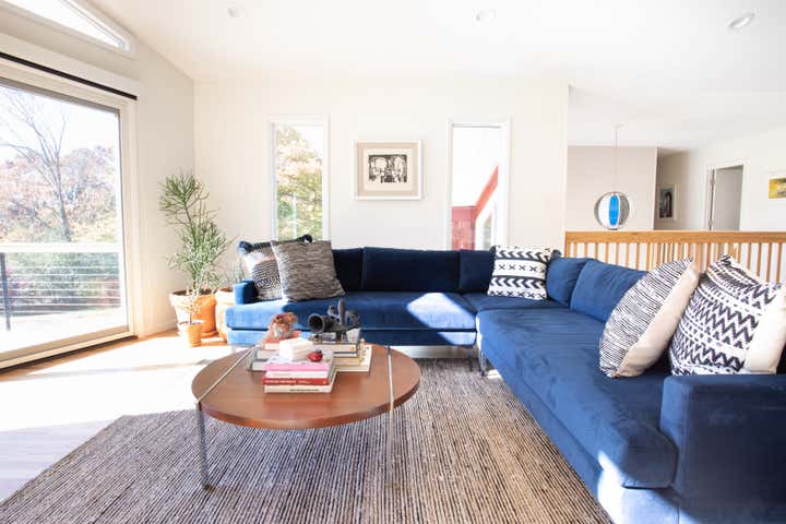 The great thing about this midcentury home in Hyde Park, New York, was its near-pristine 1950s condition when my husband and I purchased it in November 2016. It was also in dire need of a complete overhaul. Much of the home was out of date and not up to code, but the potential was clear. Nothing less than a full gut renovation was in order. The dramatic results can be seen in each room of the house. The exterior flower bed was updated with gabion walls, plants and mid-century style pony wall with house number. We also replaced the deck and added cable railings. The color of the house was always red and we embraced it fully. The entry/foyer was gutted to include slate tile floors used in the era but we modernized it with custom bookcases instead of railings between the entry and ground floor. Tandem Eames chairs and funky accessories finishes off the space nicely. The original living room had dark wood paneling throughout but we wanted a crisp white space to highlight our view. Because we have pets and intend on growing our family, we selected engineered velvet in a dark color. Vintage mid-century pieces and art work is spread throughout; a growing collection which will continue to grow through the years. To add more of our personality in the space we selected Rio inspired cement tiles for the fireplace living room. I am Brazilian and my husband loved the pattern from the Ipanema Beach sidewalks that inspired the graphic design of the tiles below. Beyond the fireplace you can see our dining room with a Rosewood mid-century table and contrasting light oak chairs. Between the kitchen and dining room there was a wall and we removed it immediately and updated the cabinets, finishes and appliances. To warm what could be a stark white lacquer kitchen, we added terracotta tiles and different wood tones. The master received a fresh coat of paint and more mid-century pieces inspired by the house’s architecture.