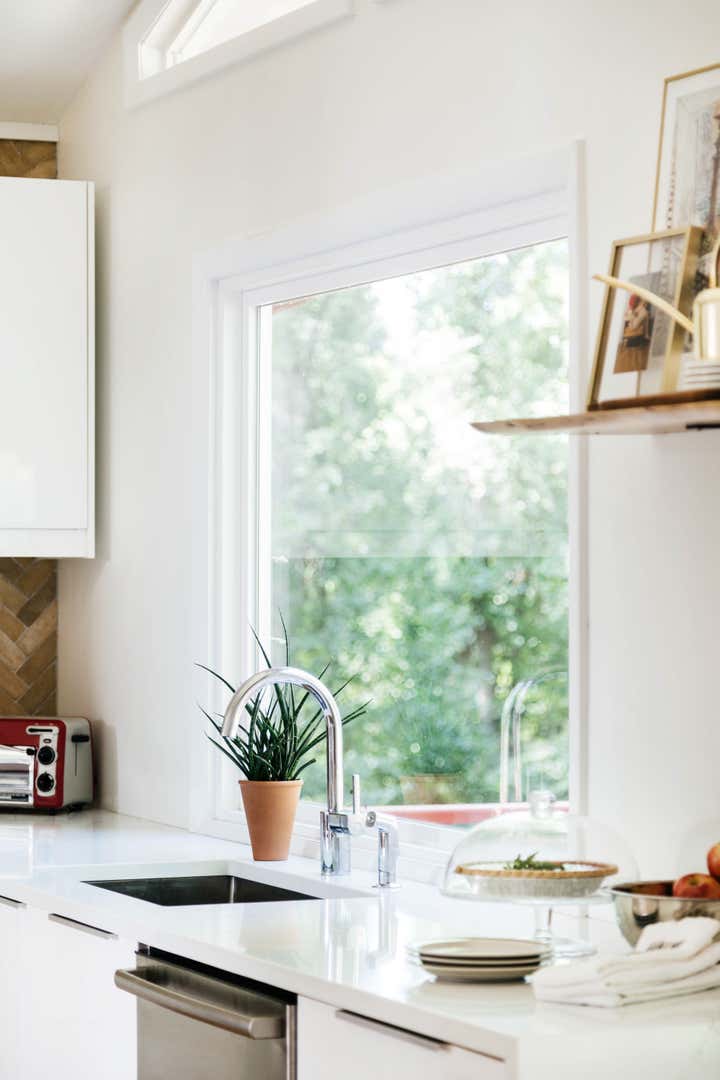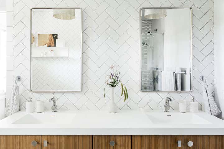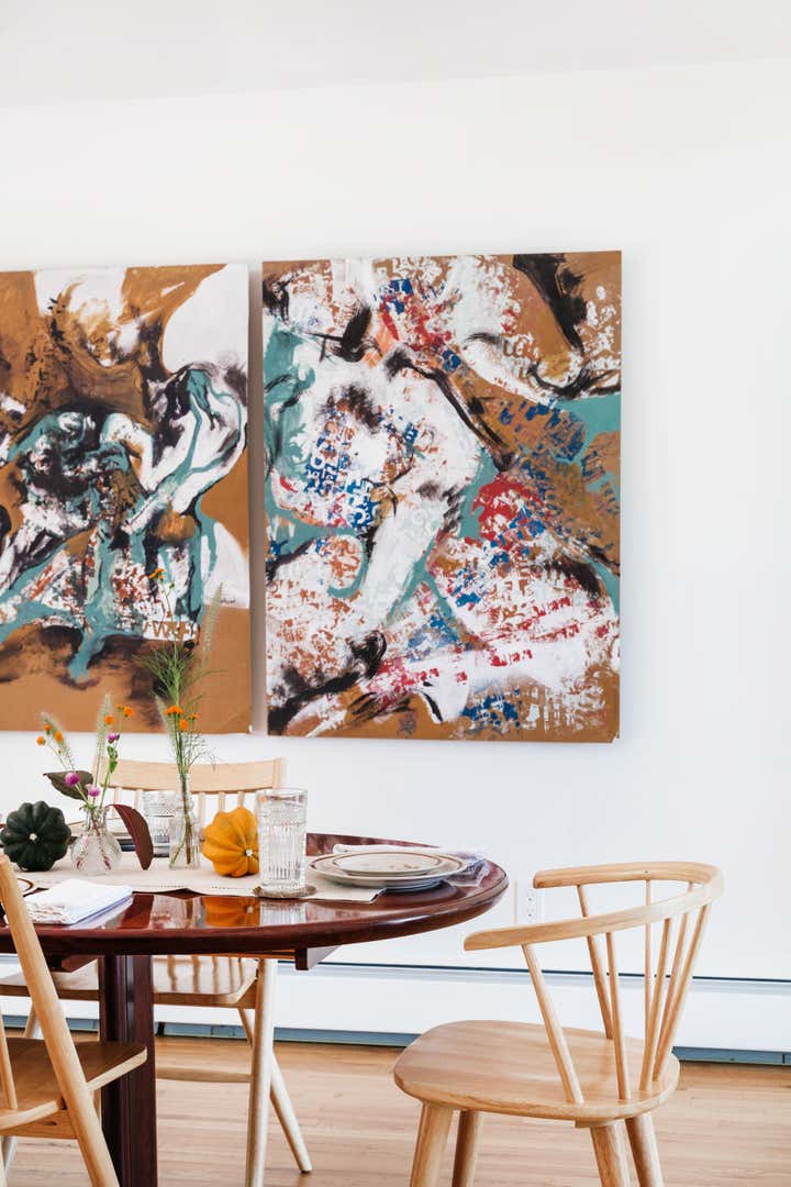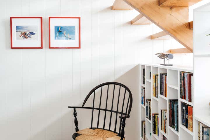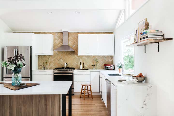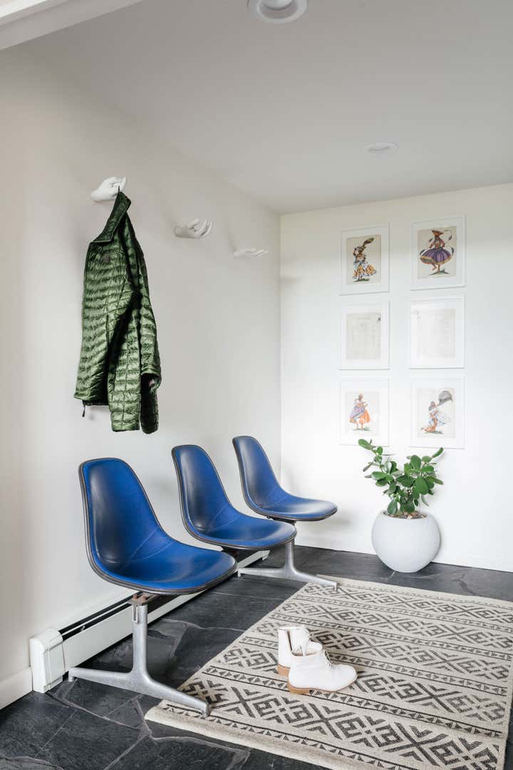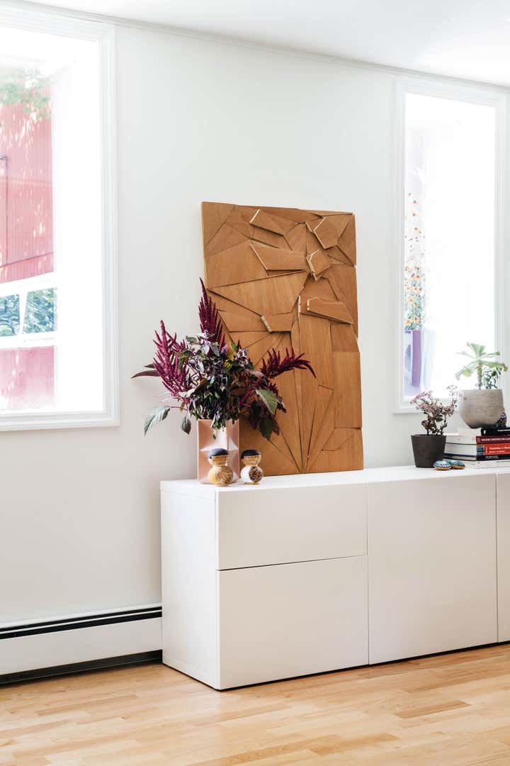 The great thing about this midcentury home in Hyde Park, New York, was its near-pristine 1950s condition when my husband and I purchased it in November 2016. It was also in dire need of a complete overhaul. Much of the home was out of date and not up to code, but the potential was clear. Nothing less than a full gut renovation was in order. The dramatic results can be seen in each room of the house. The exterior flower bed was updated with gabion walls, plants and mid-century style pony wall with house number. We also replaced the deck and added cable railings. The color of the house was always red and we embraced it fully. The entry/foyer was gutted to include slate tile floors used in the era but we modernized it with custom bookcases instead of railings between the entry and ground floor. Tandem Eames chairs and funky accessories finishes off the space nicely. The original living room had dark wood paneling throughout but we wanted a crisp white space to highlight our view. Because we have pets and intend on growing our family, we selected engineered velvet in a dark color. Vintage mid-century pieces and art work is spread throughout; a growing collection which will continue to grow through the years. To add more of our personality in the space we selected Rio inspired cement tiles for the fireplace living room. I am Brazilian and my husband loved the pattern from the Ipanema Beach sidewalks that inspired the graphic design of the tiles below. Beyond the fireplace you can see our dining room with a Rosewood mid-century table and contrasting light oak chairs. Between the kitchen and dining room there was a wall and we removed it immediately and updated the cabinets, finishes and appliances. To warm what could be a stark white lacquer kitchen, we added terracotta tiles and different wood tones. The master received a fresh coat of paint and more mid-century pieces inspired by the house’s architecture.