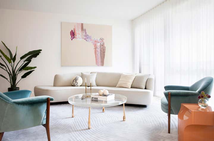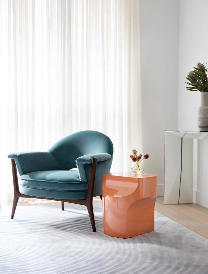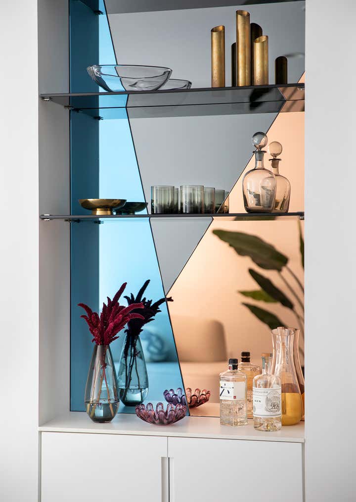 This family is not afraid of color or pattern, so we gave them ample doses of both! The living room features a curved sofa by Vladimir Kagan, vintage-inspired armchairs in blue velvet and an acrylic coffee table with sculptural brass legs. We transformed two niches in the dining area into a swanky bar with custom colored mirrors and glass shelves.