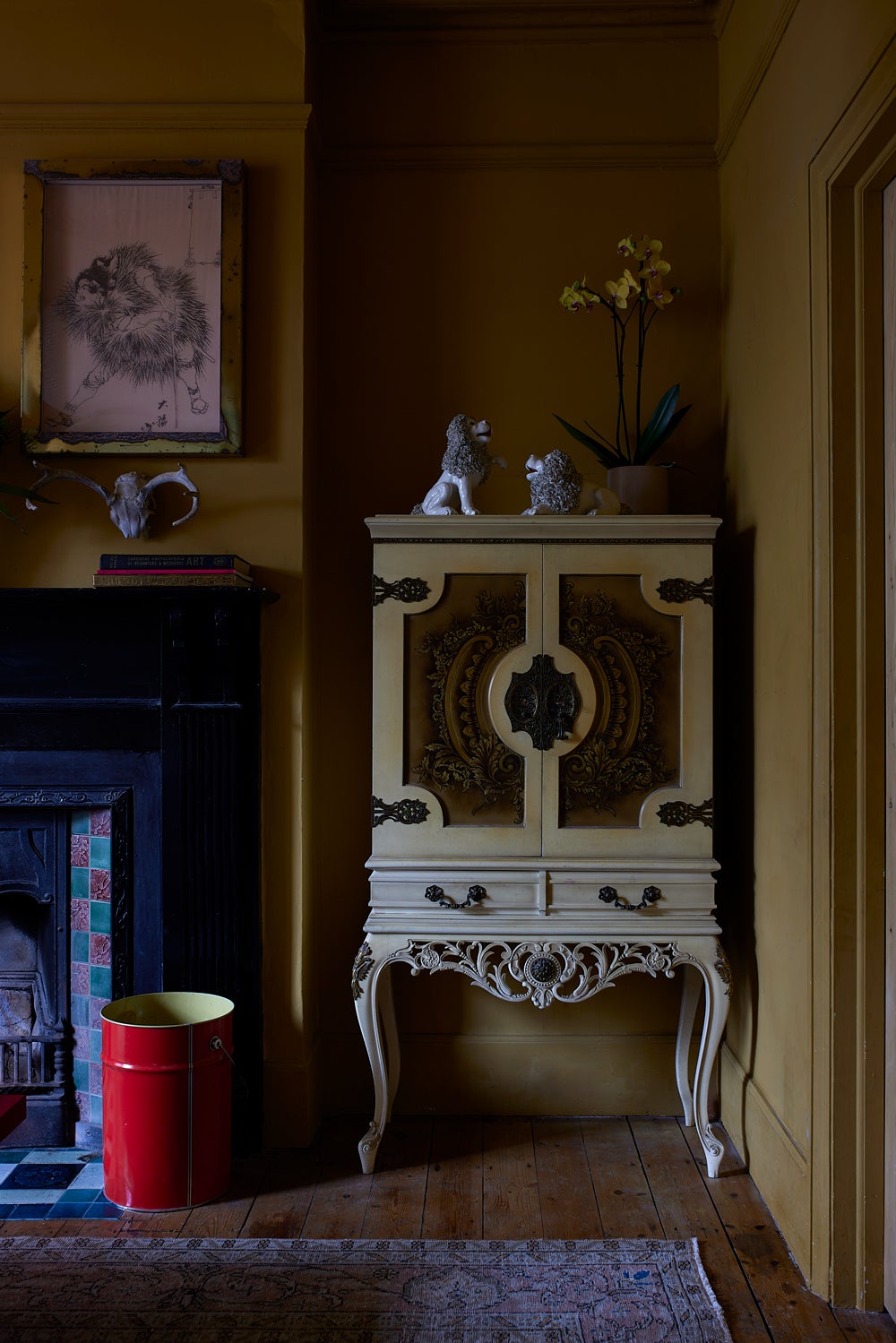 Throughout the home, Selway’s hand-painted murals, found in her daughters’ bedrooms and other spaces, reflect her painterly background and experimental spirit. In the powder room, a playful mural of limbs and gestures by artist Annelie Fawke, paired with her custom ceramic lighting, brings a sense of whimsy and warmth.