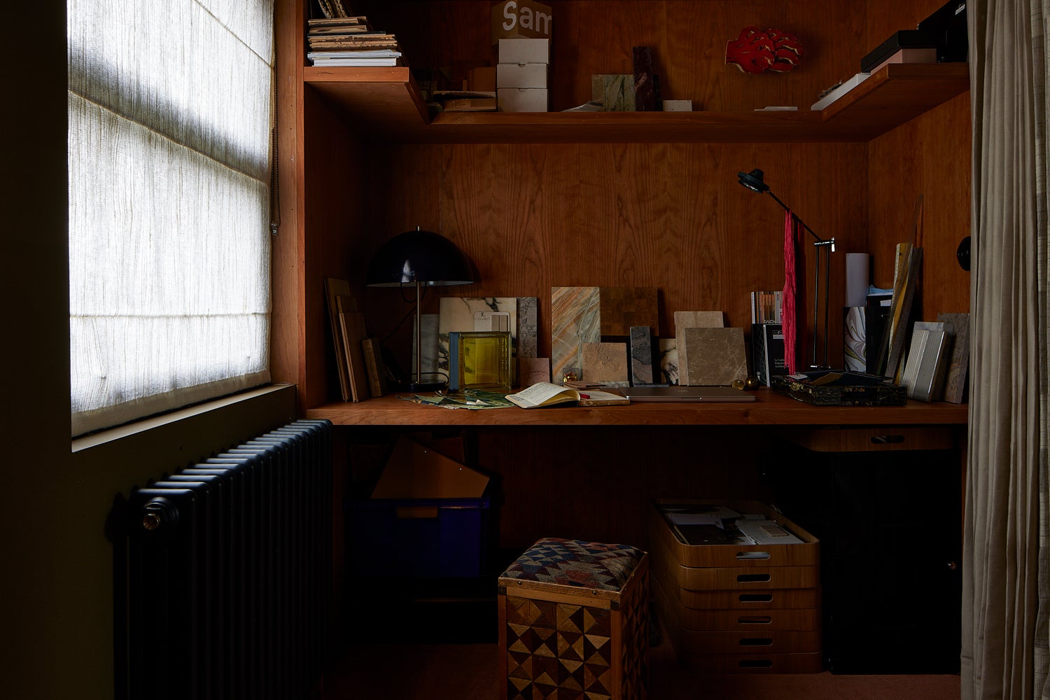 Repurposed heirlooms and salvaged materials layer the design with meaning: scrap leather and suede panel cabinetry, marble tiles from Selway’s childhood home frame the skylit clawfoot tub, and fabrics from her mother’s 1970s wedding dress are reimagined as bedding.
