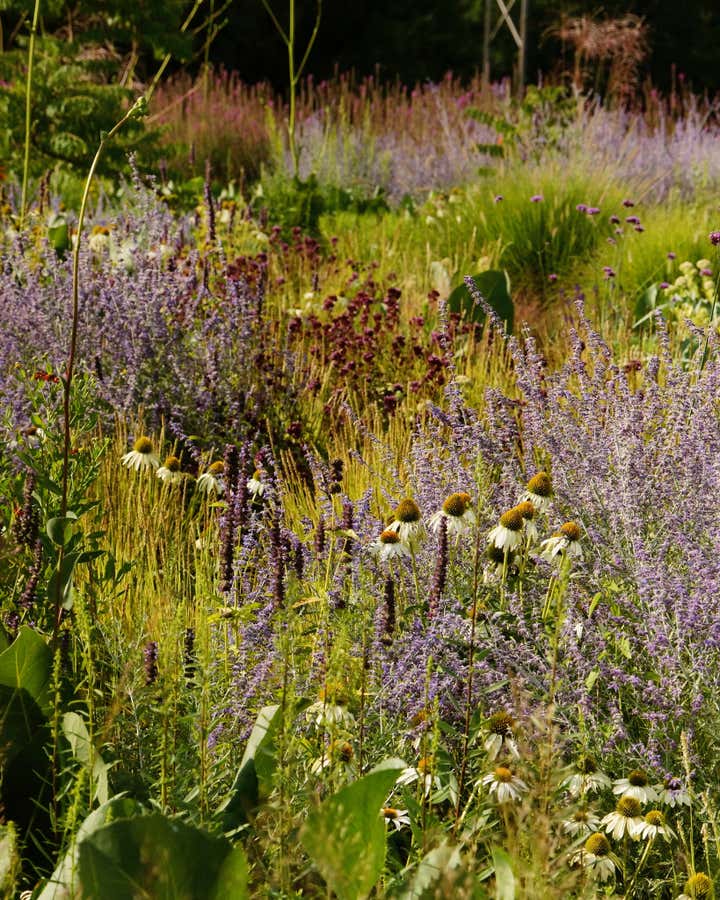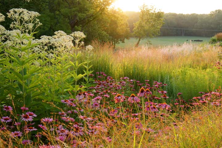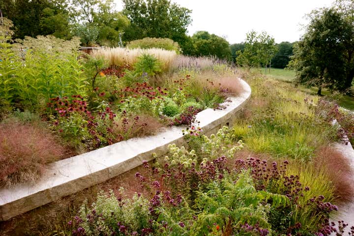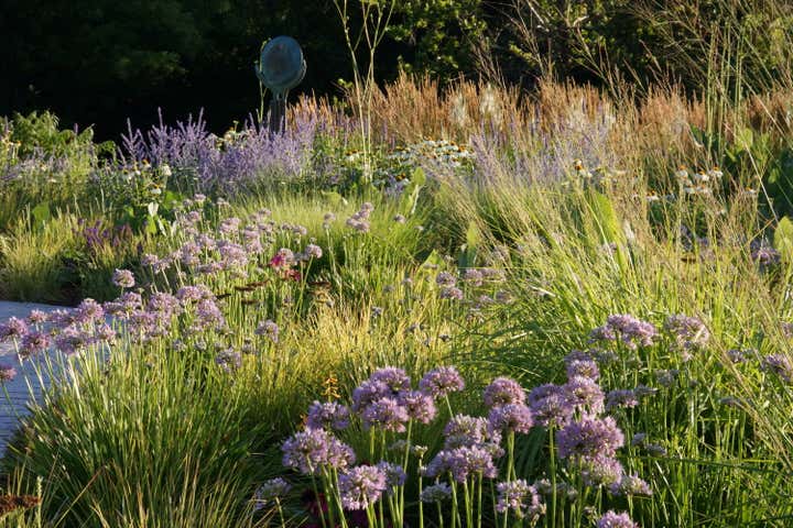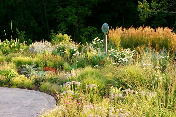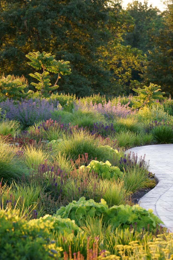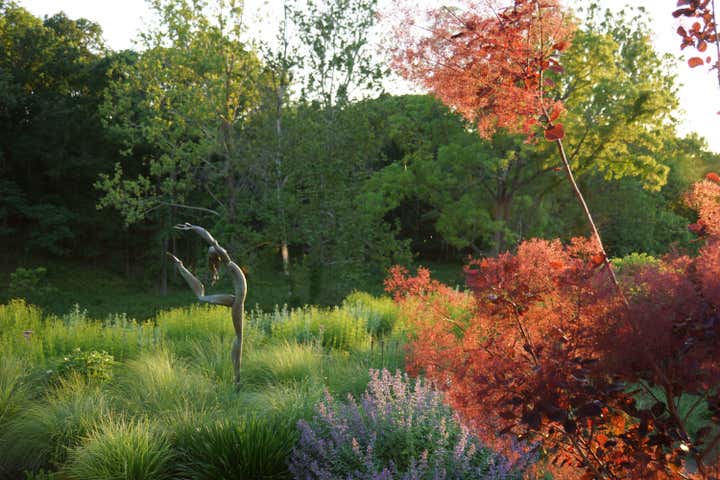We strive to connect our clients to nature and the larger landscape while creating a rich, evocative experience for them. Jones Road is one such example. Our clients, a middle-aged couple with grown children, were in the midst of a whole house renovation when they engaged us to design the landscape for their rural property. Their bi-level home is situated on a ridgeline with views of pasture, timber and a meandering creek. They requested a design that would be sensitive to the borrowed landscape and not disrupt their views. Woodruff imagined a grand, stylized prairie enveloping the home to compliment the charming pastoral setting. The property was largely turf with few trees and an existing pool surrounded by a poured concrete patio. The grade abruptly dropped off along the back of the house. Consequently, an entire hillside had to be moved and soil repositioned to accommodate expansive new beds. The bold move improved aesthetics and overall functionality. The new garden, nearly 20,000 square feet, seamless blends the wild and the domestic, bringing pollinators, birds and wildlife to the doorstep. Grasses form the foundation of Woodruff s naturalistic design, a matrix through which shrubs, perennials, natives and bulbs emerge. Plants are artfully woven together to insure a diverse and visually dynamic display with good bloom succession and seasonal interest. The feeling is spontaneous and natural. Patinaed sculptures of bronze and brass are recent additions. Their graceful feminine forms enhance the grassy garden providing year-round focal points and adding a touch of whimsy.