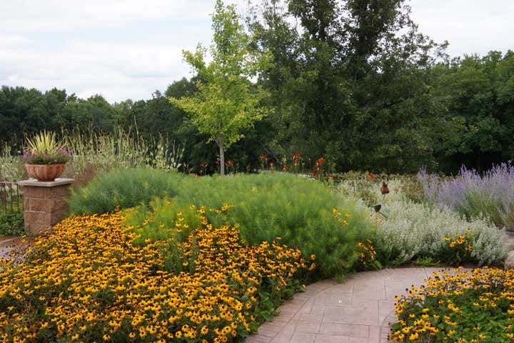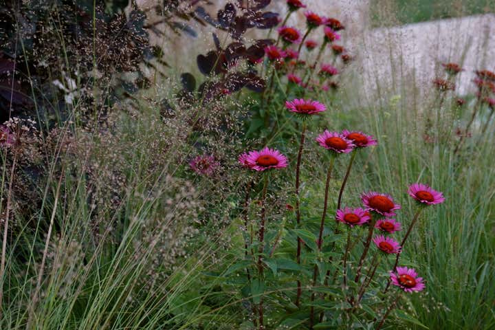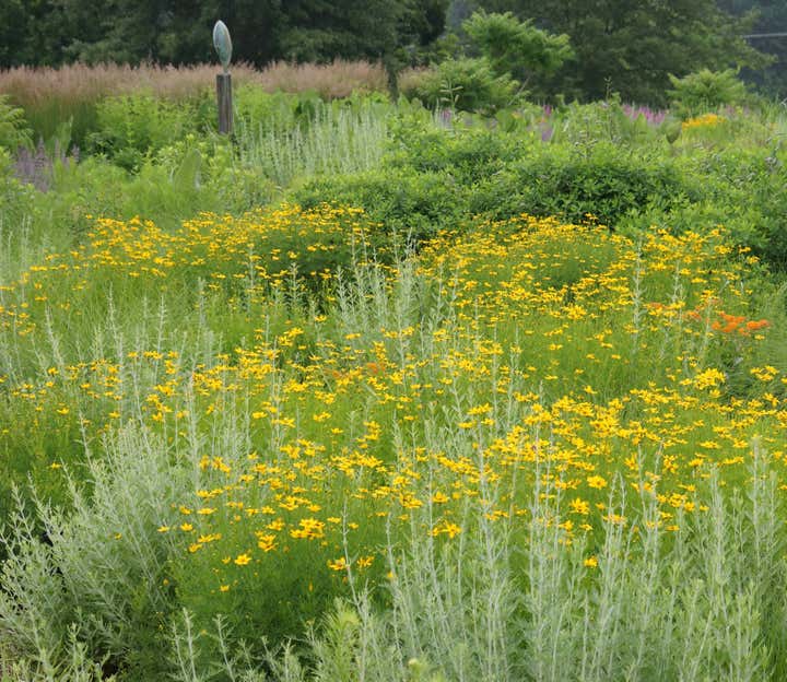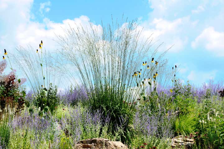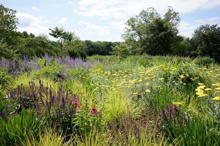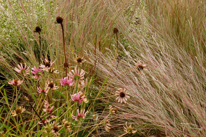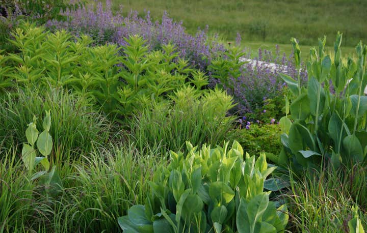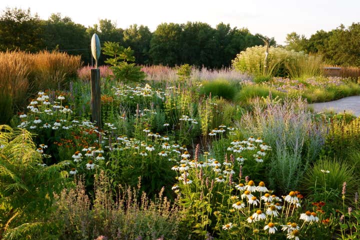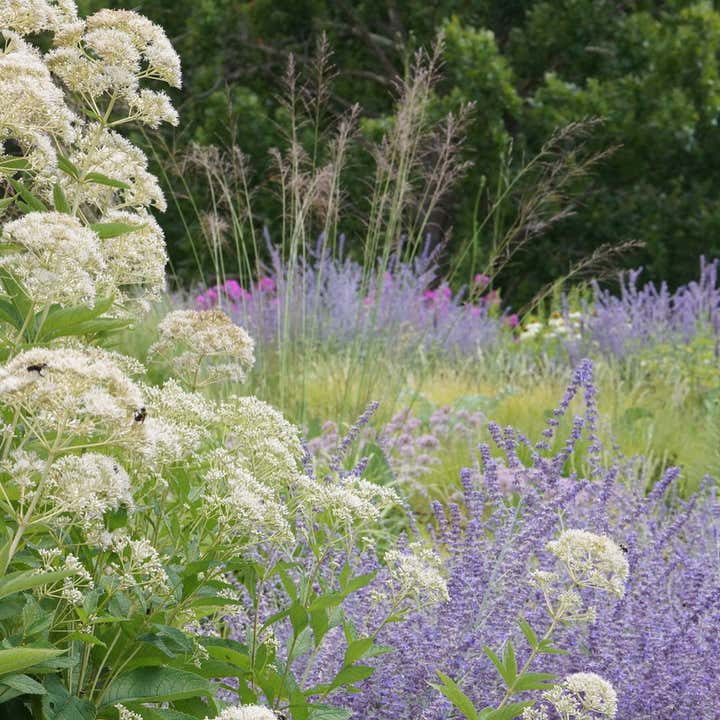 We strive to connect our clients to nature and the larger landscape while creating a rich, evocative experience for them. Jones Road is one such example. Our clients, a middle-aged couple with grown children, were in the midst of a whole house renovation when they engaged us to design the landscape for their rural property. Their bi-level home is situated on a ridgeline with views of pasture, timber and a meandering creek. They requested a design that would be sensitive to the borrowed landscape and not disrupt their views. Woodruff imagined a grand, stylized prairie enveloping the home to compliment the charming pastoral setting. The property was largely turf with few trees and an existing pool surrounded by a poured concrete patio. The grade abruptly dropped off along the back of the house. Consequently, an entire hillside had to be moved and soil repositioned to accommodate expansive new beds. The bold move improved aesthetics and overall functionality. The new garden, nearly 20,000 square feet, seamless blends the wild and the domestic, bringing pollinators, birds and wildlife to the doorstep. Grasses form the foundation of Woodruff s naturalistic design, a matrix through which shrubs, perennials, natives and bulbs emerge. Plants are artfully woven together to insure a diverse and visually dynamic display with good bloom succession and seasonal interest. The feeling is spontaneous and natural. Patinaed sculptures of bronze and brass are recent additions. Their graceful feminine forms enhance the grassy garden providing year-round focal points and adding a touch of whimsy.
