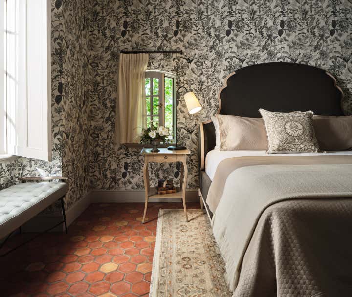 Haidamus’ design included imbuing each suite with its own unique personality. The stucco walls were replaced with elegant plaster, beams were stained, botanical wallpapers replaced wall tiles, the original hexagon Terracotta floor tiles (originally imported from the South of France) were honed and preserved.