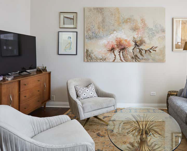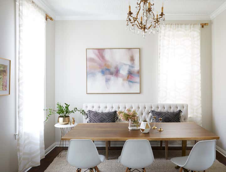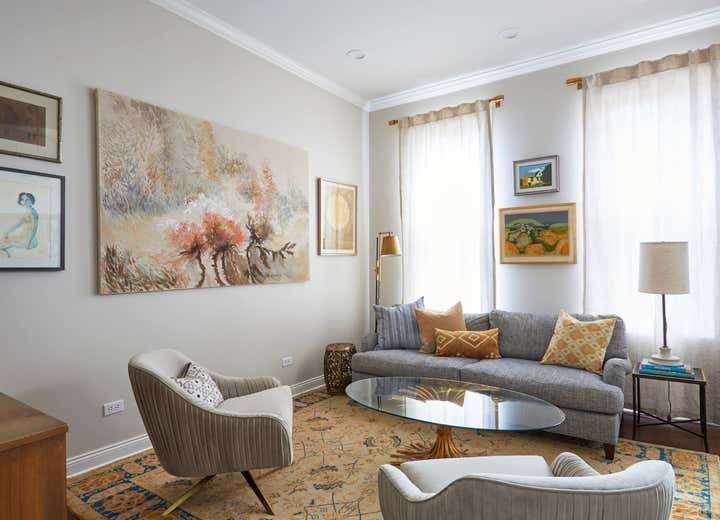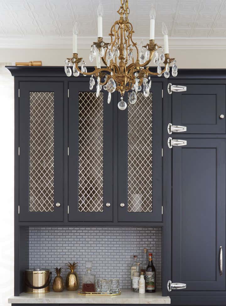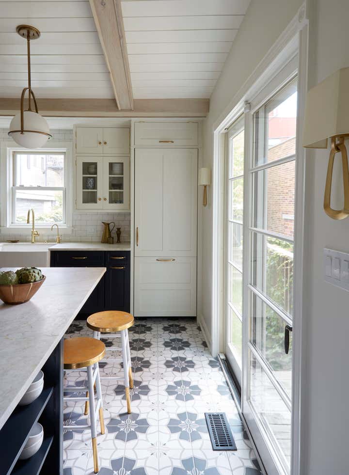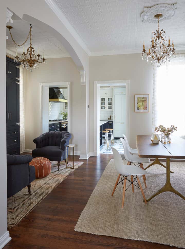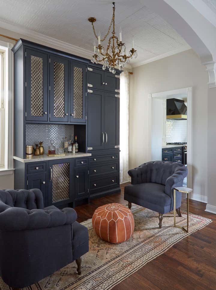 The Julian project is a cute brick bungalow located in Chicago’s Bucktown neighborhood. It’s a great starter home that KitchenLab Interiors renovated for a young client – including the kitchen and entire first floor including furnishings. A builder grade addition which included the kitchen was thoughtlessly tacked on in a previous renovation. The kitchen stepped down into that space and was an afterthought with cheap vinyl siding, a sliding patio door and a tiny window. We converted a bedroom into a bar and lounge area that’s open to the dining room and the kitchen. To save on structural work instead of opening the kitchen entirely to these other 2 rooms, we used the existing door and converted an old covered up window into another doorway. We also added other architectural elements- an elliptical arch between the bar and dining room, corbels, ceiling medallions, and wood trim around the doors. Vintage rugs and chandeliers balance out the new dining room and living room furnishings. Custom cabinetry, finishes, fixtures and furnishings provided by KLI.