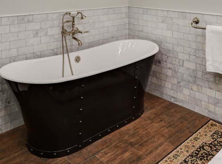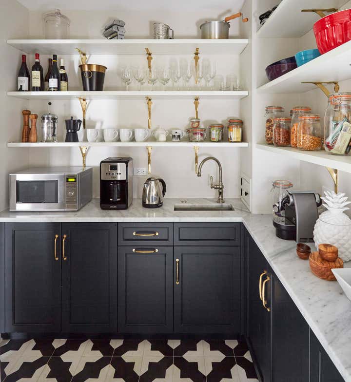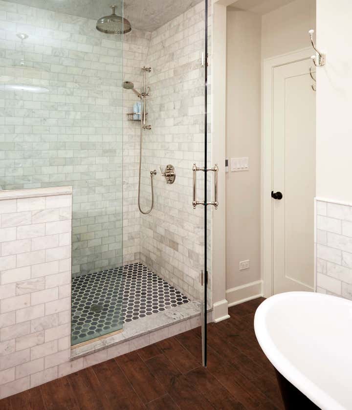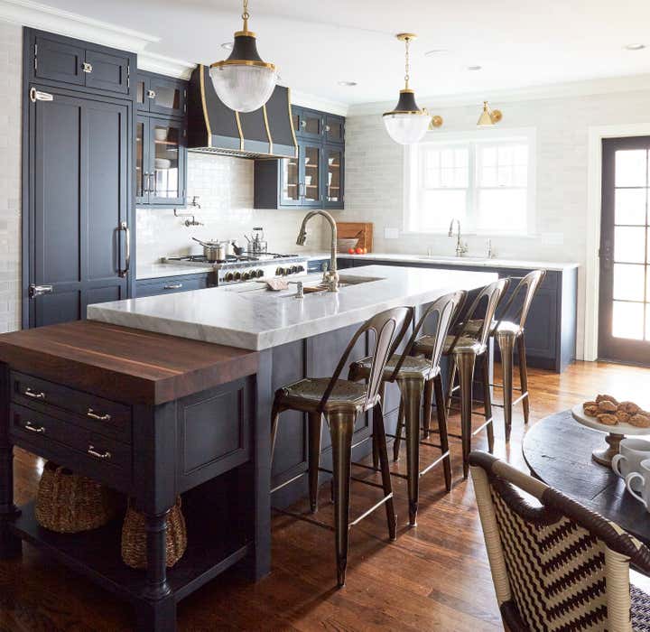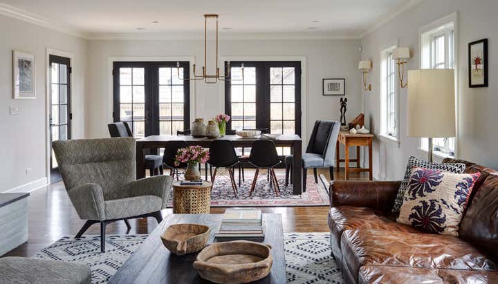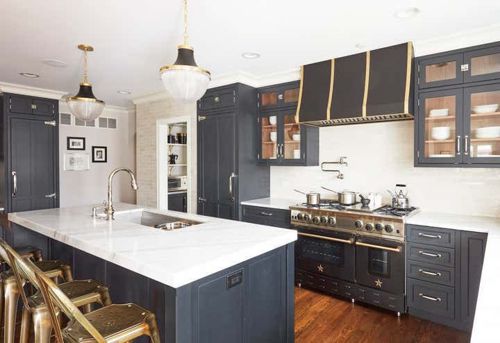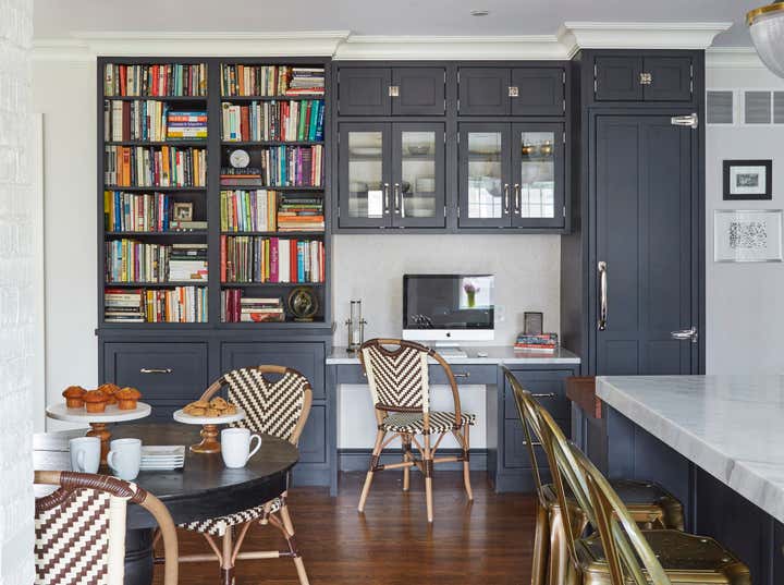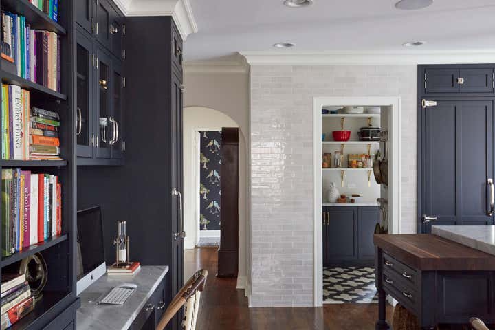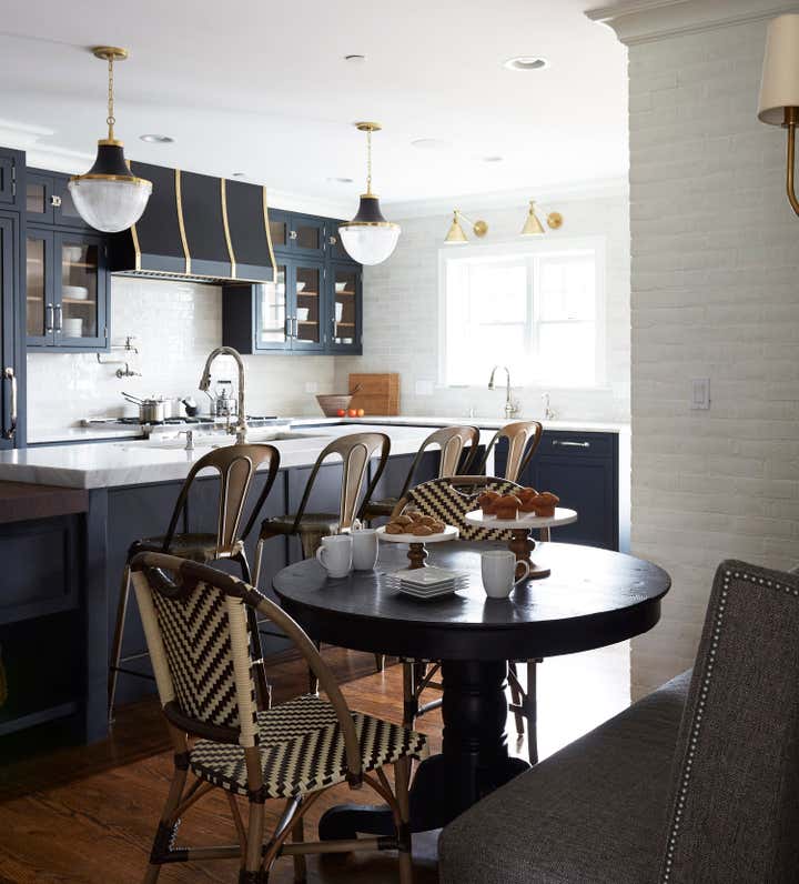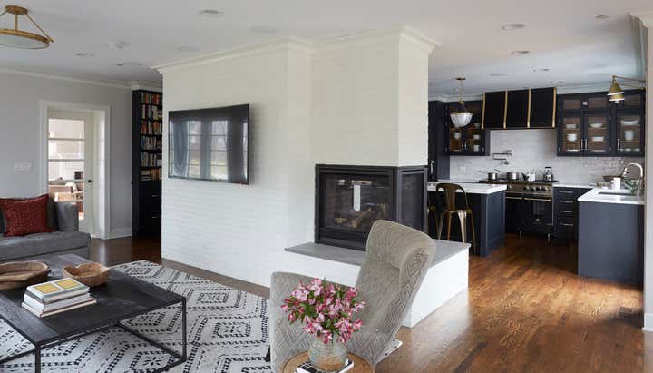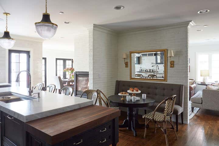 This family had just moved back to the Midwest from northern California and was looking for a mix of California casual with a midwestern sensibility. Like many of the projects at KitchenLab Interiors, this scope involved a new addition and a full gut rehab of the existing home. In addition to designing the interiors, KLI modified the architect’s original plan, by adding walk-through pantry off the mudroom entrance. KLI was responsible for renovating 3 bathrooms upstairs, including the new master suite and master bath, powder room, mudroom and interior furnishings. An awesome three-sided fireplace that KitchenLab Interiors designed to break up the space also houses a breakfast nook and gives the family room a wall for the television. We sourced the reclaimed Chicago brick, which had been sliced into thin brick, and painted it white to brighten up the space and provide a counterpoint to the ink black cabinetry and French doors. Custom cabinetry, finishes and fixtures provided by KLI.