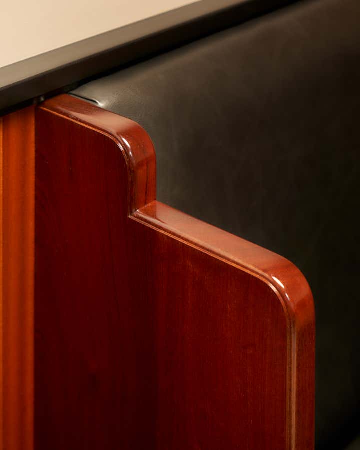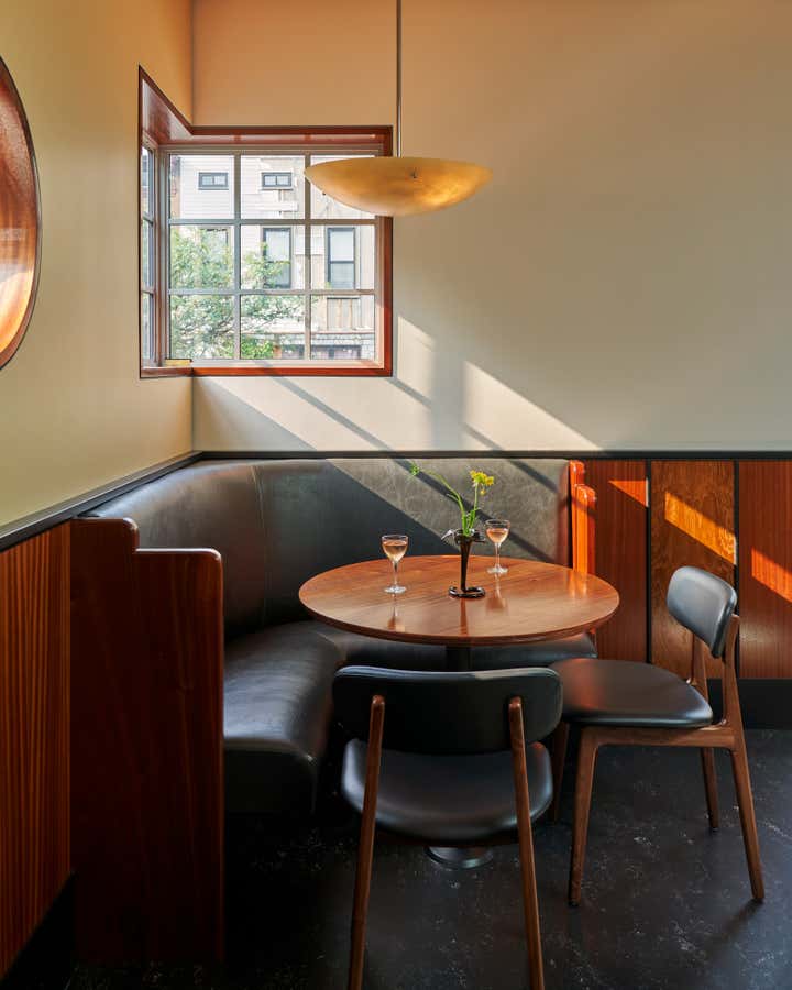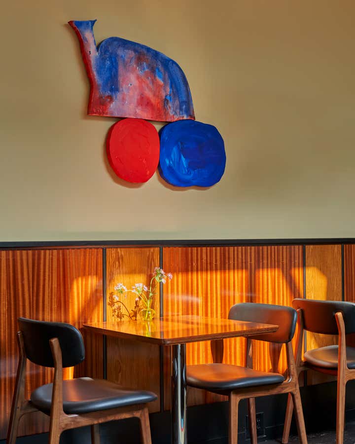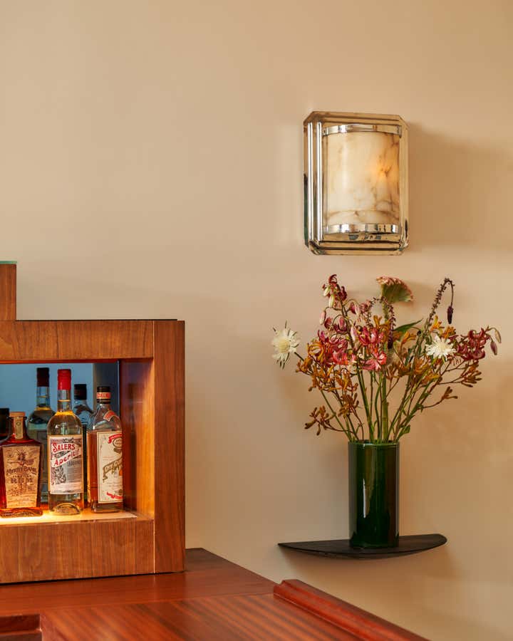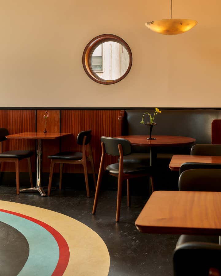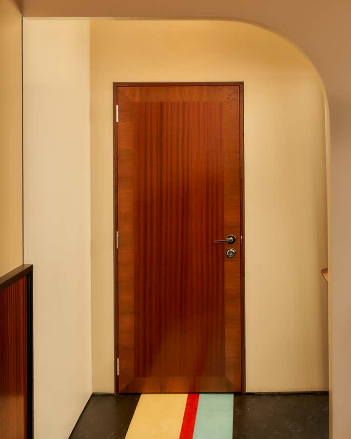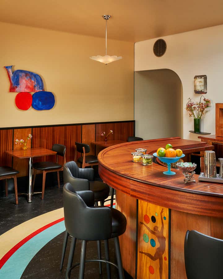 Salle approached the design with meticulous construction details while navigating the unique constraints of the site. Upstairs, the custom art deco bar was carefully restored and is framed by a colorful pathway. The woodwork is a mix of mahogany, walnut, and teak joined and assembled with precision.