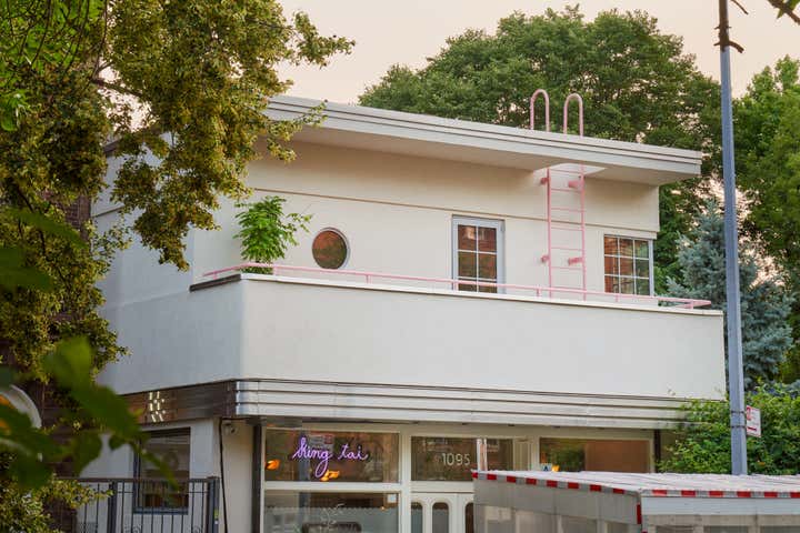 King Tai was designed as an oasis for the neighborhood. Over the last 150 years, the building has lived many lives— from a workshop for the local suit tailor to a fast-and-casual Chinese Seafood Restaurant. By 2015, it was an abandoned shell with a dirt floor sitting next door to a beloved Community Garden. Located just off the commercial strip of Nostrand Avenue, Salle conceived of a local gathering space that could be both transportive and welcoming. Art deco details and pastel colors evoke warmer climates. Today, King Tai has transformed into a neighborhood favorite. A two-story modern structure where friends can come together to share craft cocktails, listen to Brooklyn DJs, and sample from a rotating menu of food pop ups by emerging chefs.