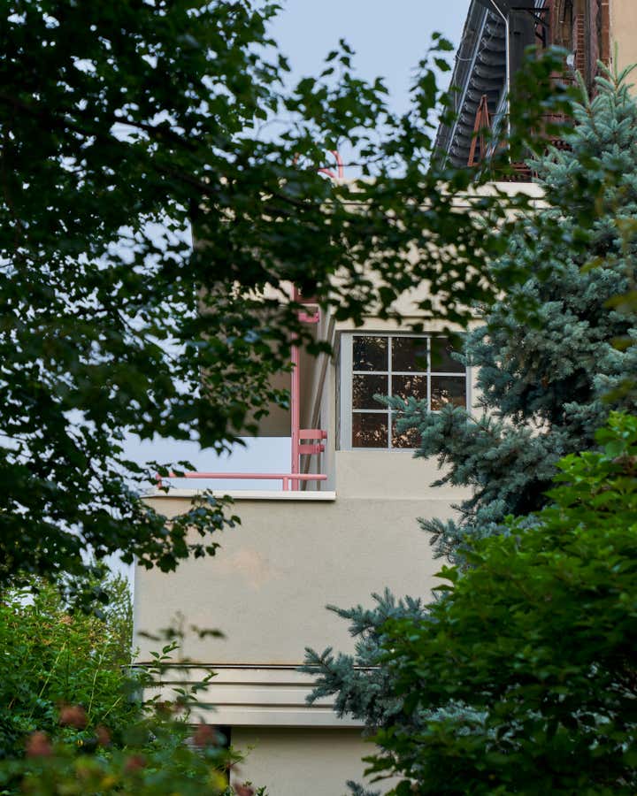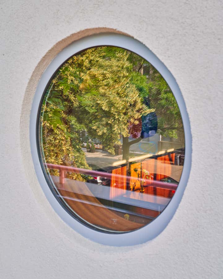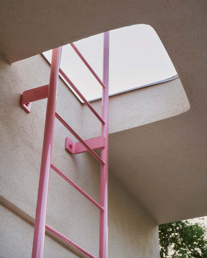 The 2nd-floor extension is illuminated by day with a large central skylight and by night with alabaster pendants. Due to the building constraints, developing the second story was an exciting challenge resulting in unique architectural solutions, like the small porthole windows and a pink powder-coated ladder—a playful roof access solution on the street-front façade.
