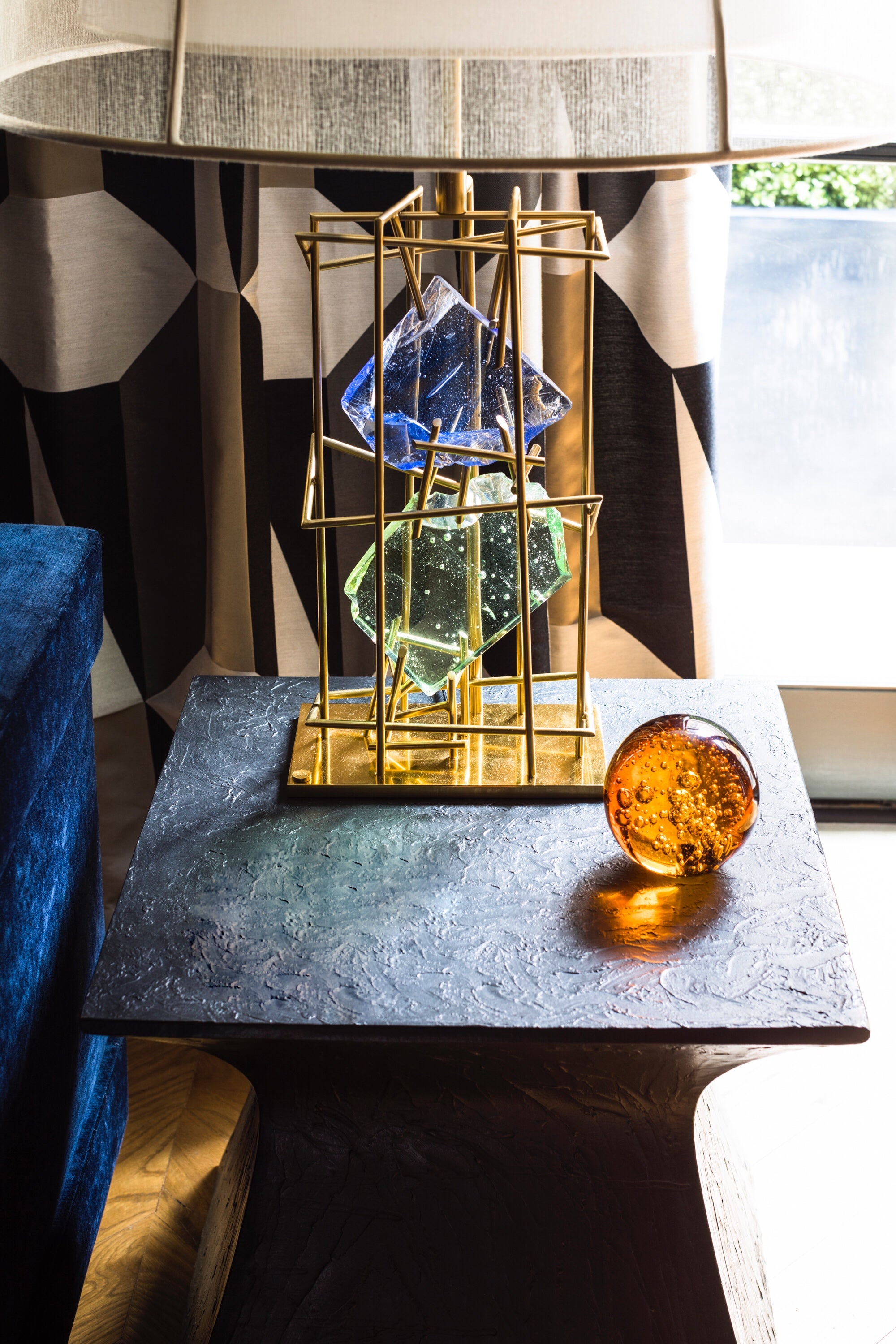“The Afterparty”, the room I created for the prestigious 2018 Kips Bay Decorator Show House, was designed as a cocktail intended to pique the senses. You didn t just look, but touched and felt my 70s-inspired homage to playful decadence and indulgence. Luxurious textures filled the room, making for a highly tactile environment. From the cerused oak of the custom millwork, brass of the stools and coffee table, crystal of the lamps, plush velvet and mohair of the upholstery, shimmery black and gold wheat inspired fabric of the Hermes throw pillows, and chunky honed stone of the fireplace and bar counter, this room was made to touch. The hushed, private feel of this late night sanctuary was replete with wrap-around bar, smoking terrace, deep sectional seating and fireplace, and intended for the most discerning night owls. Dark gold-foil cork wall covering absorbed sound and created a shimmering effect, while the gold-foiled ceiling adds glamour and visual height. Filled with striking artwork by Kehinde Wiley, Ellen von Unwerth, Charles Lutz, Maynard Monrow, and Andrew Brischler, “The Afterparty” room featured a television playing a specially commissioned B.A. Torrey video art piece entitled “BONDrian: License to Love”, highlighting James Bond kissing his most notable "Bond Girls,” and set to an ever changing color wash of Mondrian’s primary colors. As a testament to the quality of the items on loan from my vendors, upon the sale of the townhouse, the new owner opted to purchase nearly the entire room, from rugs, lighting, sofa, stools, to the tables and window treatments! An unheard of coup for any show house, and something I am extremely honored to have been part of.