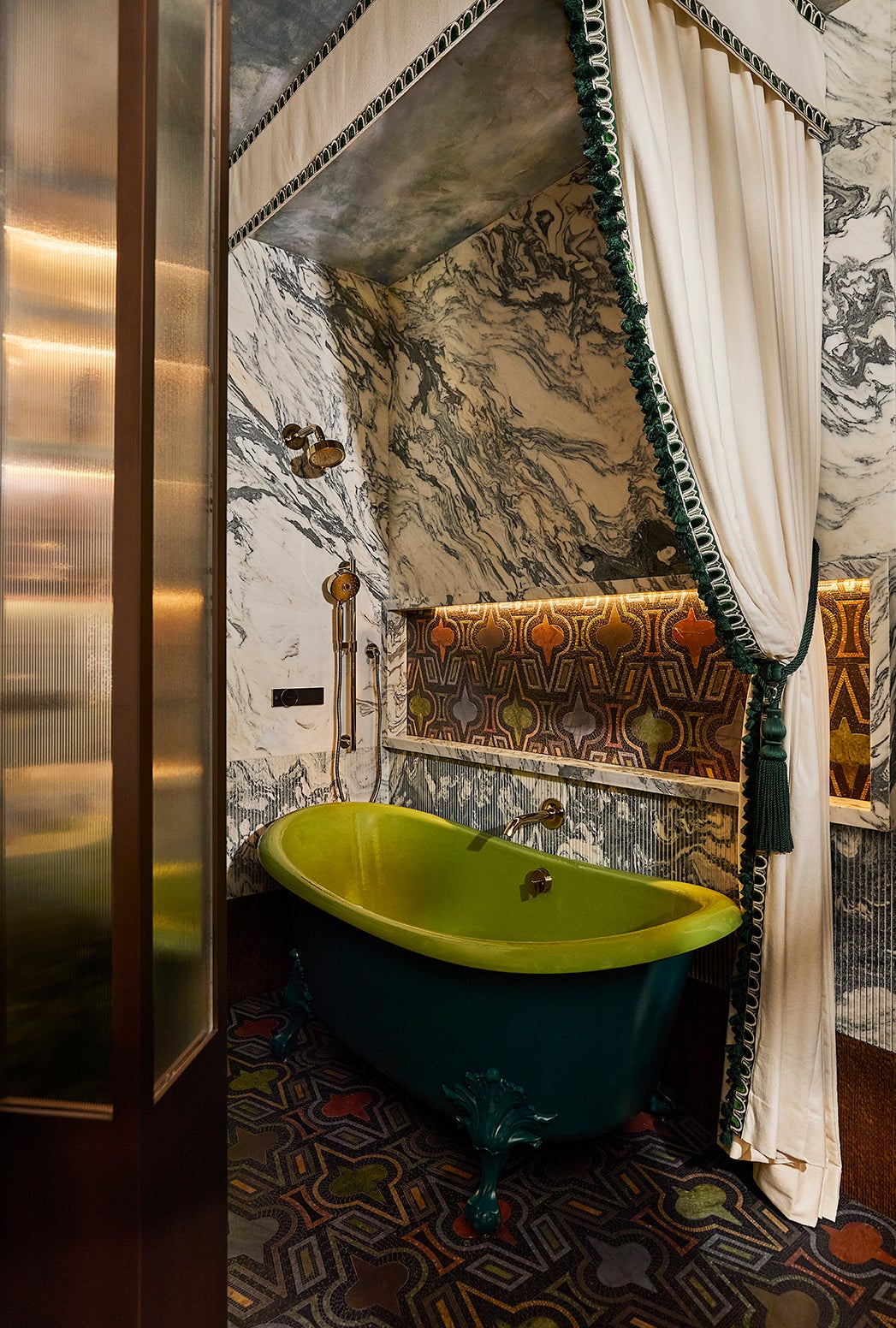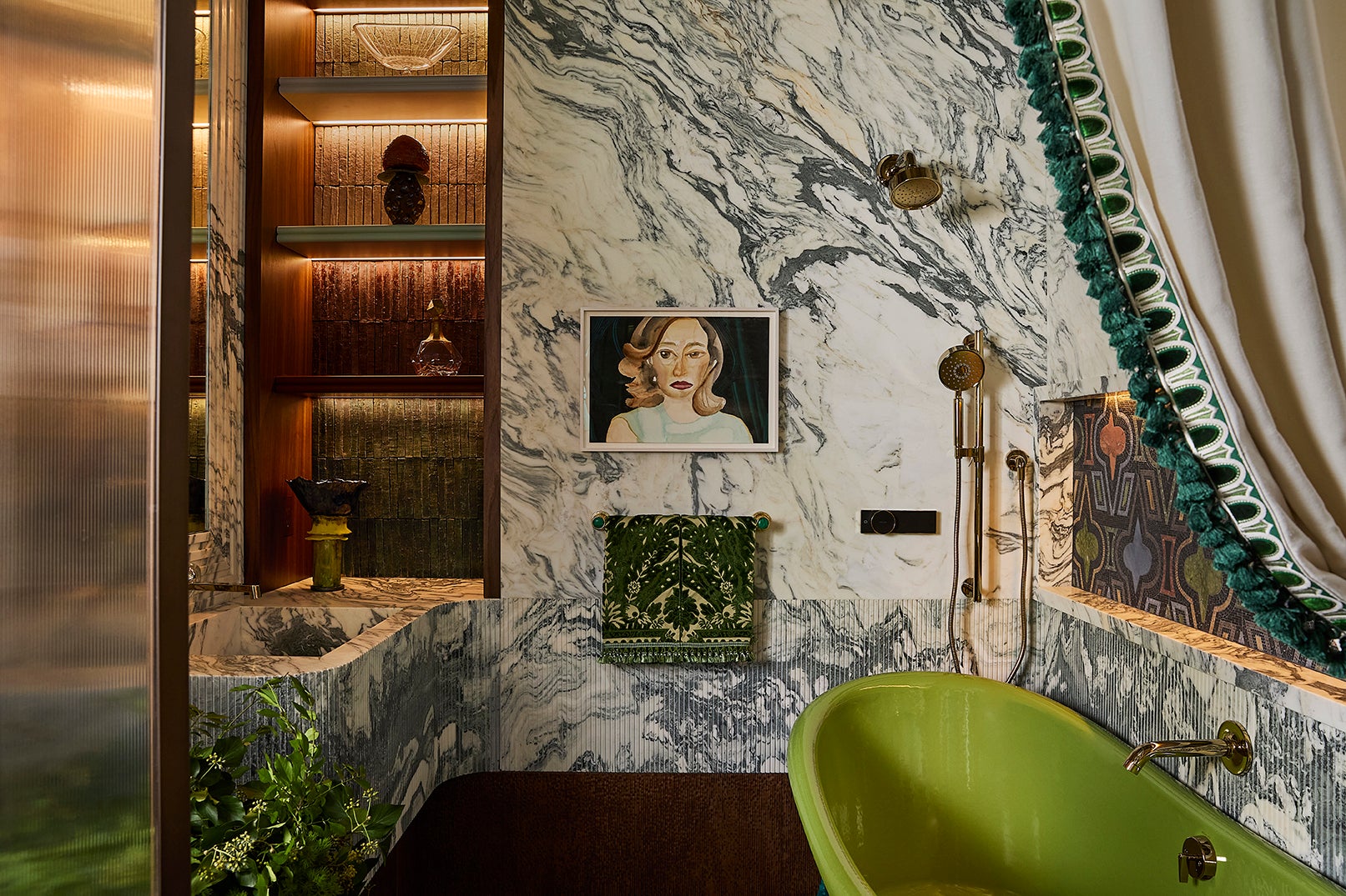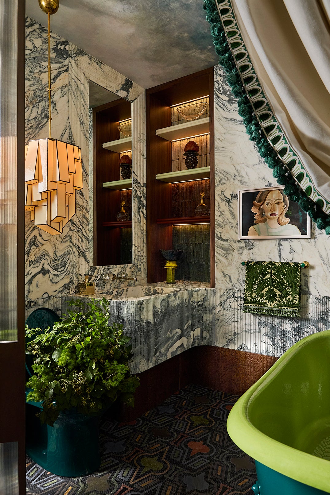 The debut of Artistic Tile’s Casino Royale mosaic anchors the design, complemented by Cipollino Verde marble, sculptural millwork, and a lime-green Kohler clawfoot tub framed with fabric and fringe. A Campana Brothers mirror and a personal portrait by Italian painter Francesco Clemente bring an artful dimension, while jewel-like brass hardware and layered lighting complete the atmosphere.