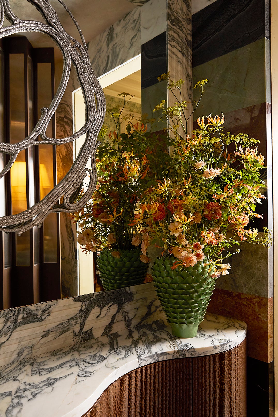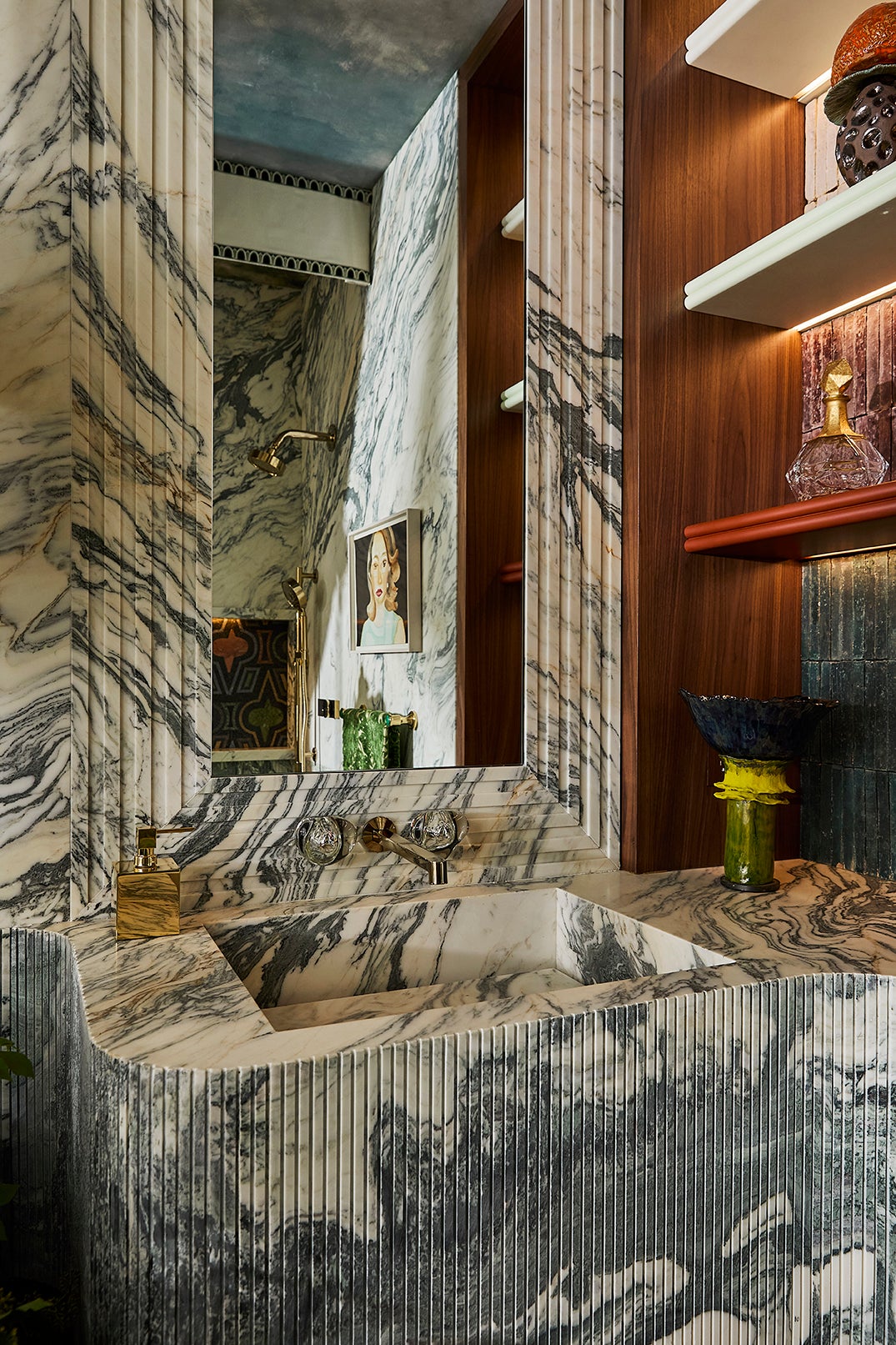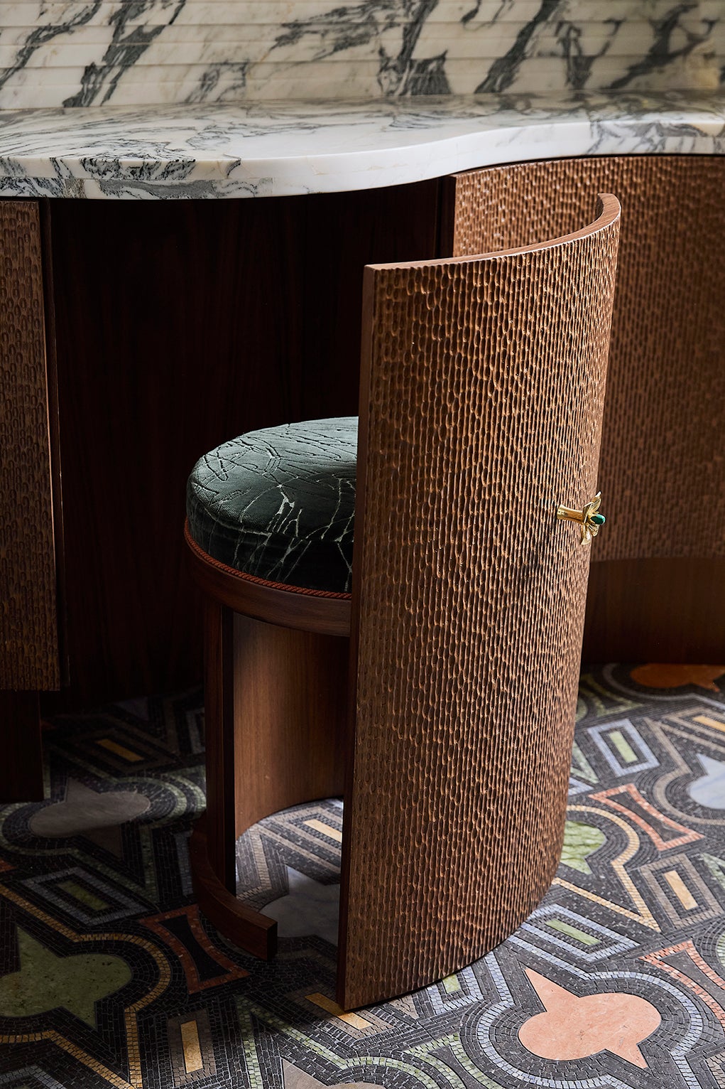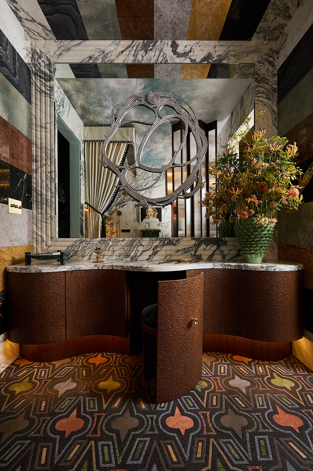 The debut of Artistic Tile’s Casino Royale mosaic anchors the design, complemented by Cipollino Verde marble, sculptural millwork, and a lime-green Kohler clawfoot tub framed with fabric and fringe. A Campana Brothers mirror and a personal portrait by Italian painter Francesco Clemente bring an artful dimension, while jewel-like brass hardware and layered lighting complete the atmosphere.