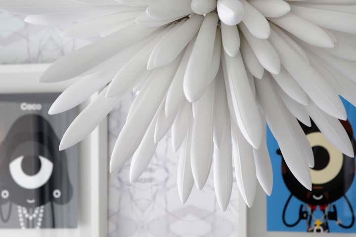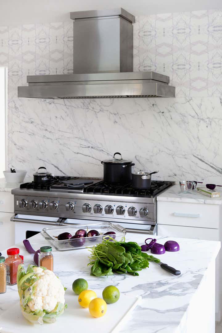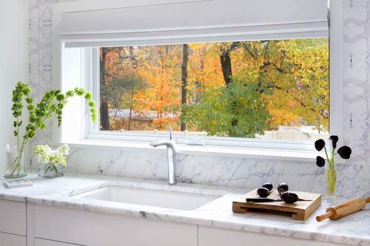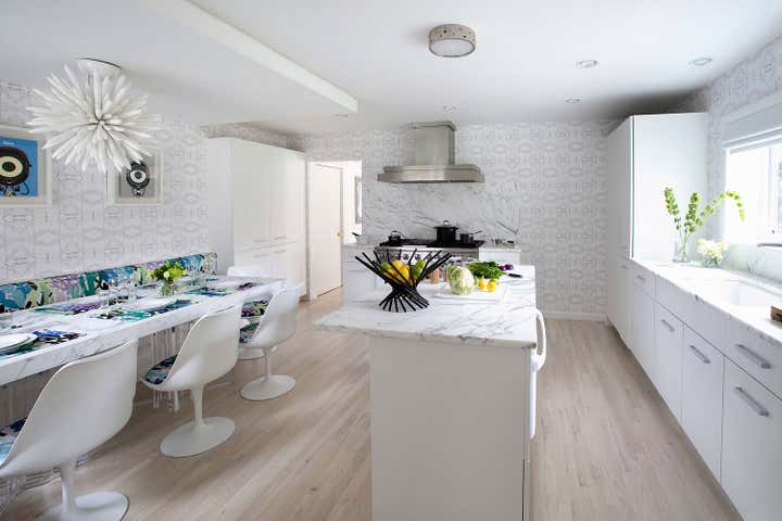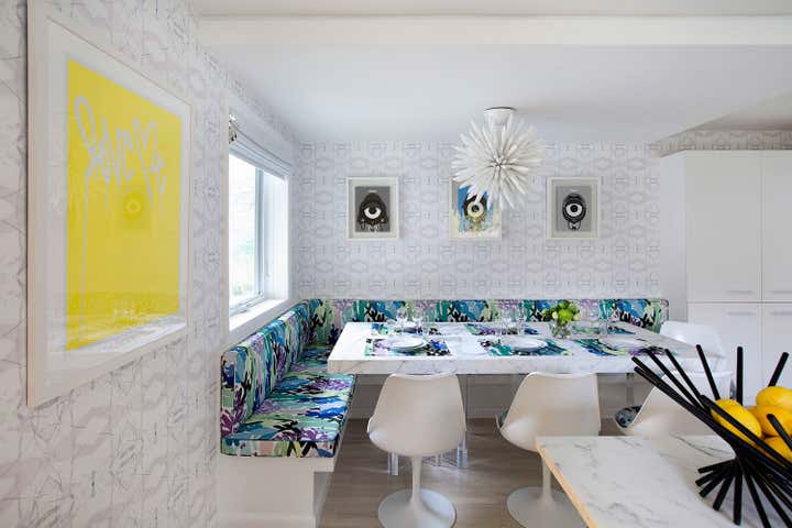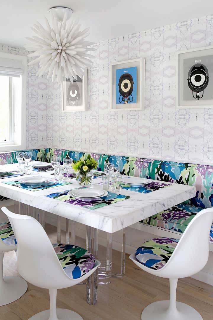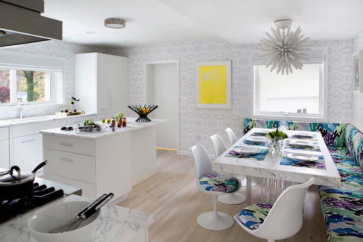 This is a contemporary, polished white kitchen with signature colors and textures that “come to be expected of a Fawn Galli interior.” There are a couple of great design elements in this small kitchen. The banquette chandelier is unglazed bone china which offers a really interesting and dynamic light. We dropped the ceiling over the banquette to hide some upstairs plumbing components, and treated it with a negative reveal at the ceiling to create an architectural detail.