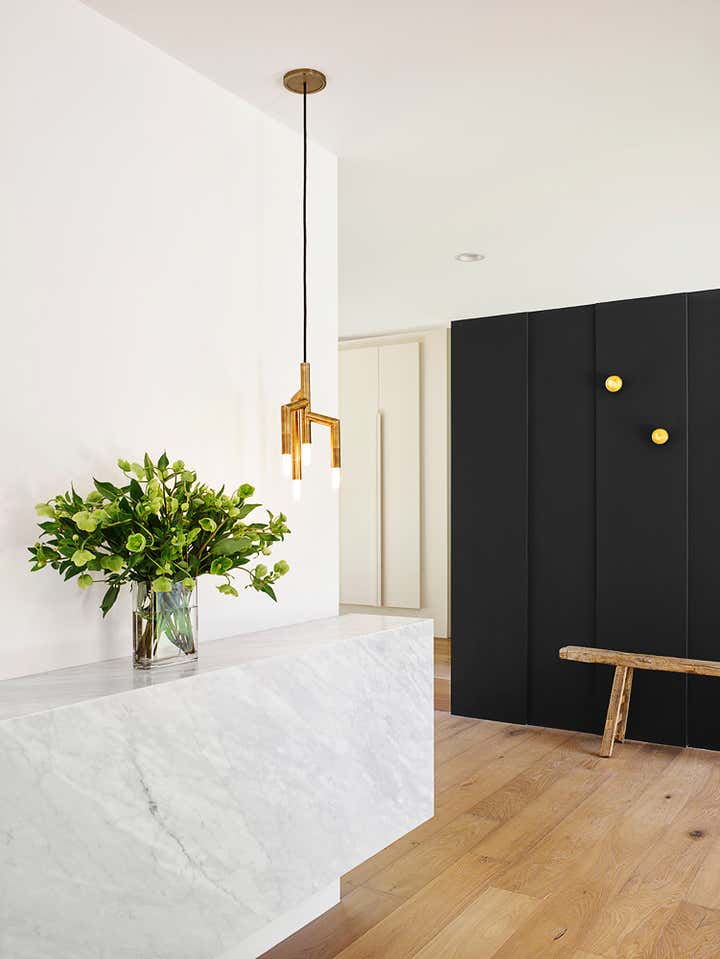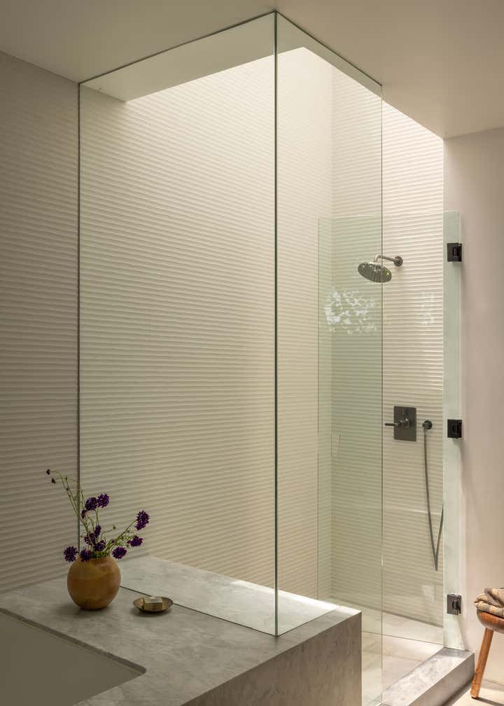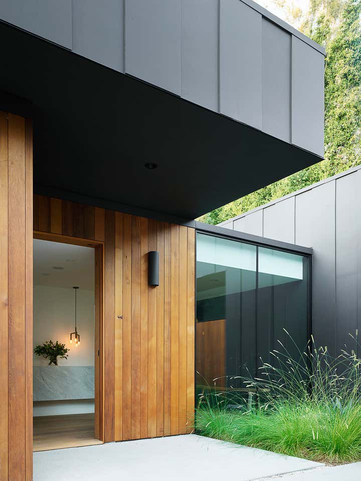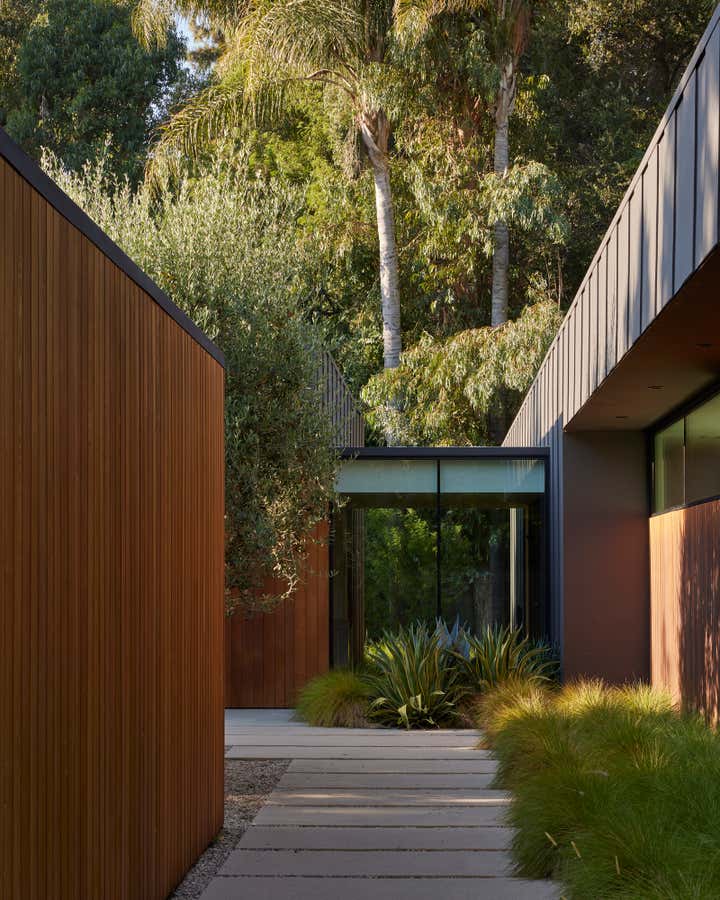 This serene Los Angeles residence comprises three pavilions connected by glass hallways, seamlessly integrating architecture, interiors, and landscape. The Western Red Cedar guest house and garage establish a datum line that connects the living and sleeping pavilions, featuring oversized charcoal-colored board, batten extira, and cement board siding, with deep overhangs for shade and solar heat reduction.