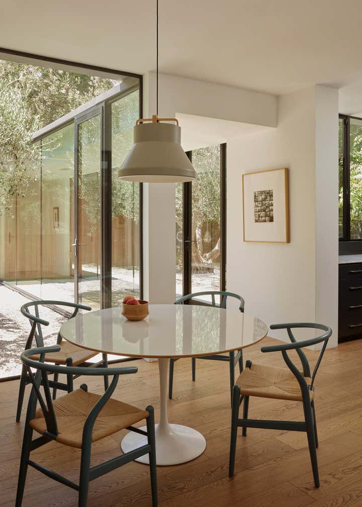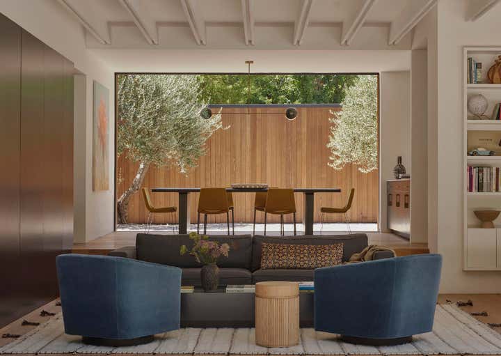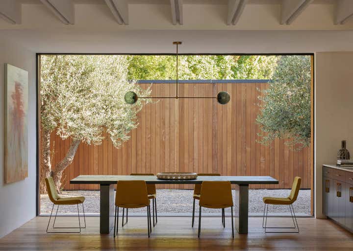 Inside, an open layout unites the kitchen, breakfast room, and family room, creating a harmonious flow ideal for entertaining. Expansive windows, skylights, and pocketing doors invite natural light and offer layered views of the landscape. The minimalist interior, with wooden floors and marble countertops, reflects warmth and sophistication.